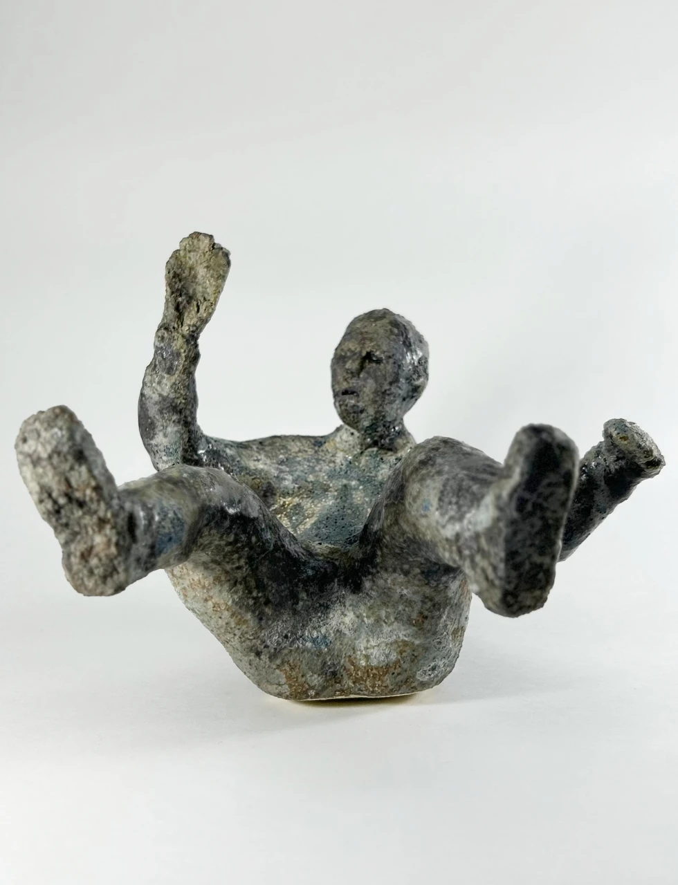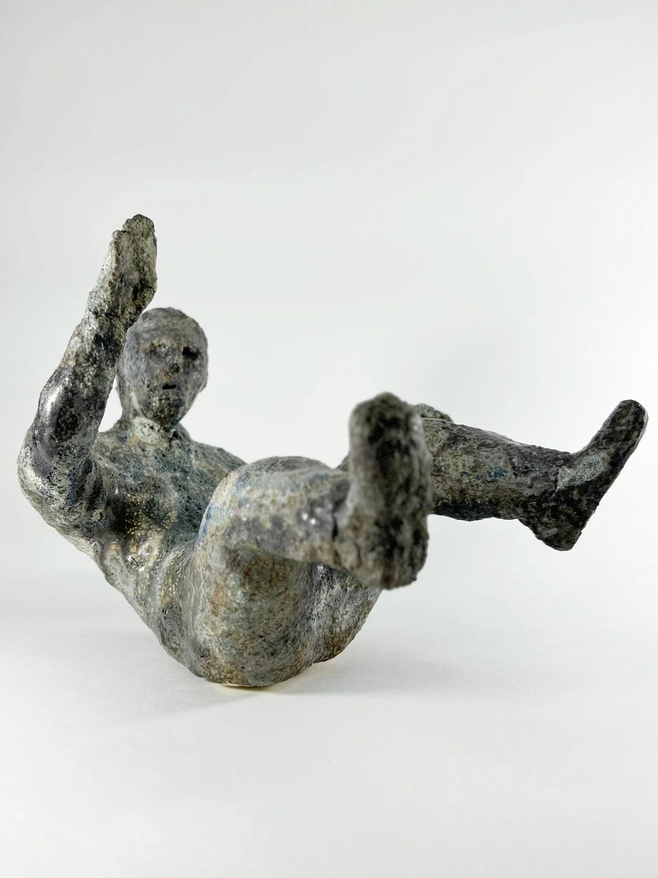 «История сокрушительного падения» запечатлевает момент столкновения человеческой фигуры с реальностью, исследуя темы краха, уязвимости и утраты контроля. Пластичность в сочетании с грубой фактурой, имитирующей бетон и природный камень, создает напряжение между физической формой и абстрактной идеей краха.