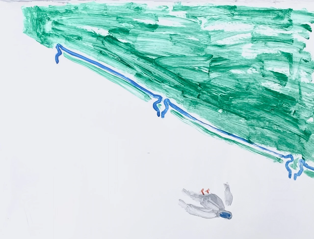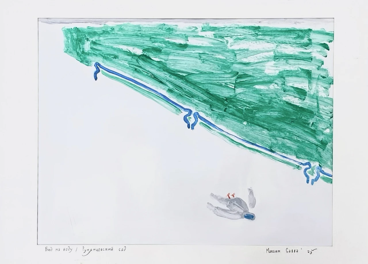 Работа «Вид на воду» — это авторская графика, выполненная акрилом на бумаге. Композиция отличается выразительной игрой цвета и формы: верхнюю часть листа занимают динамичные, широкие мазки насыщенного зеленого цвета, создающие ощущение водной поверхности или природного ландшафта. Их текстура и энергия контрастируют с четкой, извилистой синей линией, которая символизирует берег или течение, добавляя работе глубину и ритм. Пространство листа, оставленное белым, подчеркивает минималистичность и фокусирует внимание на основных элементах.