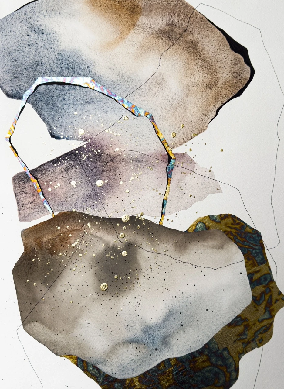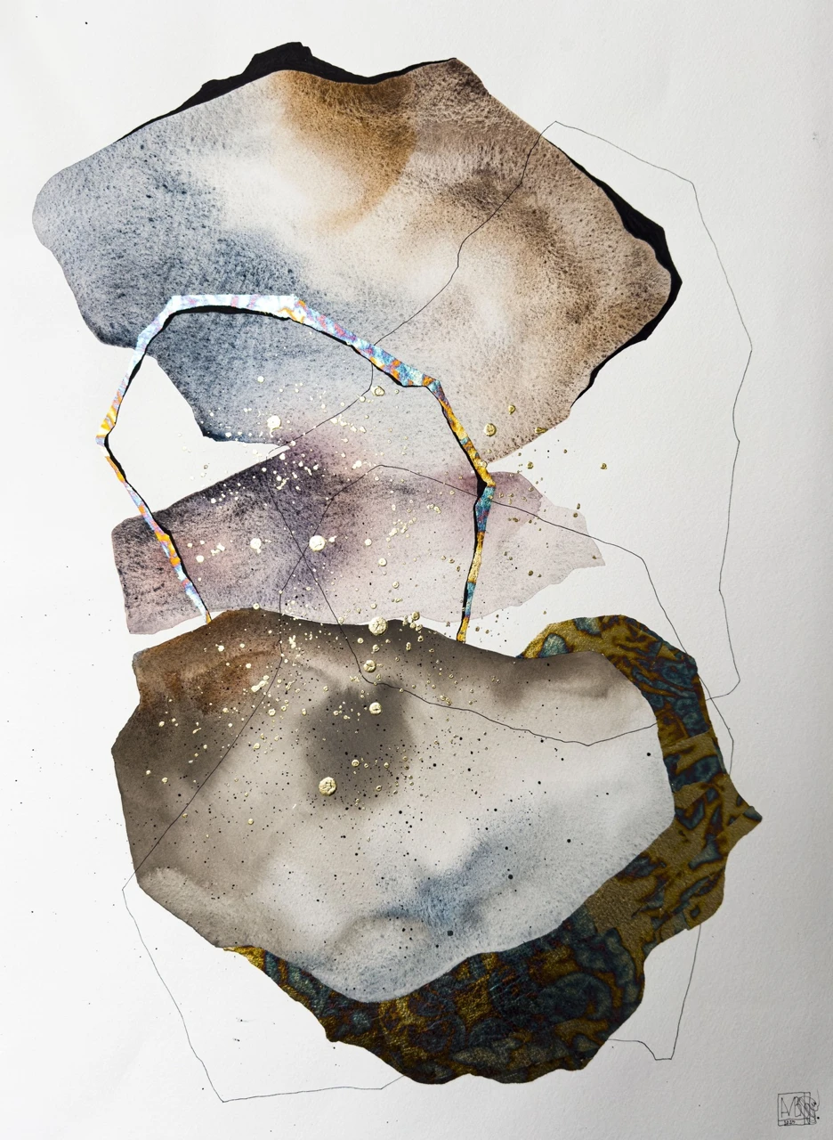 Фрагменты цвета наложены слоями, словно пласты опыта: тёплые землистые оттенки соединяются с холодными серо-голубыми, как память о колебаниях между сомнением и тихой уверенностью. Трещины между формами не разрушают композицию — они подчеркивают напряжение, необходимое для формирования внутренней оси. Мерцающая поталь вплетена в линии разломов, как сияние внезапного понимания, которое не приходит извне, а рождается в самом напряжённом месте внутреннего раскола. Айолит здесь — не стабильность, а процесс навигации; не найденная истина, а путь, который можно почувствовать только в движении.