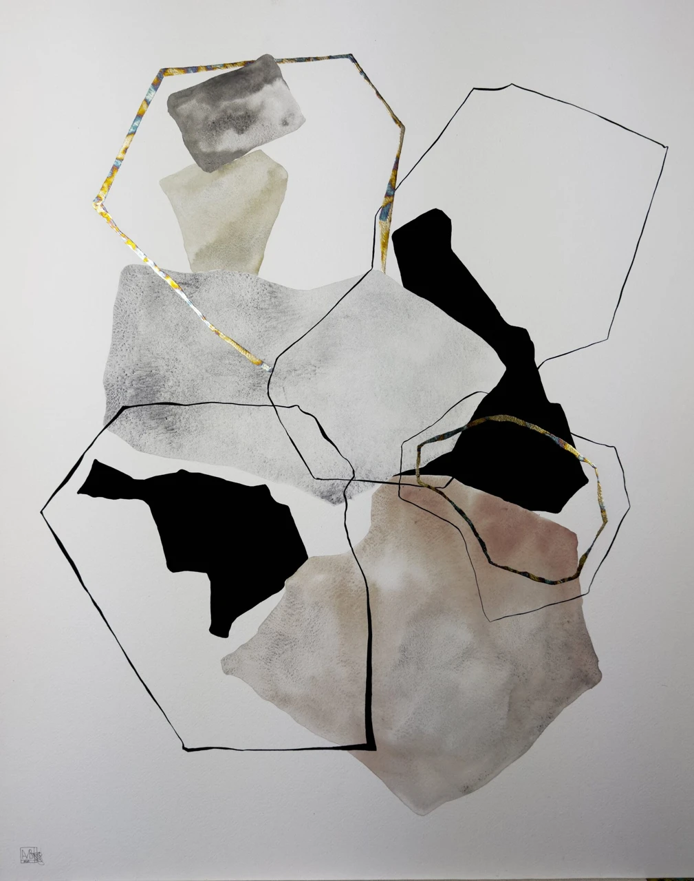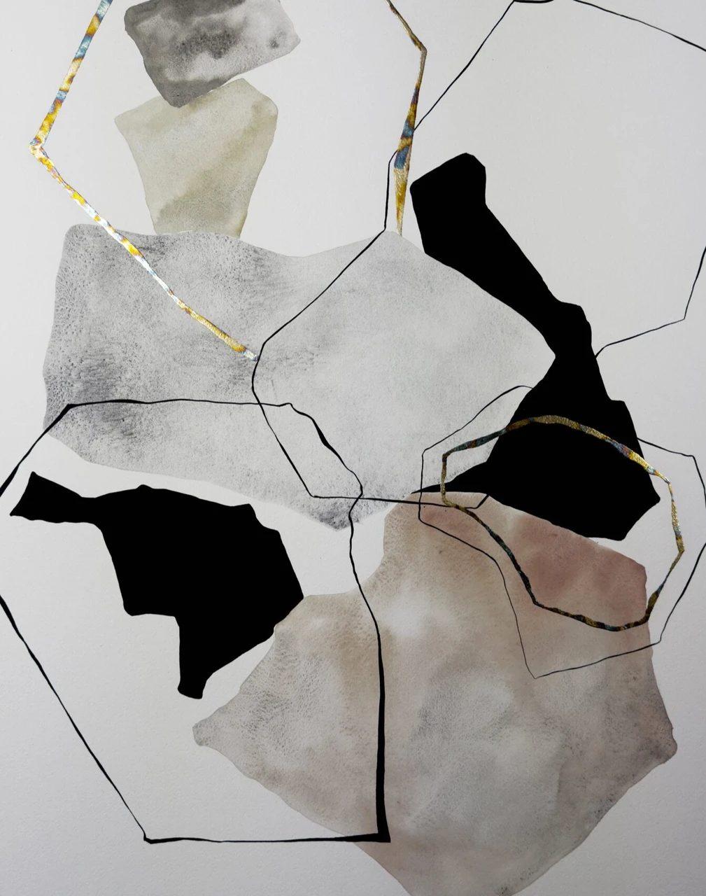 Арканзасит — редкий минерал с неоднородной структурой, в котором плотные фрагменты чередуются с пустотами. Его воспринимают как камень, несущий в себе напряжение: Он будто помнит то давление, под которым возник, и хранит его в собственной разнородности. В этой работе каждая форма — как участок внутренней породы, несущий разные состояния. Тёмные зоны — это полости молчания, места невысказанного, где смысл отсутствует не из-за пустоты, а из-за сдержанности. Светлые, зернистые структуры выглядят как участки, уже прошедшие стадию кристаллизации — они удерживают опыт, не растворяясь. Бежевые области — мягкая часть, всё ещё доступная изменению, ещё не окончательно окаменевшая. Золотистые и бирюзовые контуры — включения того, что придало ценность, возможно, моральная точка опоры, философское прозрение, чужая поддержка или собственное решение. Тонкие линии напоминают тектонические разломы — следы того, как внутреннее «я» вынуждено было меняться под воздействием напряжений. Арканзасит в геологии ценят не за идеальную чистоту, а за способность показывать становление камня как историю борьбы вещества с самим собой. А философском смысле этот камень говорит: цельность может быть неоднородной, и завершённость не исключает сложность происхождения.