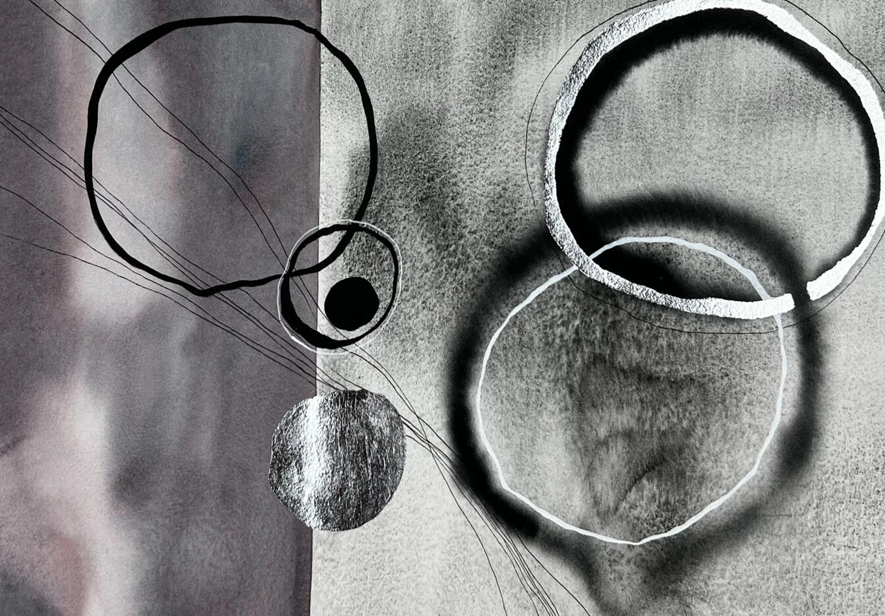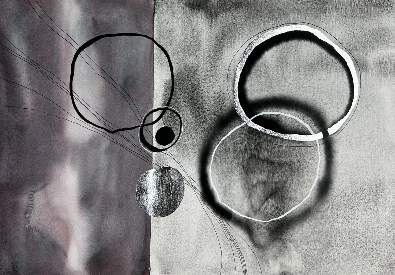 Левая часть мягко расплывается, похожая на смутное воспоминание или тишину после разговора. правая — более структурная, но не дисциплинированная: формы растворяются, как следы мысли, ещё не решившей, станет ли она словом. Круги — это не геометрия, а эхо взаимодействия. Большой круг — как поле другого человека, средний — поле собственного переживания, маленький — точка боли, сомнения, импульса. Они не соприкасаются, но живут в одной вибрации, соединённые тонкими нитями линий — нервных окончаний, траекторий взгляда, маршрутов внимания. Серебристые фрагменты работают как световые остатки — след присутствия, который словно стёрт, но всё ещё ощутим. Композиция №8 — это не сюжет, а состояние: когда между «я» и «другим» остаётся расстояние, но оно не разрывает связь, а делает её призрачной, ослабленной, но всё ещё существующей. В этой полутени присутствия и отсутствия рождается ощущение одиночества не как пустоты, а как акустического простора, где слышно, как форма думает, прежде чем заговорить.