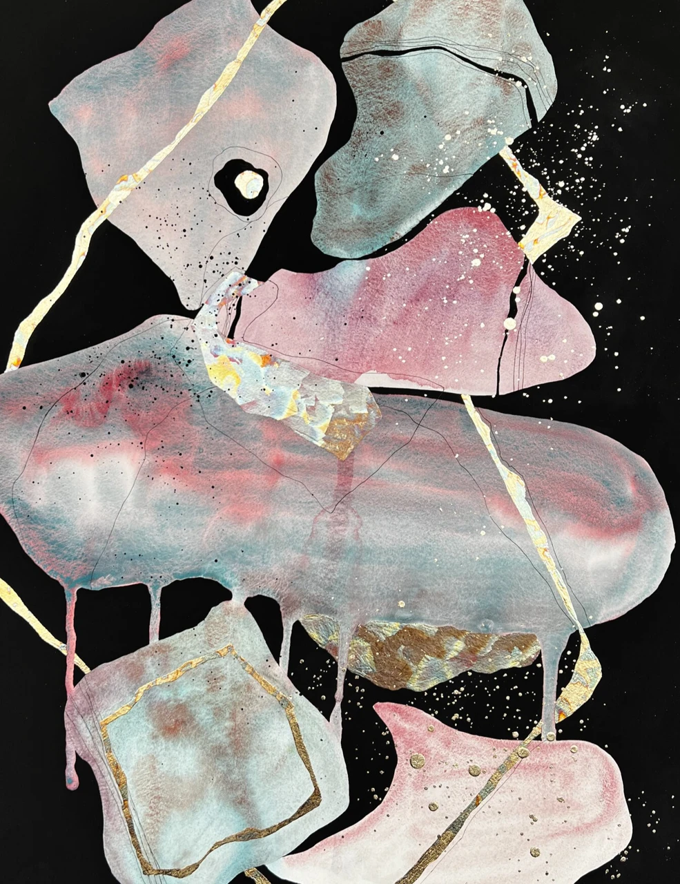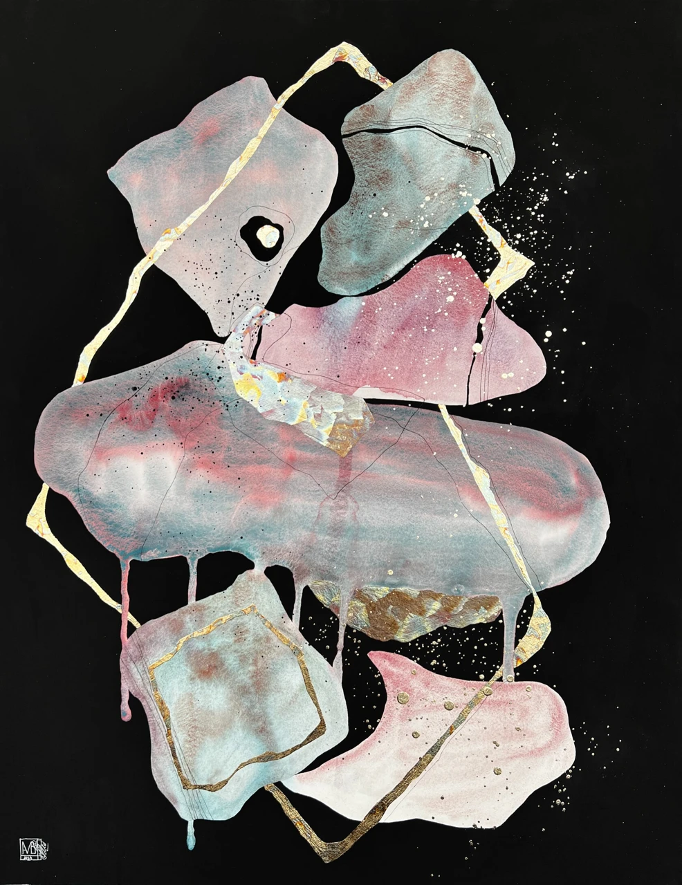 На этой работе акрил ведёт себя не как пигмент, а как свидетель. Светлые переливы — как люминесценция воспоминаний, которые долго оставались невидимыми, пока что-то не спровоцировало их проявление. Такие моменты философы называли «истиной, схлопывающейся в момент узнавания» (см. хайдеггер: aletheia — «снятая сокрытость»).