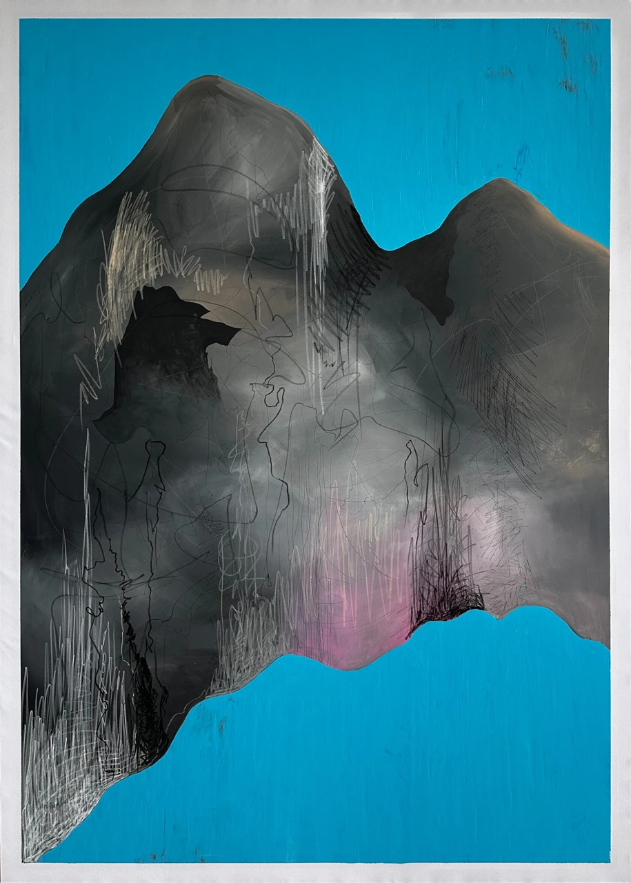 Здесь чужое влияние не вспышка эмоции, а тяжесть, которая ложится на внутреннее поле не как импульс, а как вес. Эта форма — не кто-то конкретный, а сумма ожиданий, обязательств, взглядов, в которых ты уже не просто реагируешь — ты несёшь. Серо-графитовая масса выглядит как нечто, что выросло сверху и давит вниз. В ней — множество наслаивающихся линий: голоса, напоминания, тонкие наплывы «ты должна», «ты уже в этом», «ты не можешь уйти». Но внутри этой суммарной формы иногда можно различить силуэты — фигуры людей, которые встраиваются в массу, как будто каждый добавил свой штрих, свой слой давления, свой контур влияния. И при этом она не разрушает поле — синий фон остаётся ясным, открытым, свободным. Ответственность не уничтожает твою основу, но накрывает её так, что становится невозможным игнорировать чужие присутствия. Под этим грузом есть розоватый отсвет — некое внутреннее тепло, которое ещё пытается сохранить живость, память о себе лёгкой. Это не вина и не страх. Это состояние, в котором ты чувствуешь: теперь здесь я — опорная точка для других. И даже если ты не просила об этом, ты уже внутри роли, которая держит.
