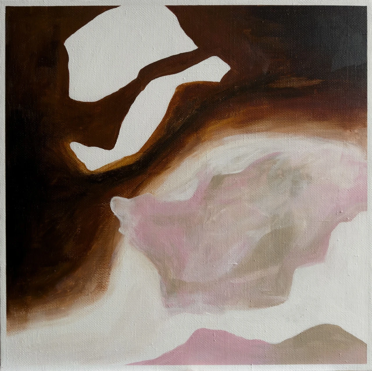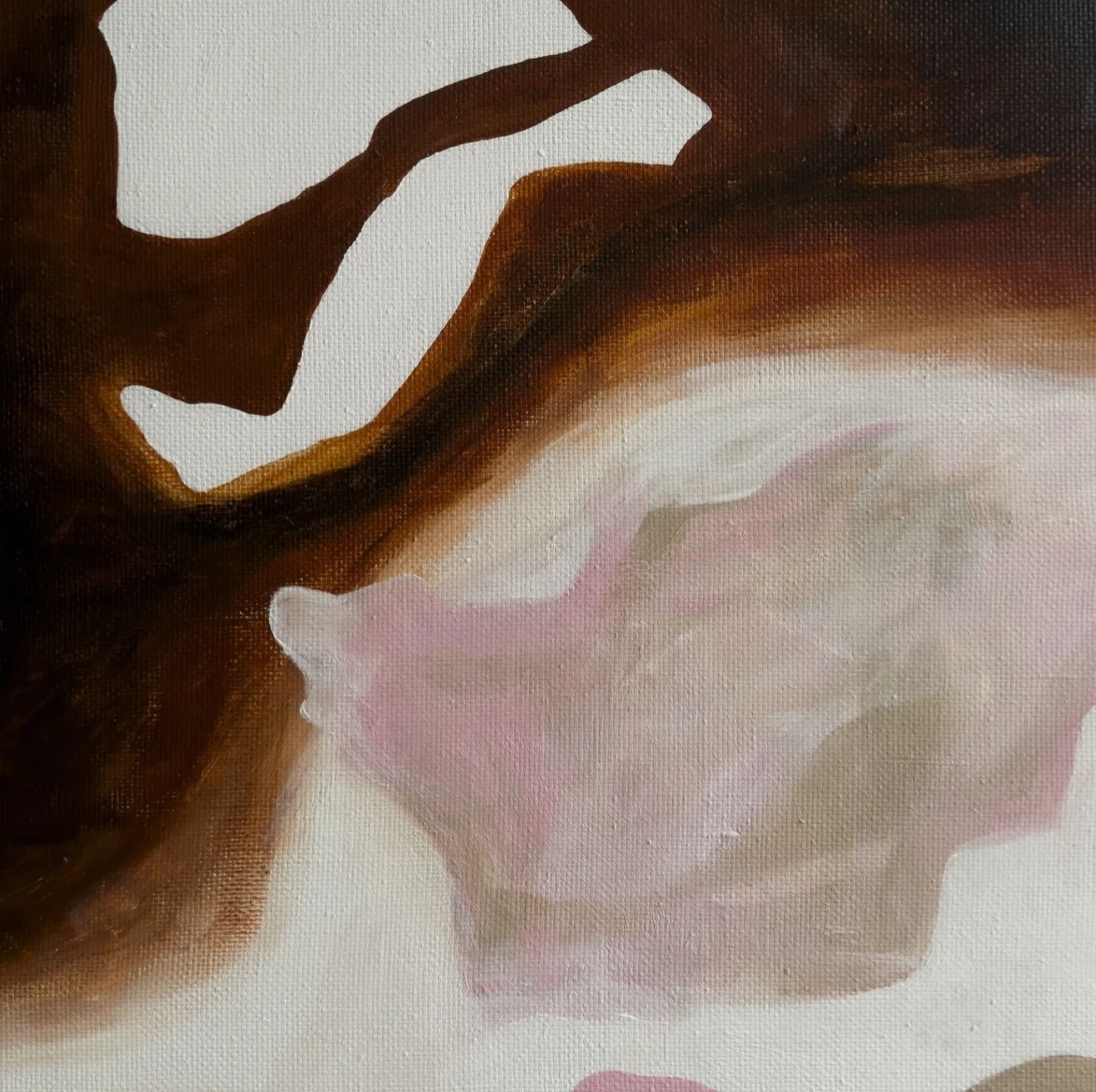 Сверху — плотная, густая, почти вязкая тьма, как тяжесть чужого взгляда, чьё-то суждение или внутренний долг, который давит без объяснения. Снизу — мягкое, размытое, розово-белое состояние, похожее на попытку сохранить уязвимость, не сломать в себе нежное, не перестать чувствовать. Граница между ними — не линия, а горение. Область, где происходит перемалывание внутреннего опыта в нечто длительное — возможно, в судьбу.