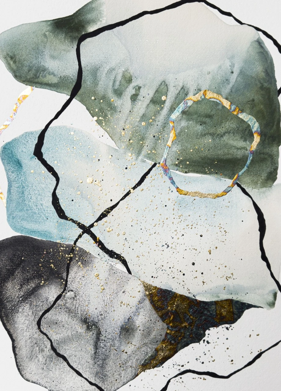 Разломы прорисованы не как травмы, а как пути раскрытия — трещины, в которые попадает свет. Поталь, едва заметно мерцающая в глубине формы, указывает на то, что внутреннее равновесие — это не отсутствие переломов, а умение светить через них.