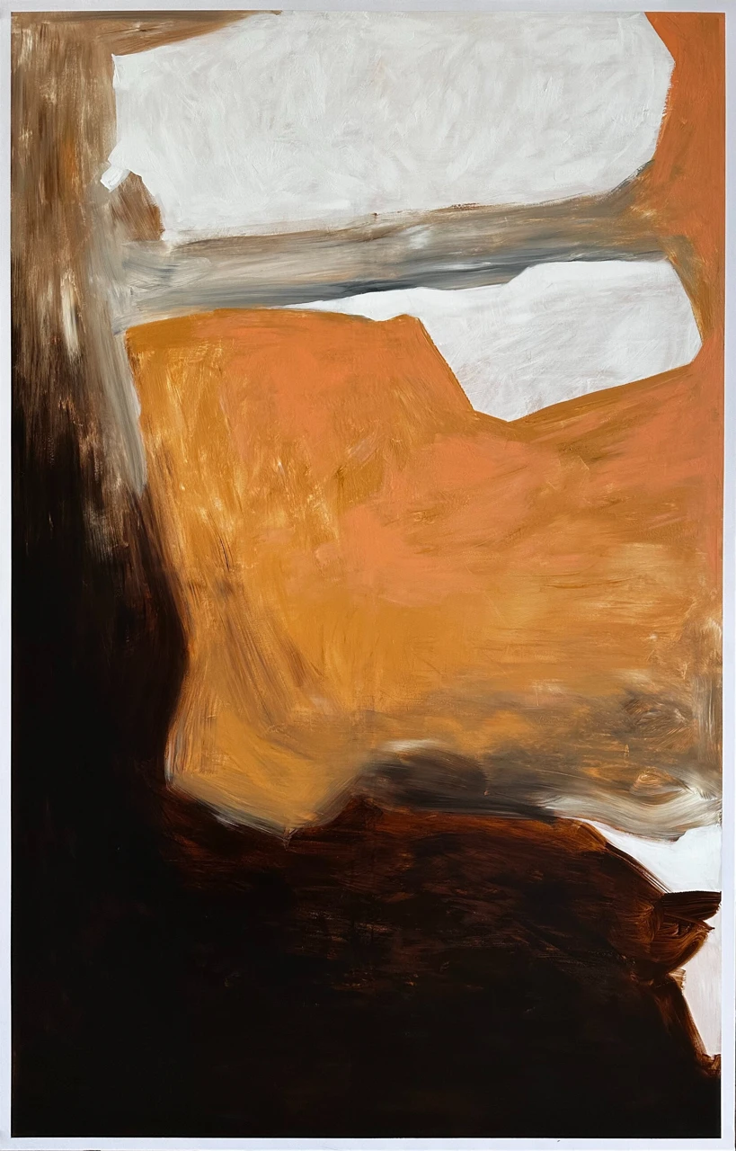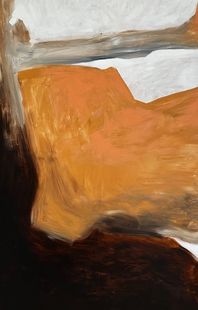 Здесь есть движение сверху вниз: светлое и неопределённое стремится застыть, обрести форму. Оранжево-земляной слой — как горячее внутреннее состояние, которое долго оставалось подвижным и неоформленным, но теперь его начинают удерживать, структурировать, «фиксировать».