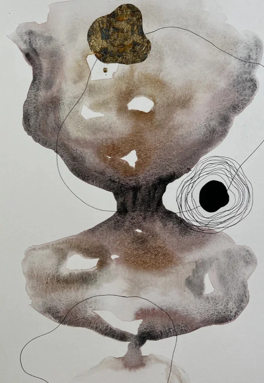 Форма здесь напоминает искаженную фигуру, как будто «я» пытается удержать себя в целостности, но внутри возникают отверстия — пустоты, в которых отсутствующее вдруг становится заметным. это не просто прошлое, это отсутствующее настоящее.