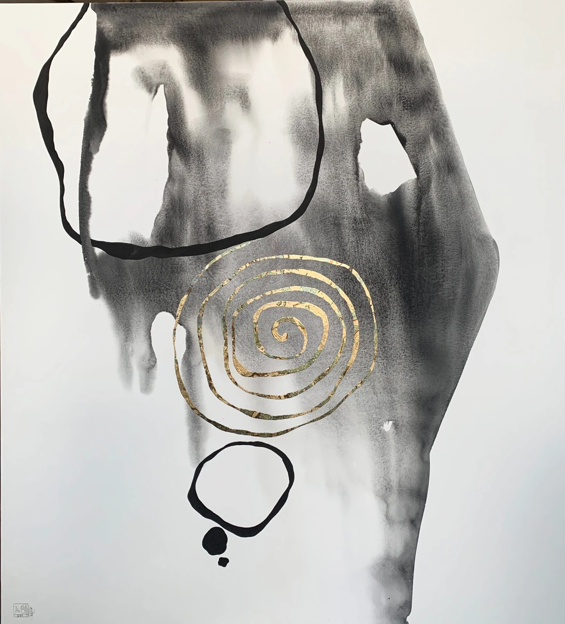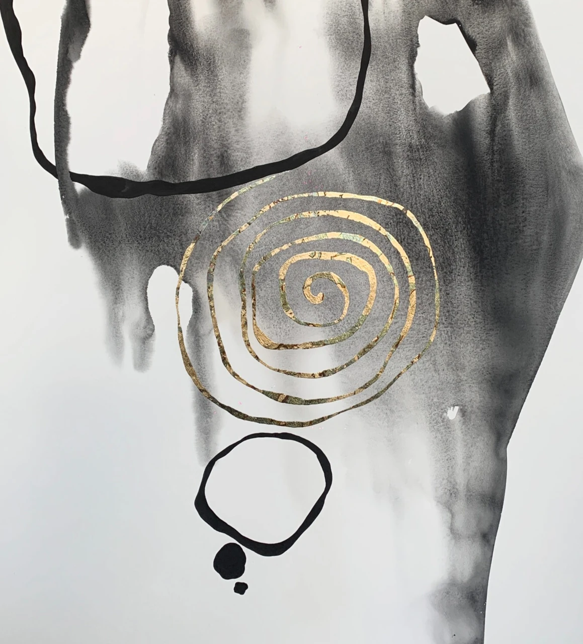 Серые размывы — это пространство до-концептуального: то, что ещё не приняло чёткую форму мысли. Текущее, неустойчивое состояние, где идея только начинает самоорганизовываться. Чёрные контуры — фиксации внимания, попытки удержаться в процессе мышления. Круги внизу — как следы уплотнения сознания, точка кристаллизации мысли, из которой и начинает сворачиваться спираль. Золото — это момент внутреннего озарения: та точка, где аморфное вдруг получает структуру.