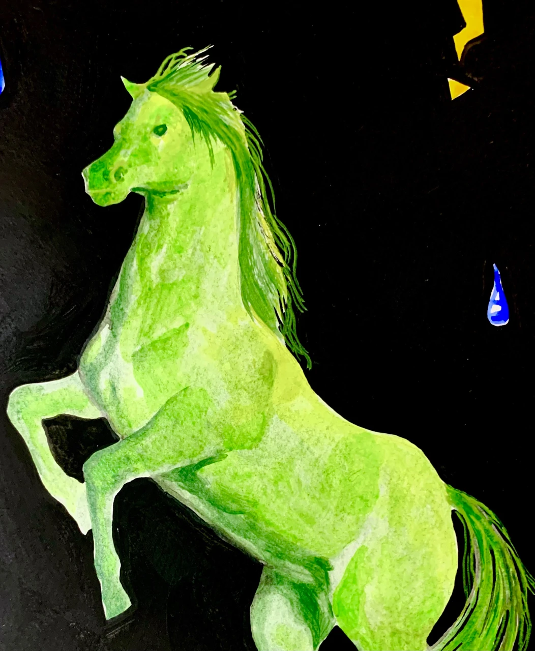 Работа выполнена на плотной акварельной бумаге, чёрный фон сделан при помощи акрила, который придаёт ощущение легкого глянца, остальные элементы написаны акварелью. Работа не оформлена.
