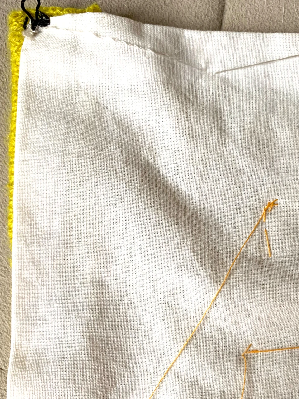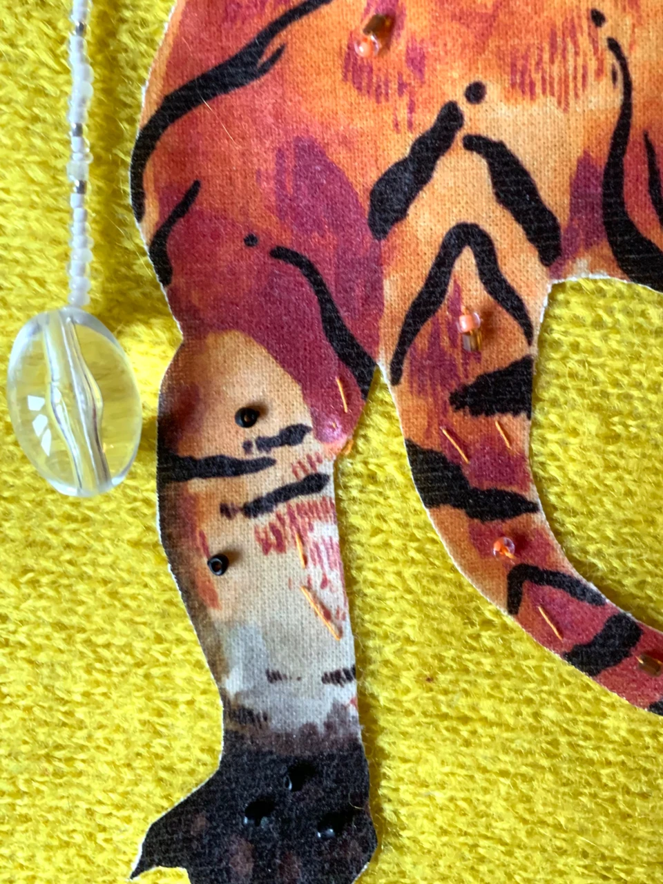 Работа выполнена на основе из вязаного акрила с использованием вышивки бисером и бусинами, аппликация выполнена в технике термопереноса на основе из хлопка. Задняя сторона выполнена из хлопка, крепится коллаж при помощи крючков.