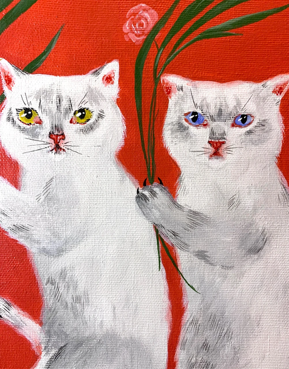 Работа на холсте, натянутом на подрамник, выполнена акриловой краской, которая придаёт работе некоторый глянец. В раму работа не оформлена, но края прокрашены цветом фона (оттенком красного).
