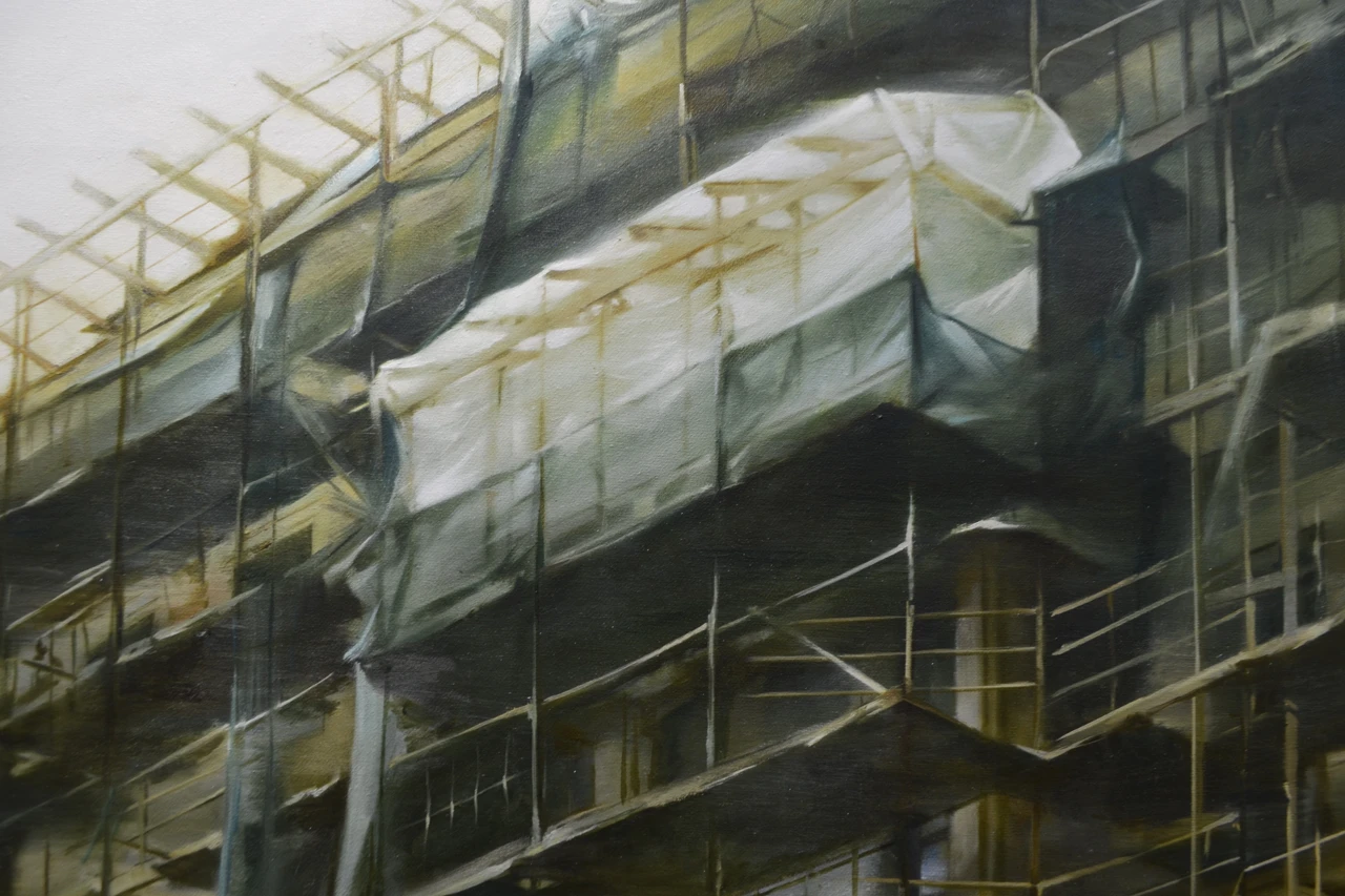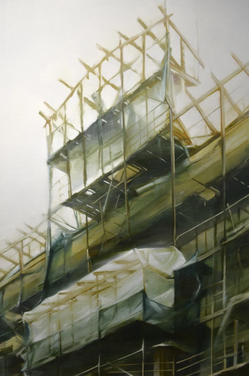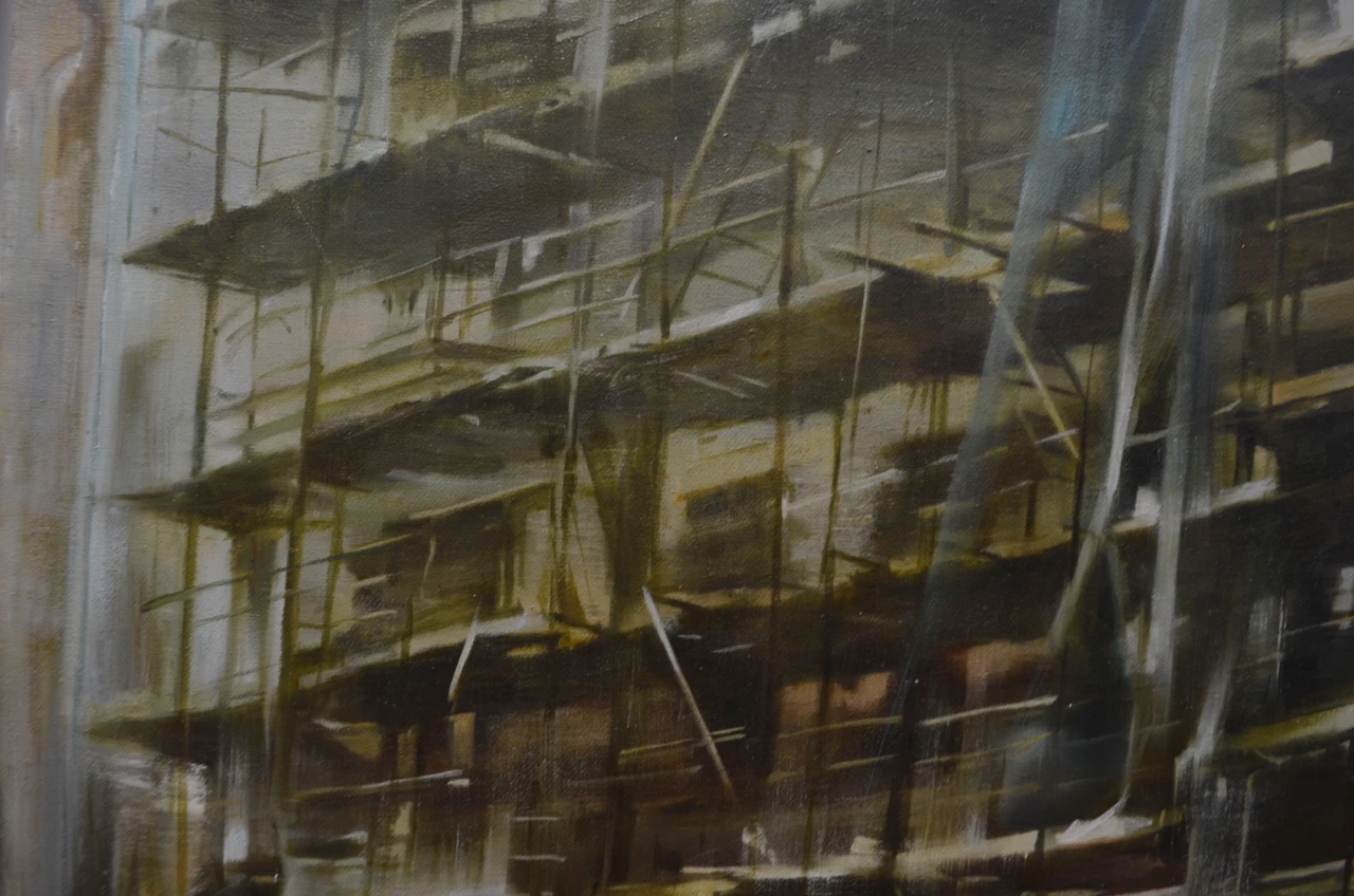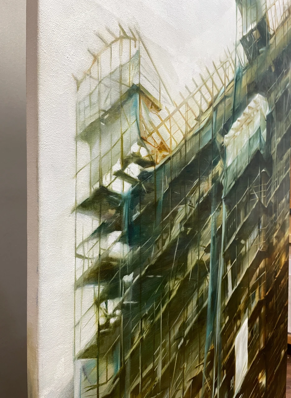 Строительные леса давно в моих картинах, но именно в этой работе я достигла такой тонкой детализации! Хотелось создать ощущение что всё здесь построено чуть ли не из спичек и зубочисток, а держится только на силе воли