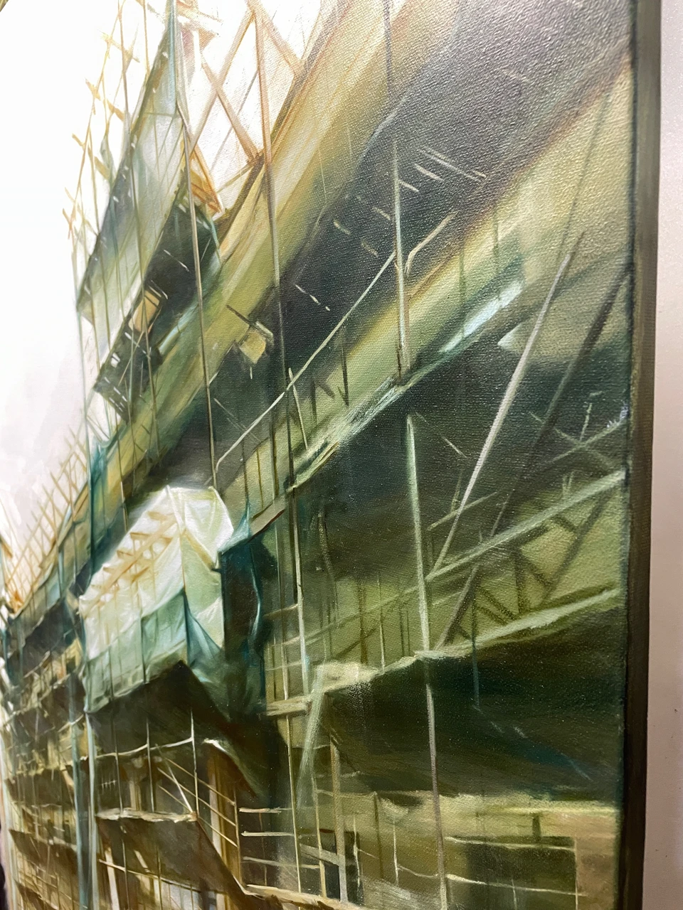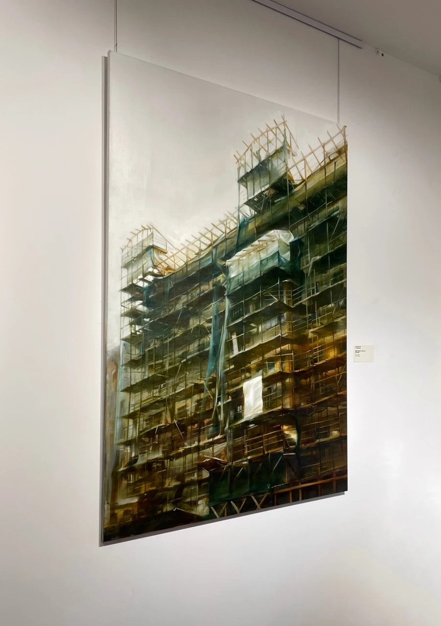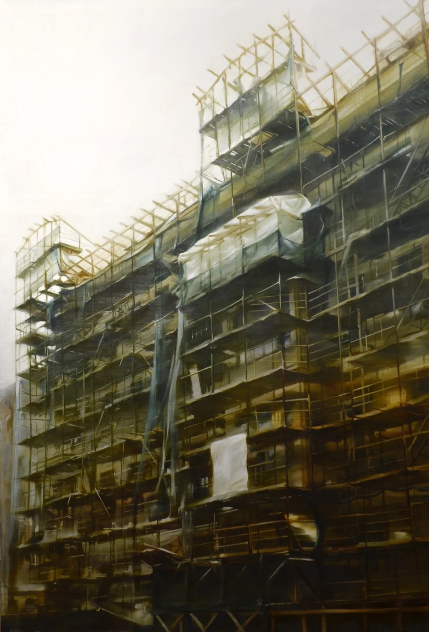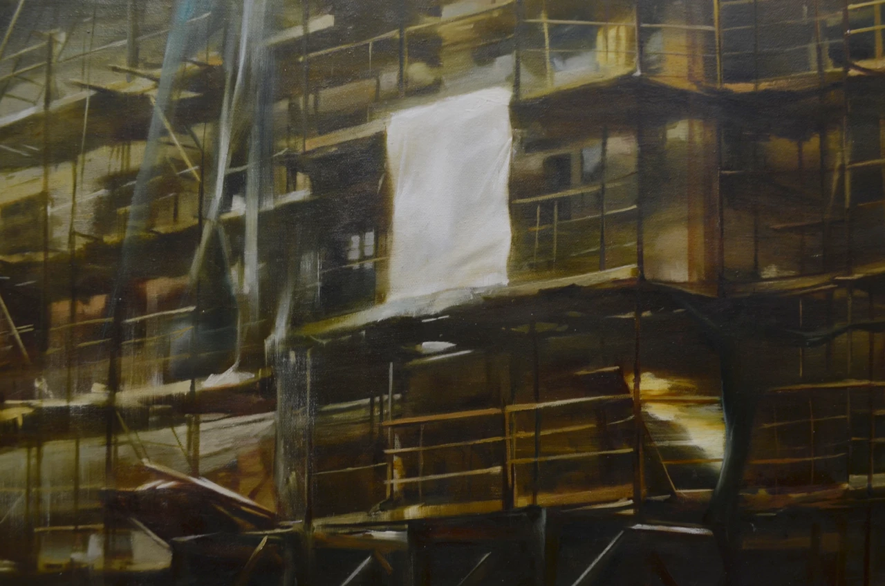 Строительные леса давно в моих картинах, но именно в этой работе я достигла такой тонкой детализации! Хотелось создать ощущение что всё здесь построено чуть ли не из спичек и зубочисток, а держится только на силе воли