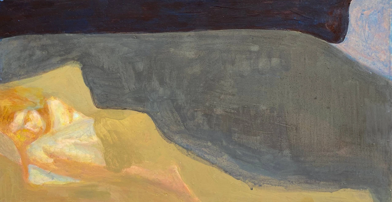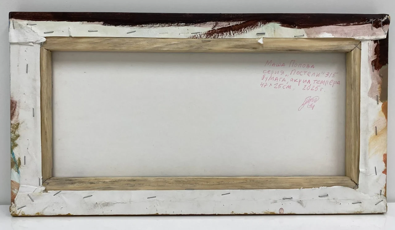 Композиция сосредоточена на изображении спящей фигуры, чьи очертания угадываются в мягких, теплых тонах. Глубокий синий и темно-коричневый создают ощущение глубины и покоя, в то время как охристые и телесные оттенки передают нежность и уязвимость спящего человека. Серые и приглушенные тона служат переходом, объединяя эти элементы. Текстура работы, созданная мазками акрила и темперы, придает изображению тактильность и глубину.