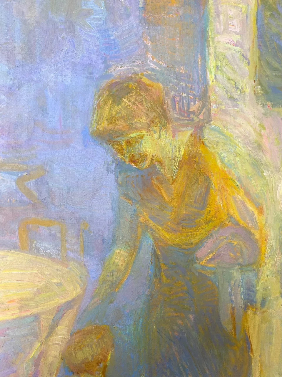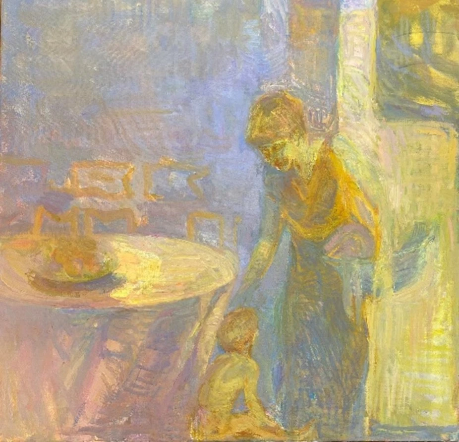 Преобладают теплые, золотистые оттенки, создавая ощущение мягкого, рассеянного света, что соответствует названию произведения. Гармоничный колорит работы, с преобладанием желтых, охристых и пастельных тонов, придает изображению нежность и интимность. Художница использует импрессионистическую манеру письма, с видимыми мазками, которые передают текстуру и глубину. Фигуры представлены обобщенно, с акцентом на их силуэты и игру света на поверхностях. Фон работы размыт, с намеками на мебель и пространство, что позволяет сосредоточить внимание на взаимодействии персонажей.