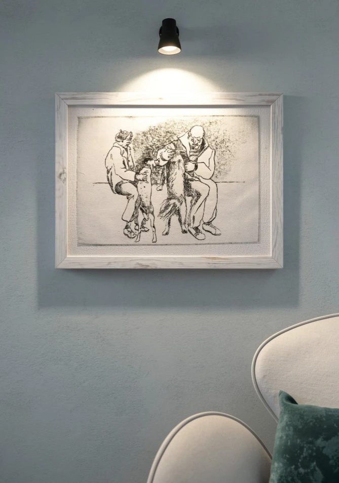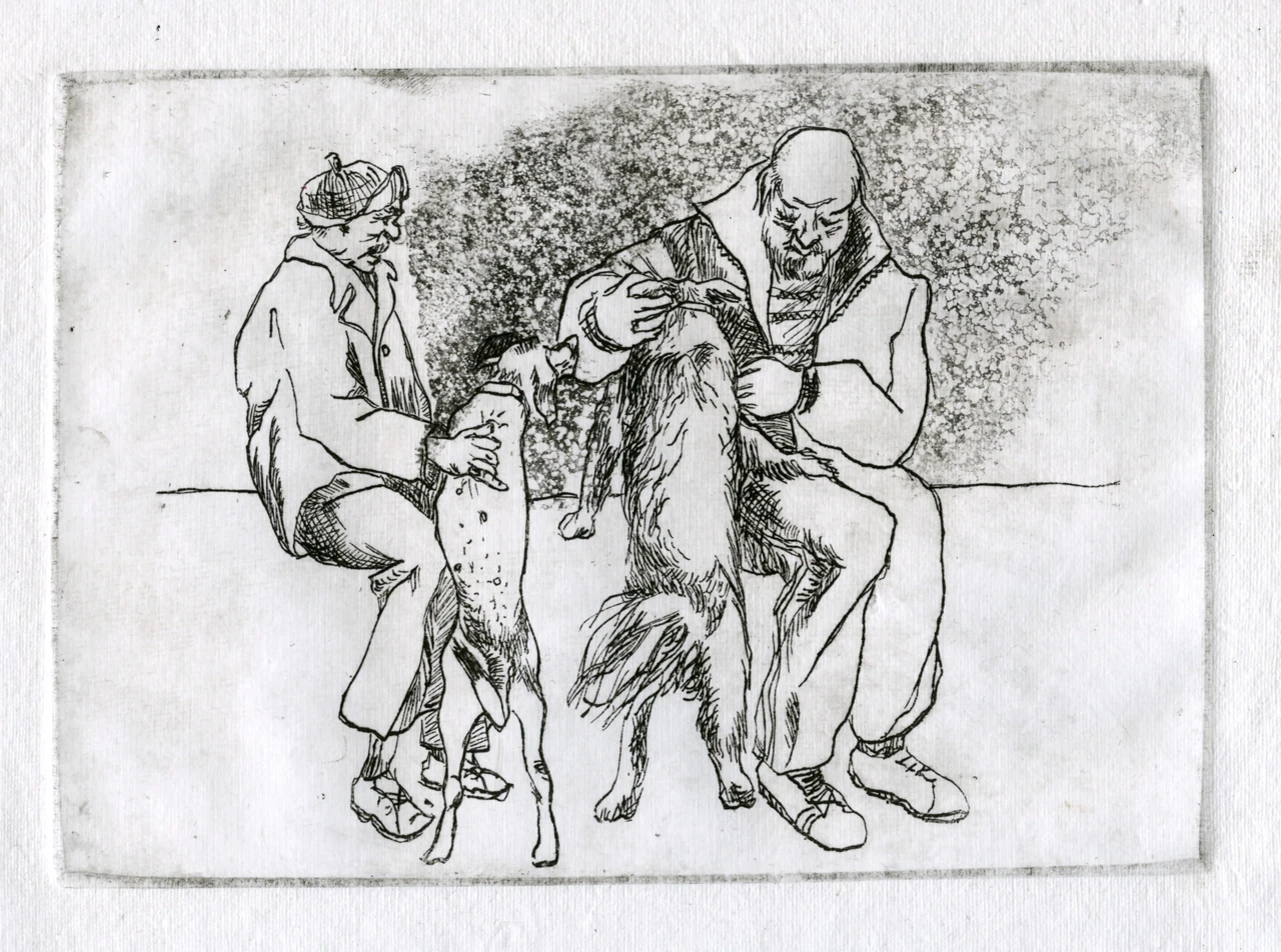 Офорт на цинковой пластине с акватинтой и травлёным штрихом. Бумага ручного литья с неровным краем — каждый оттиск чуть отличается от соседнего.
