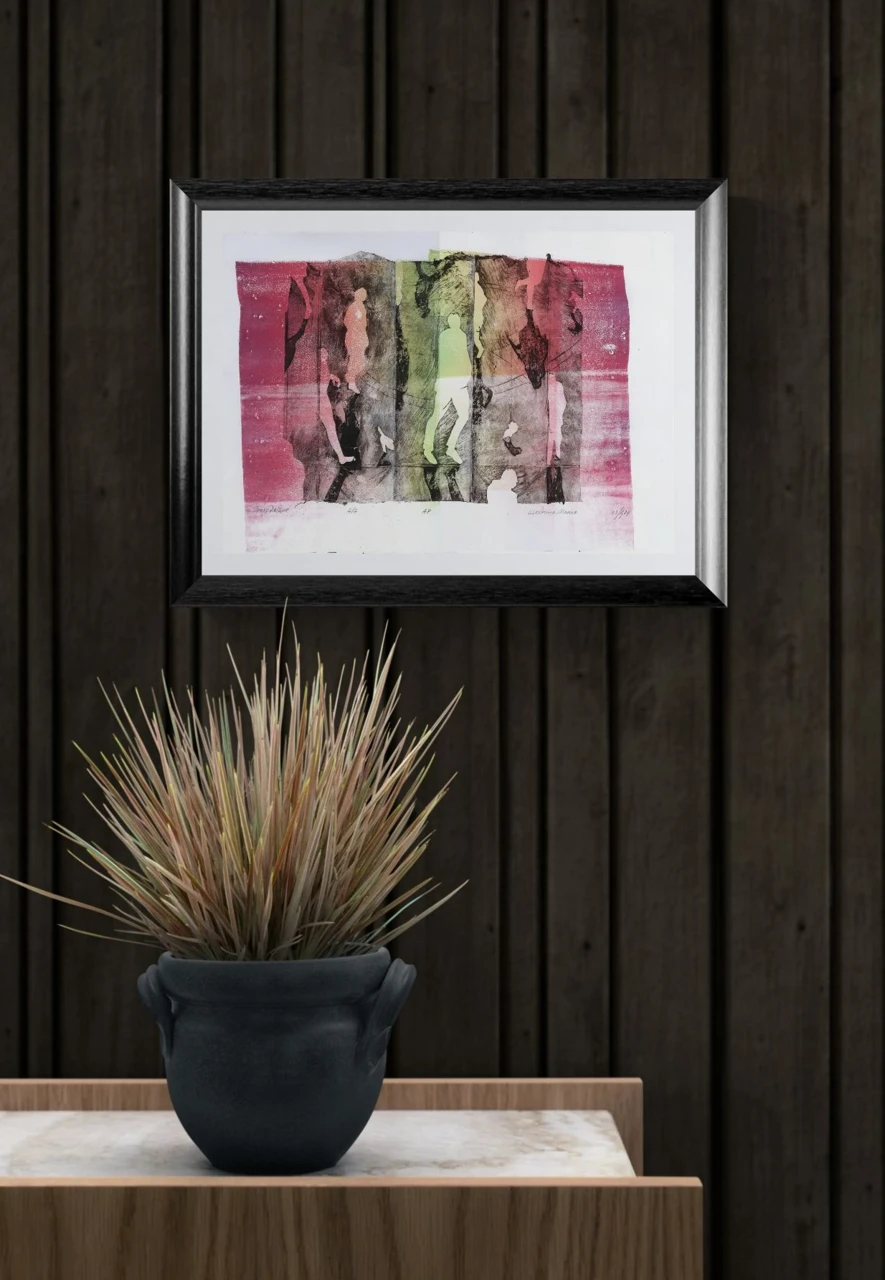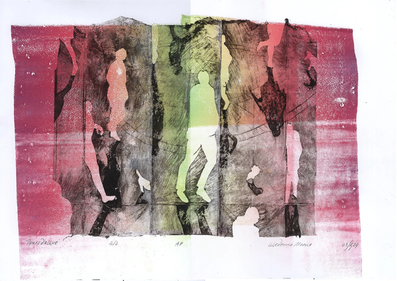 В «Проходящих» я совместила несколько техник, экспериментируя с формой и материалом: использовала валик для накатывания растяжки водной краски, гравюру типографской краской на тетра-паке и аккуратно дополнила детали масляными карандашами. Работа выполнена на белоснежной графической бумаге Bristol, без замачивания, что создаёт уникальную фактуру и позволяет каждому оттиску быть непохожим на другой — именно таков мой творческий путь, свободный от рутины.