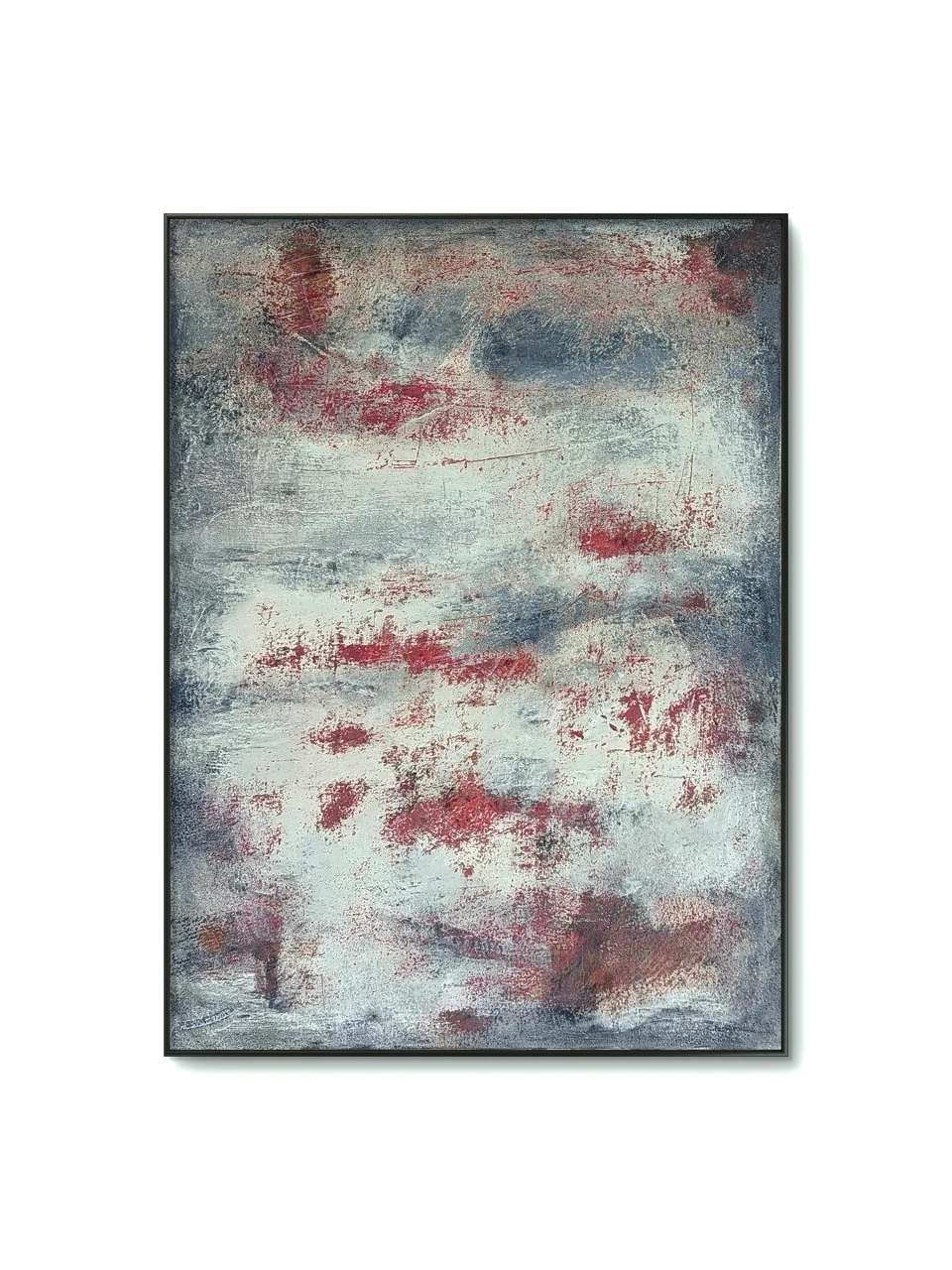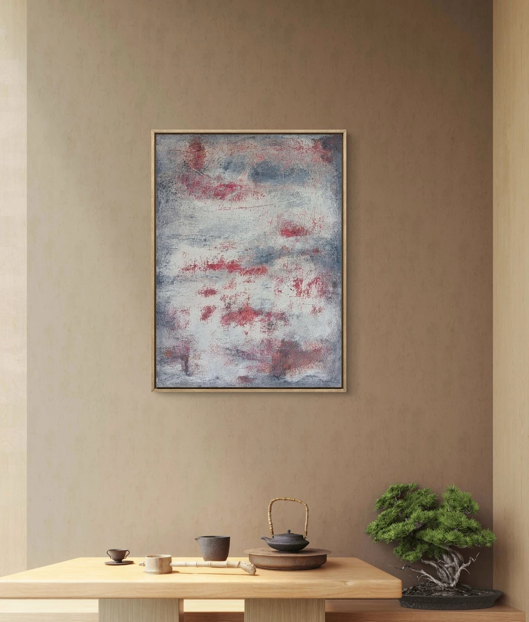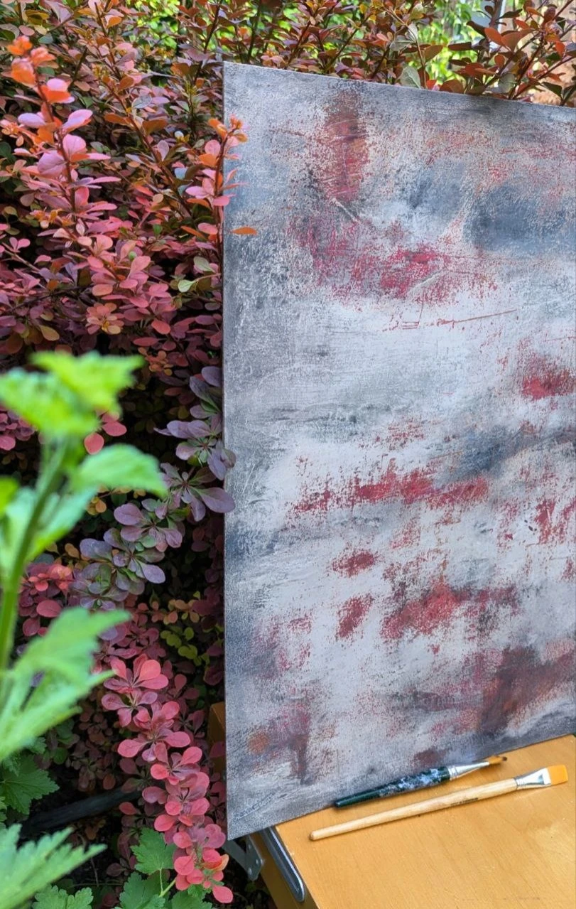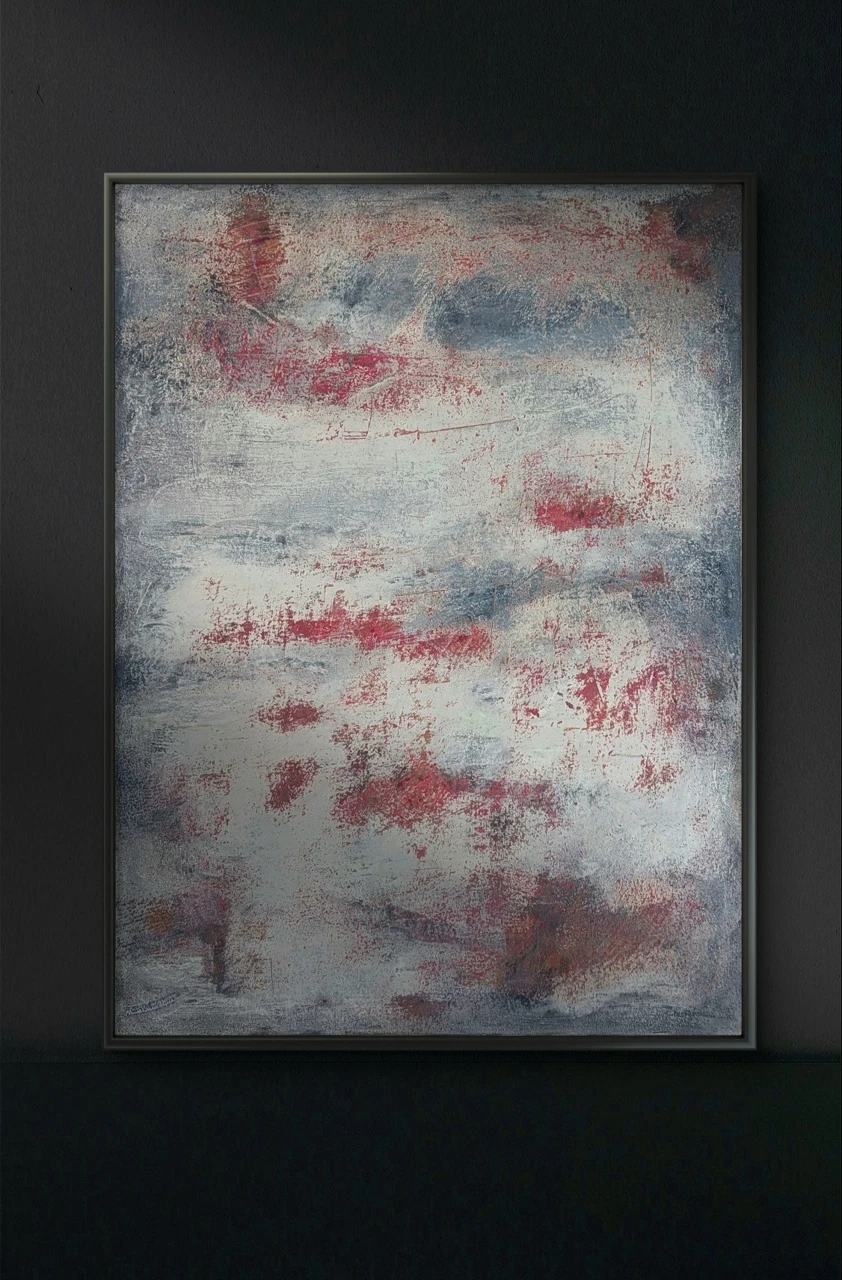 Абстрактный пейзаж в оттенках рассветного утра. Холодные тени, красные лучи и проблески света переливаются и создают эффект воздушной перспективы.