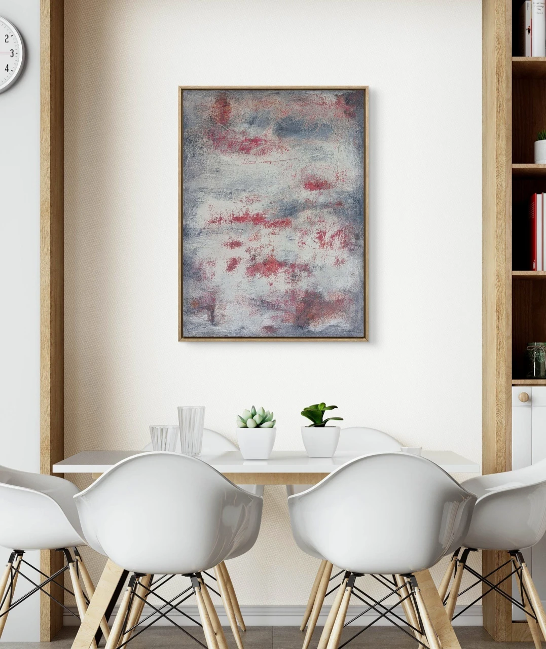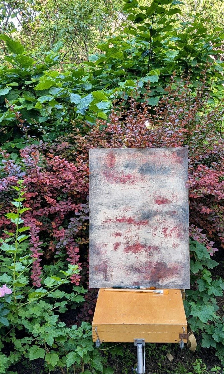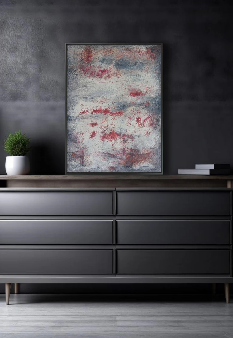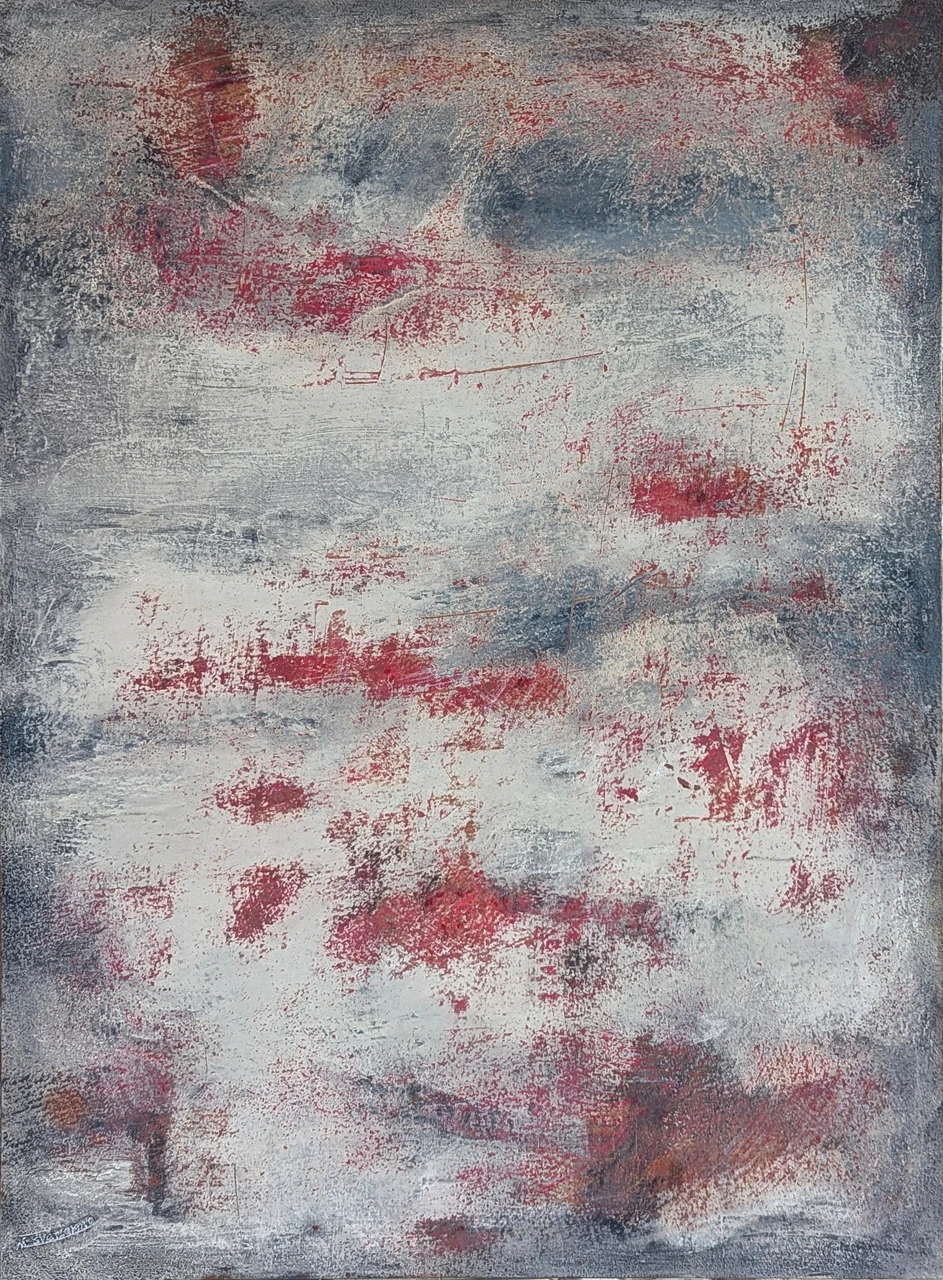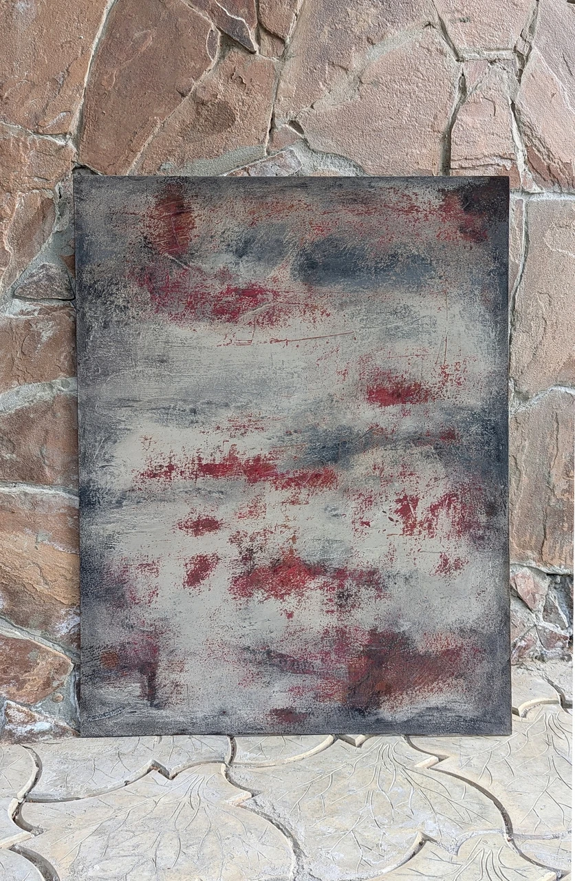 Абстрактный пейзаж в оттенках рассветного утра. Холодные тени, красные лучи и проблески света переливаются и создают эффект воздушной перспективы.