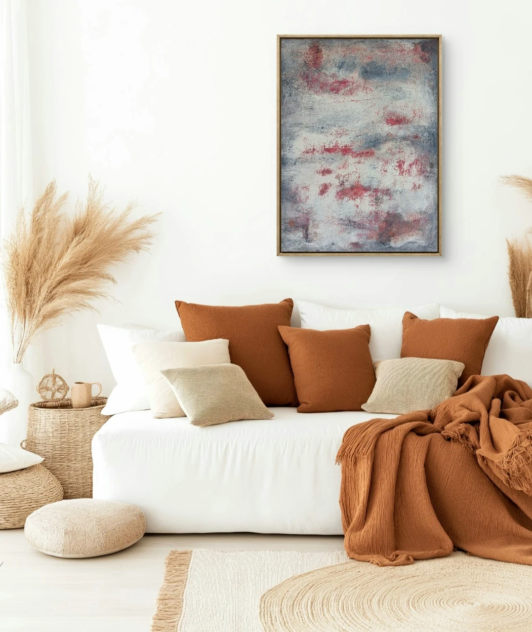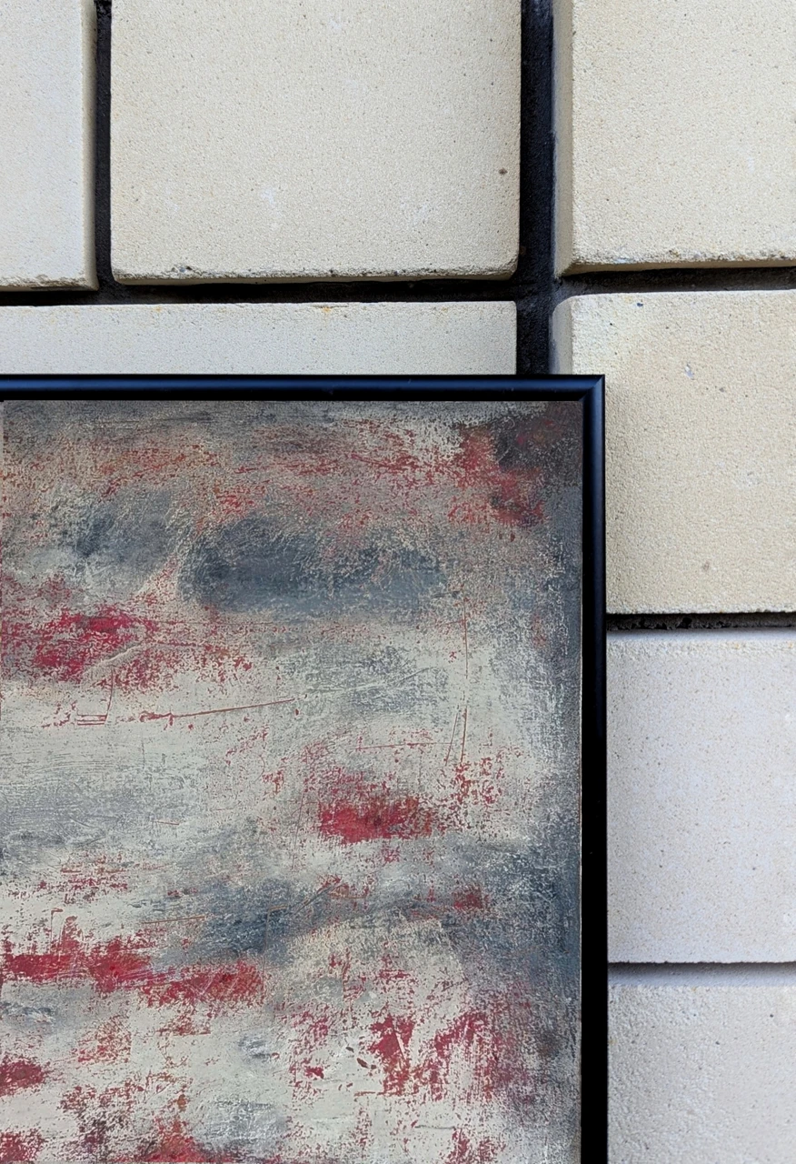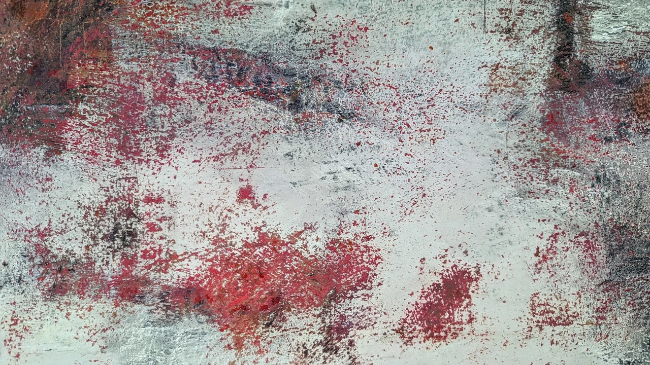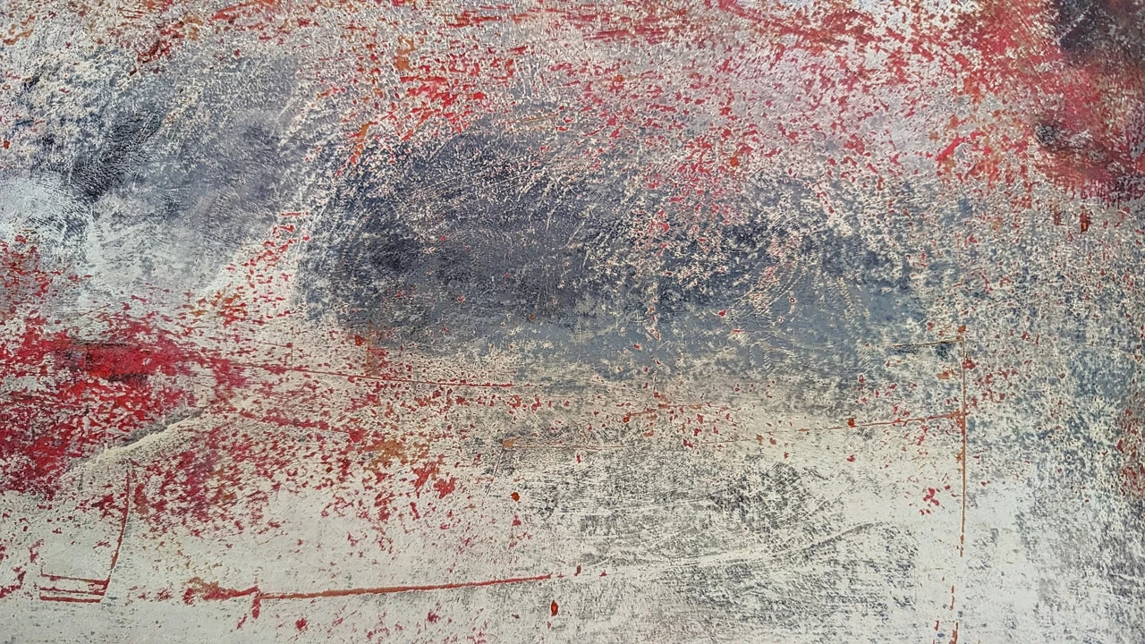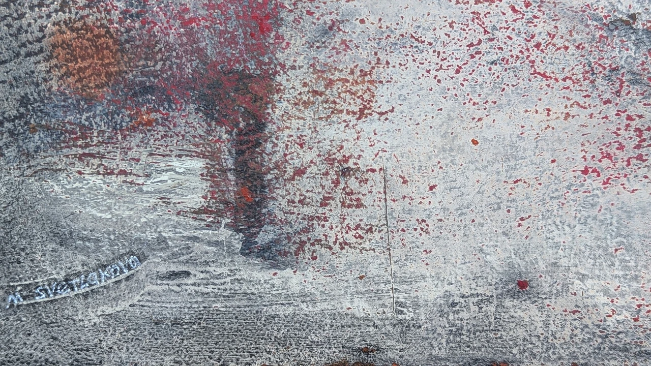 Абстрактный пейзаж в оттенках рассветного утра. Холодные тени, красные лучи и проблески света переливаются и создают эффект воздушной перспективы.