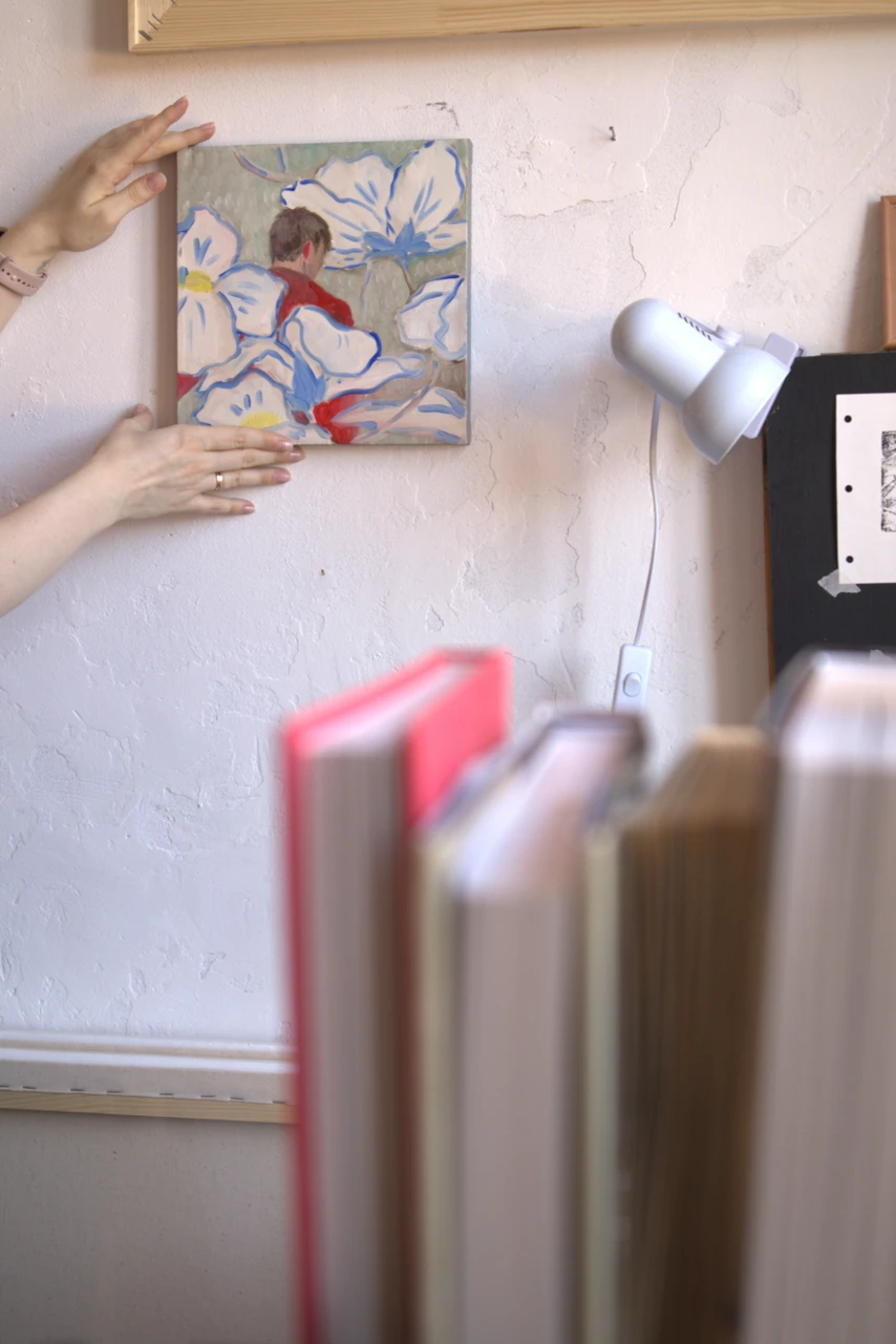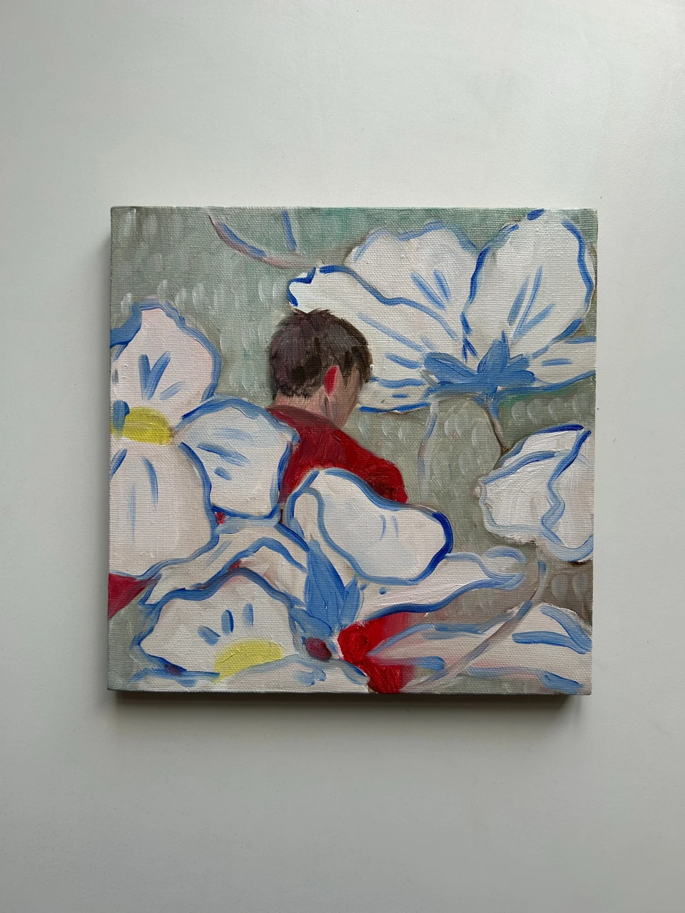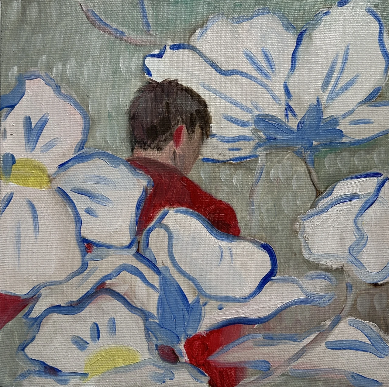 Работа «AMONG FLOWERS (Среди Цветов)» — это авторская живописная композиция, выполненная маслом на холсте. На картине изображена фигура человека, виднеющаяся со спины, утопающая в окружении стилизованных, крупных цветов. Преобладают белые лепестки с синими контурами, контрастирующие с яркими вкраплениями красного и желтого. Фон выполнен в приглушенных серо-зеленых тонах, создавая ощущение глубины и мягко выделяя центральный образ. Композиция передает ощущение уединения и погружения в природу, где человек становится частью цветочного мира.