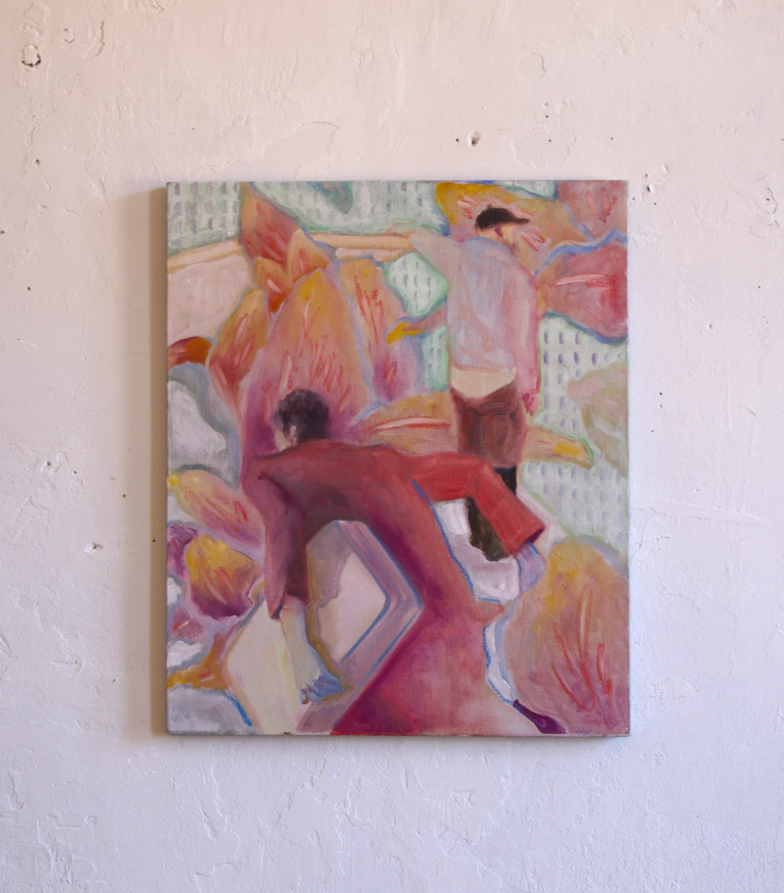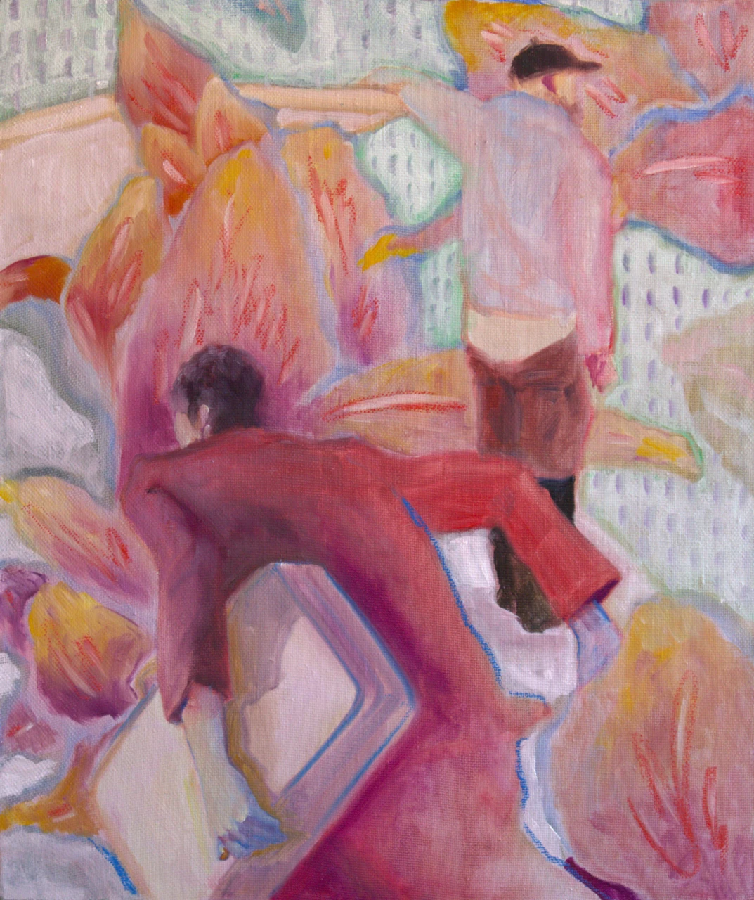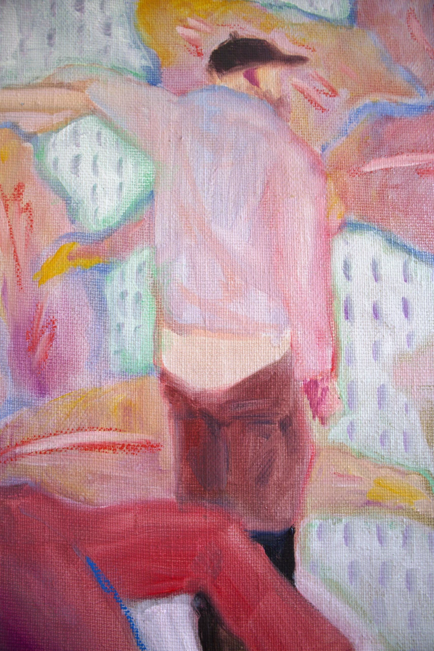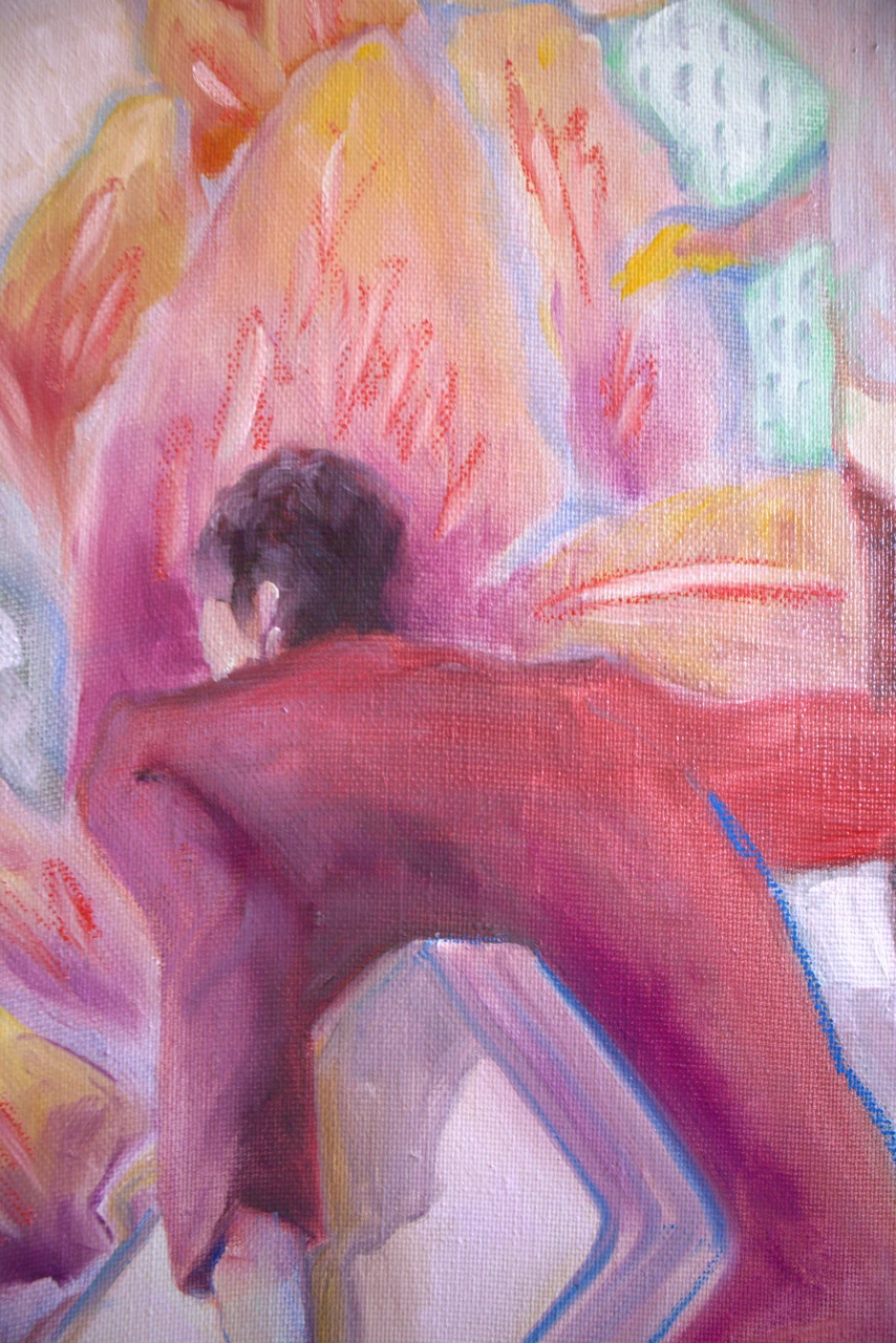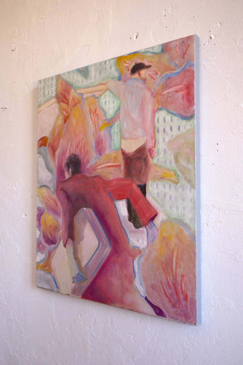 Работа «RUSH HOUR (Час Пик)» — это авторская живопись маслом и масляной пастелью на холсте, передающая динамику бытия. Композиция построена на контрасте ярких, перетекающих друг в друга цветовых пятен и более детализированных фигур людей. Теплые оттенки розового, оранжевого и желтого создают ощущение суеты и энергии, характерной для «часа пик». Фигуры людей, выполненные в приглушенных тонах, растворяются в общем потоке, подчеркивая идею движения и анонимности в толпе. Использование масляной пастели добавляет текстурности и глубины, делая поверхность холста более осязаемой.