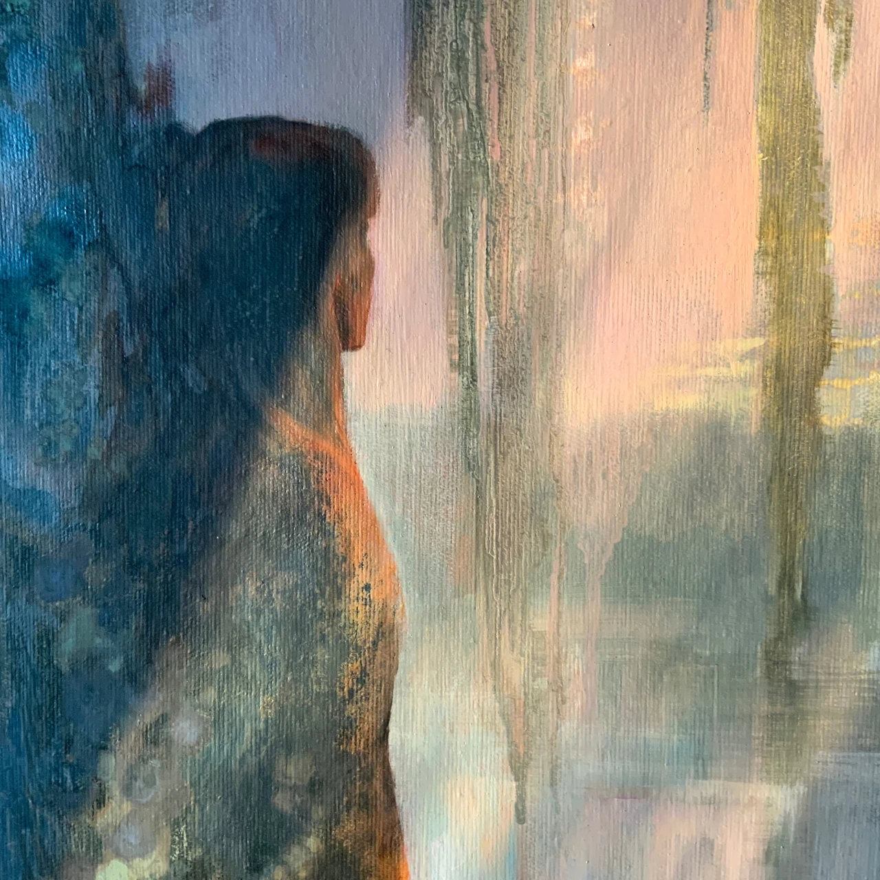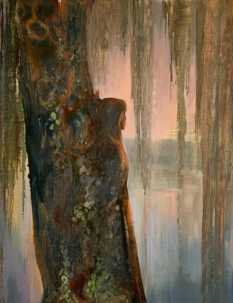 Сумеречный пейзаж Марины Горбуновой передаёт состояние тихого единения с природой. Работа наполнена спокойствием и медитативным настроением. Мотив ивы у воды становится образом созерцательного погружения в тишину.