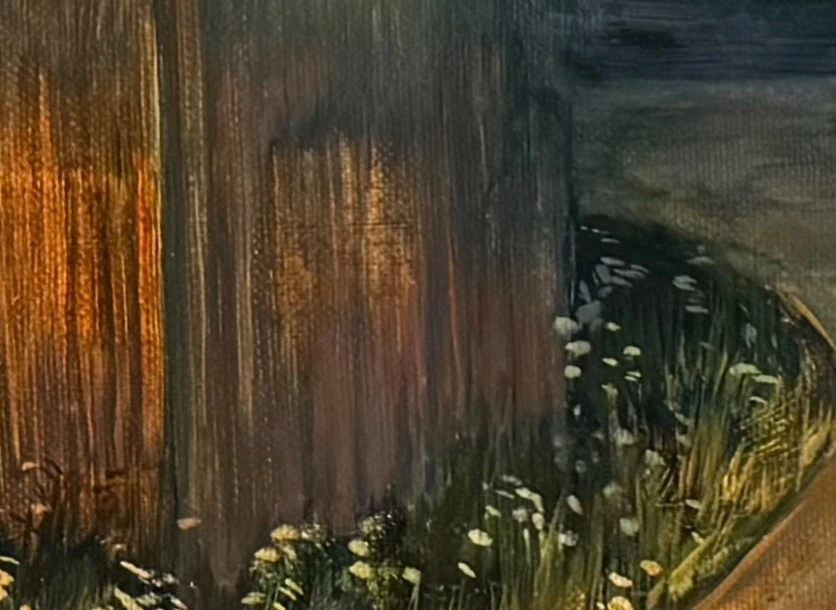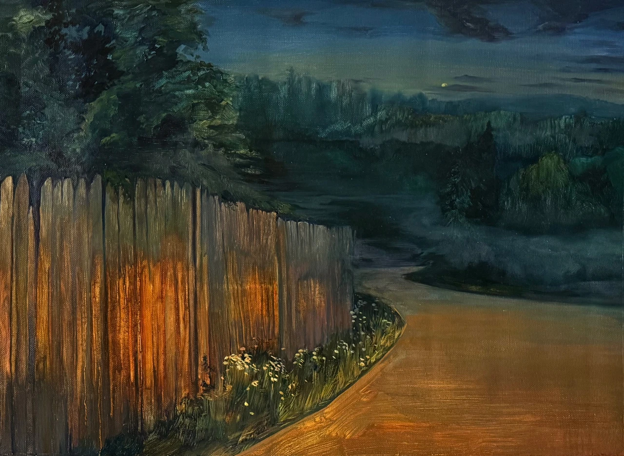 Свет фар выхватывает из темноты знакомые очертания забора родного дома. Неужели добрались? В своей работе Марина Горбунова передаёт момент возвращения, как после узнавания близких сердцу мест происходит переход от чувства тревожной нескончаемой дороги к чувству безопасности.