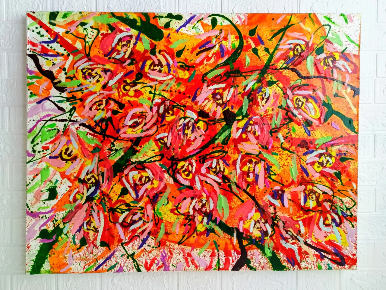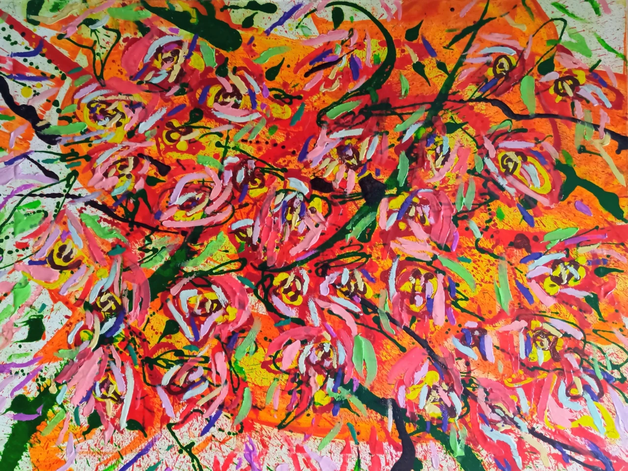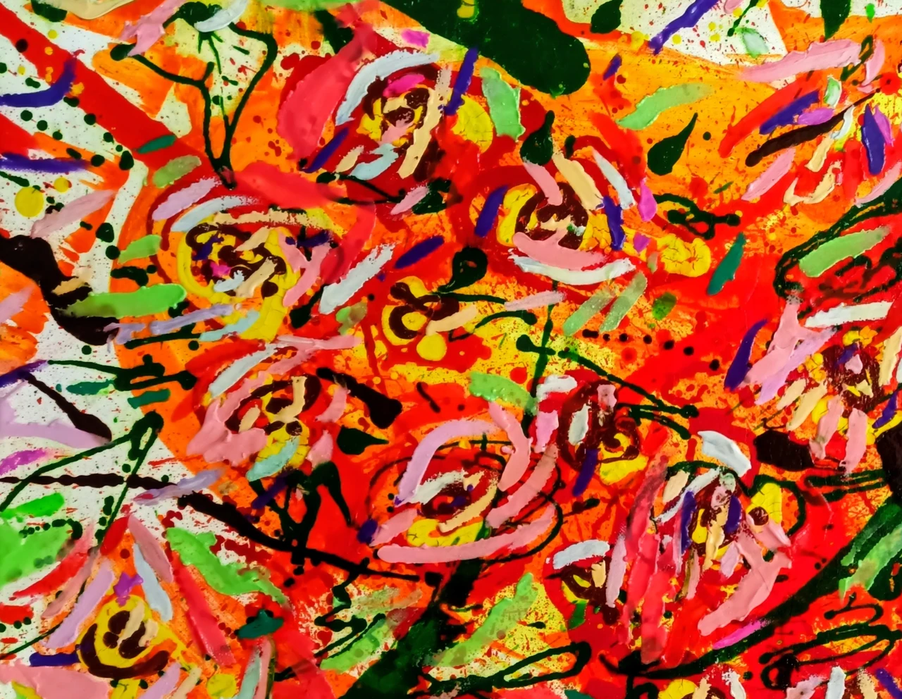 Работа «Натурщица» — это авторская абстракция, выполненная акрилом и пластилином на холсте. Композиция отличается яркой, экспрессивной палитрой, где преобладают оттенки красного, оранжевого и розового, создавая ощущение динамики и тепла. Множественные мазки и текстуры, нанесенные как кистью, так и пластилином, формируют сложный, многослойный визуальный ряд. Зеленые и темно-синие линии контрастируют с фоном, добавляя глубины и ритма. Цветовые пятна и брызги создают эффект движения и энергии, характерный для современного искусства. Эта авторская работа станет выразительным арт-объектом для интерьера, добавляя пространству яркости и художественной выразительности.