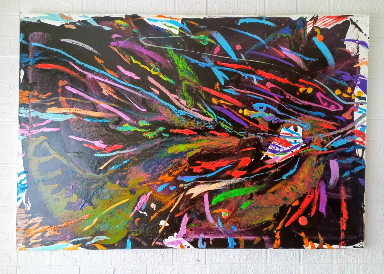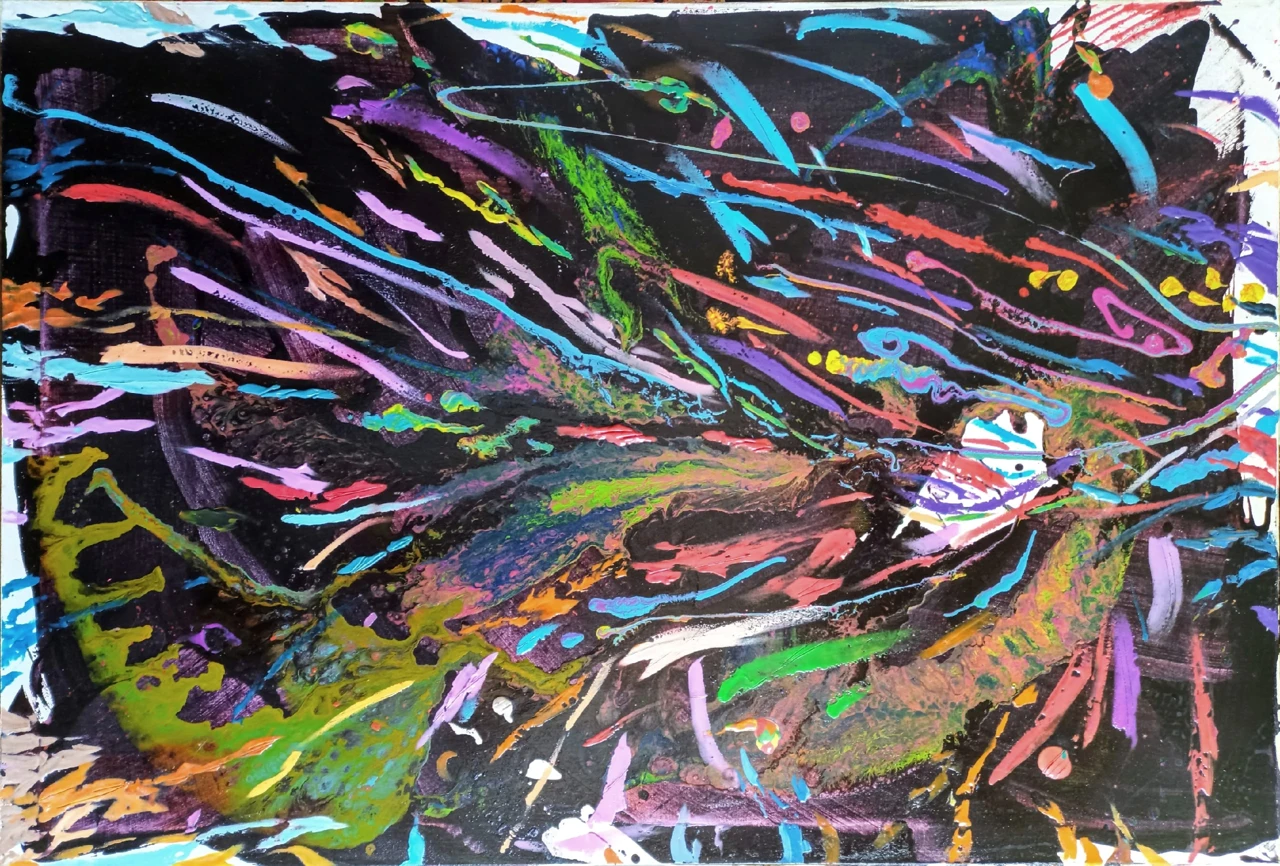 Яркие линии и мазки будто изображают порывы ветра, которые мешают движению, создают препятствия. Но несмотря на хаос вокруг, «птичка» продолжает свой путь — она не замирает, не исчезает, а летит вперёд. Это создаёт мощный символизм.