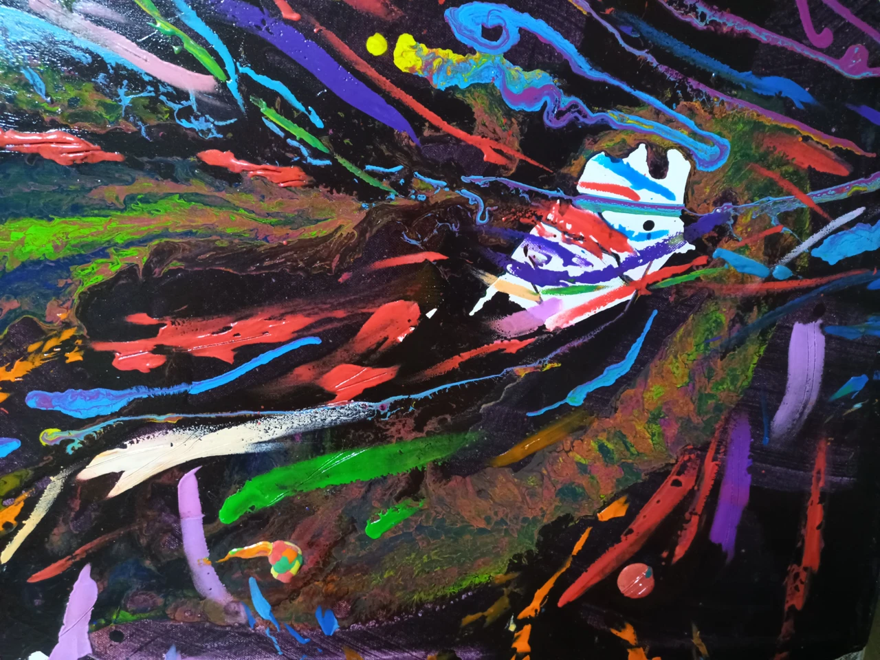 Хаотичные мазки и тёмный фон — жизненные трудности, страхи, обстоятельства, которые пытаются остановить, сбить с пути.
