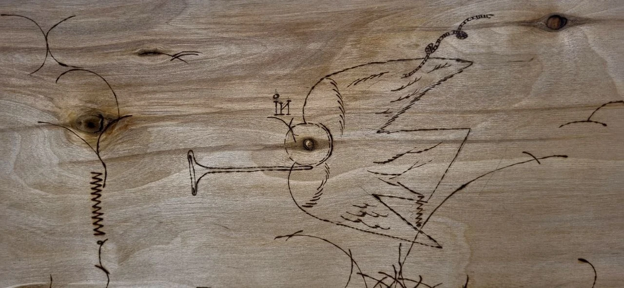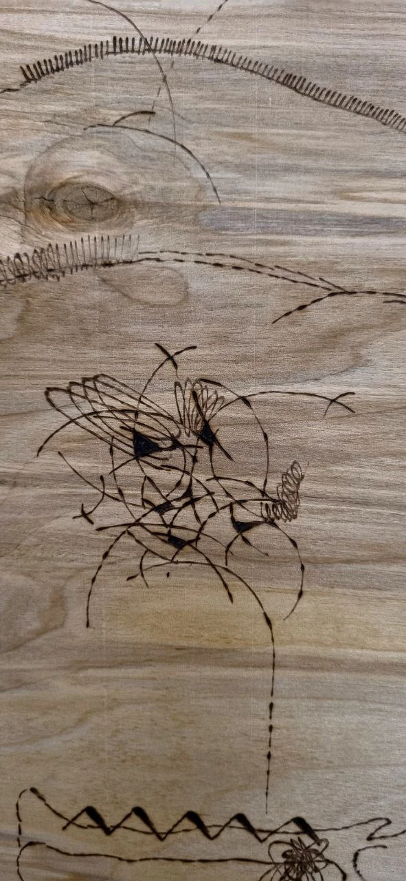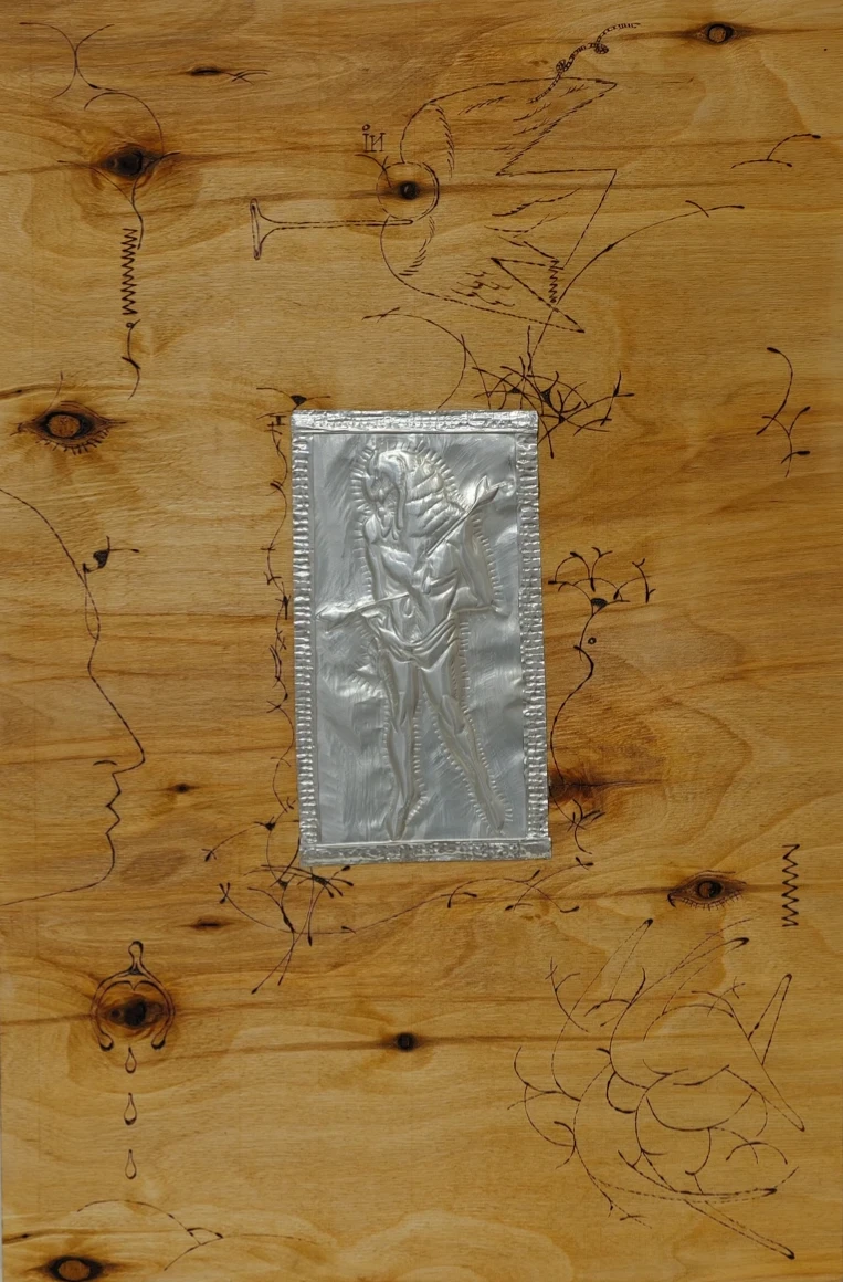 Деревянный холст с фрагментом чеканки, на холсте узоры выполнены выжиганием, покрыта лаком и имеет крепления для подвешивания.