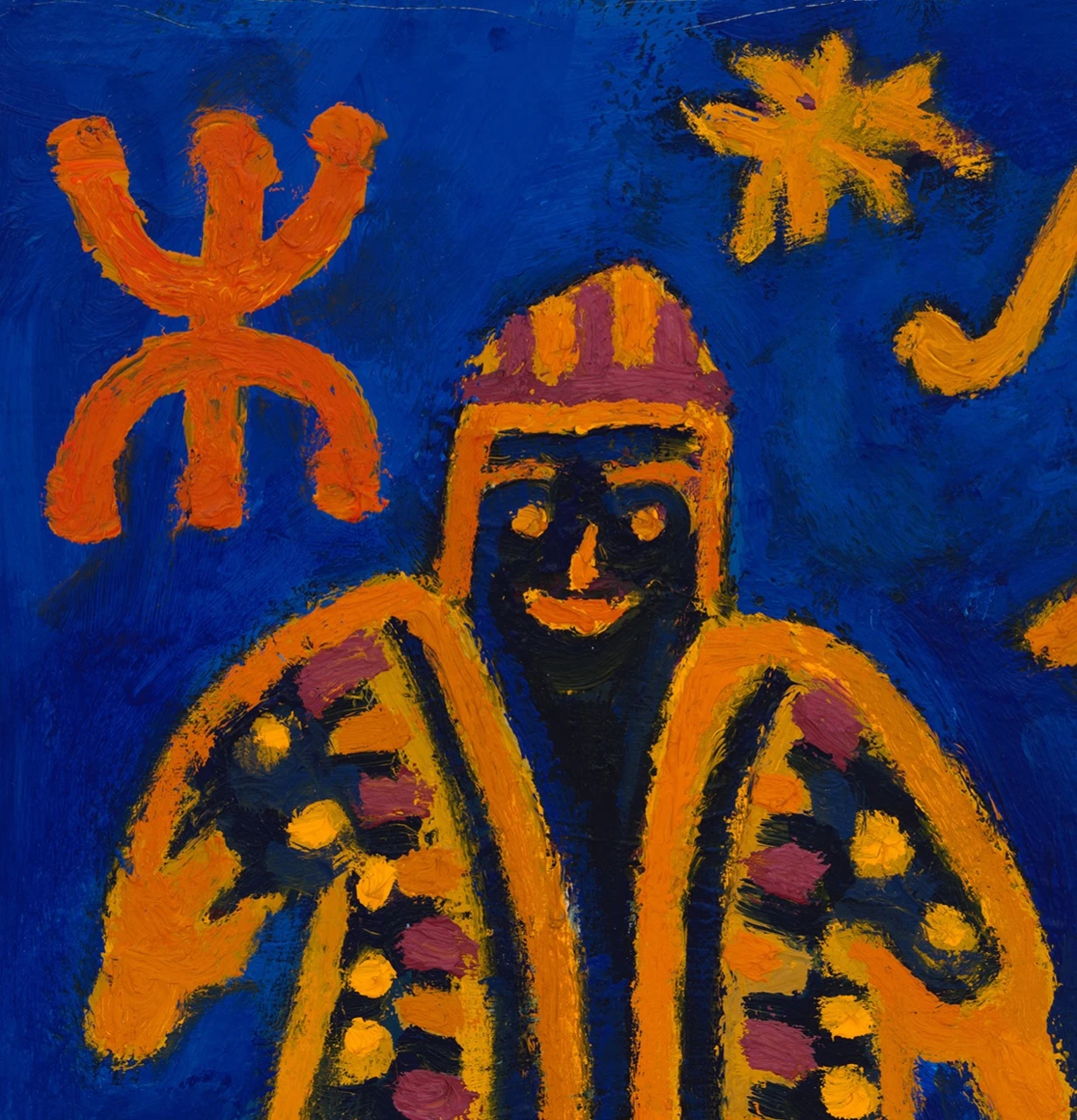 Работа написана на основе материалов из Российского Этнографического музея. Персонажи работы – фигурки, взятые из сюжетов из северных рождественских расписных пряников (козулек). Они очень праздничные, яркие и жизнерадостные, а вместе с тем – в них иного лирики и глубины, любознательности и желания запечатлеть самое ценное.
