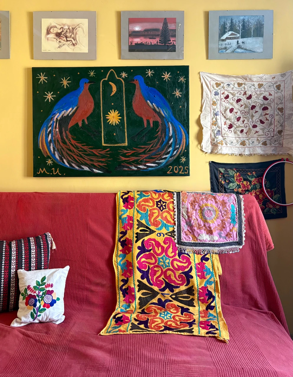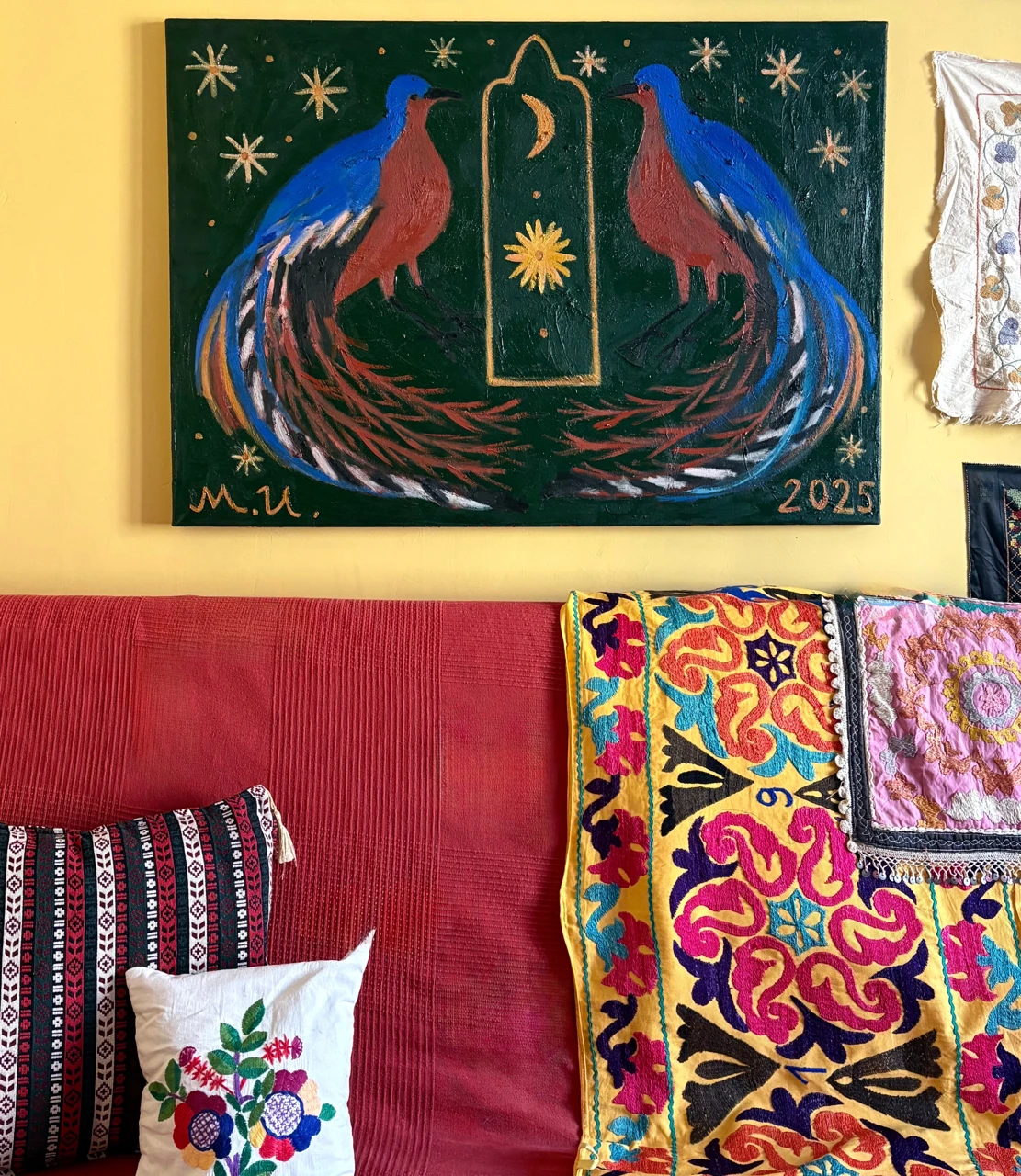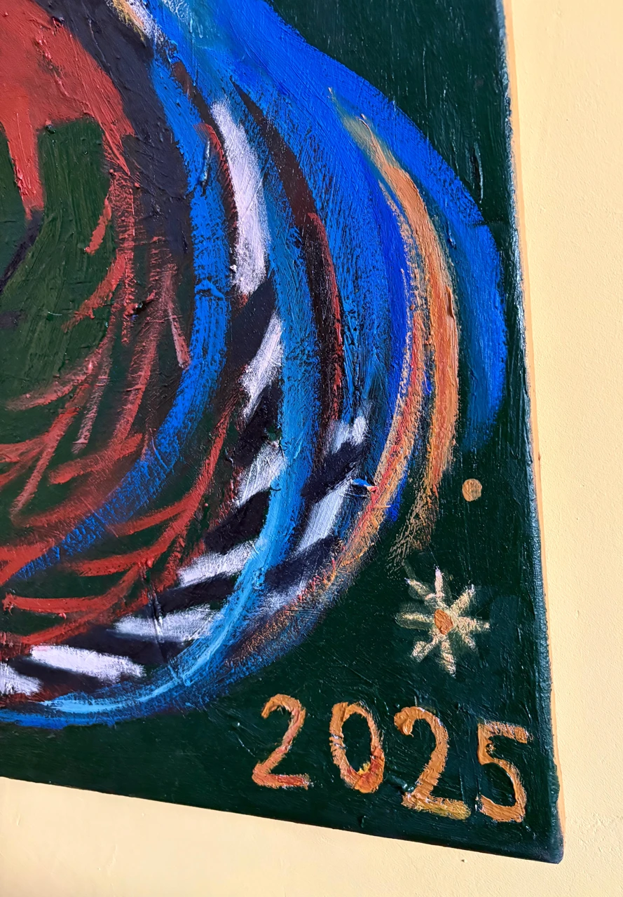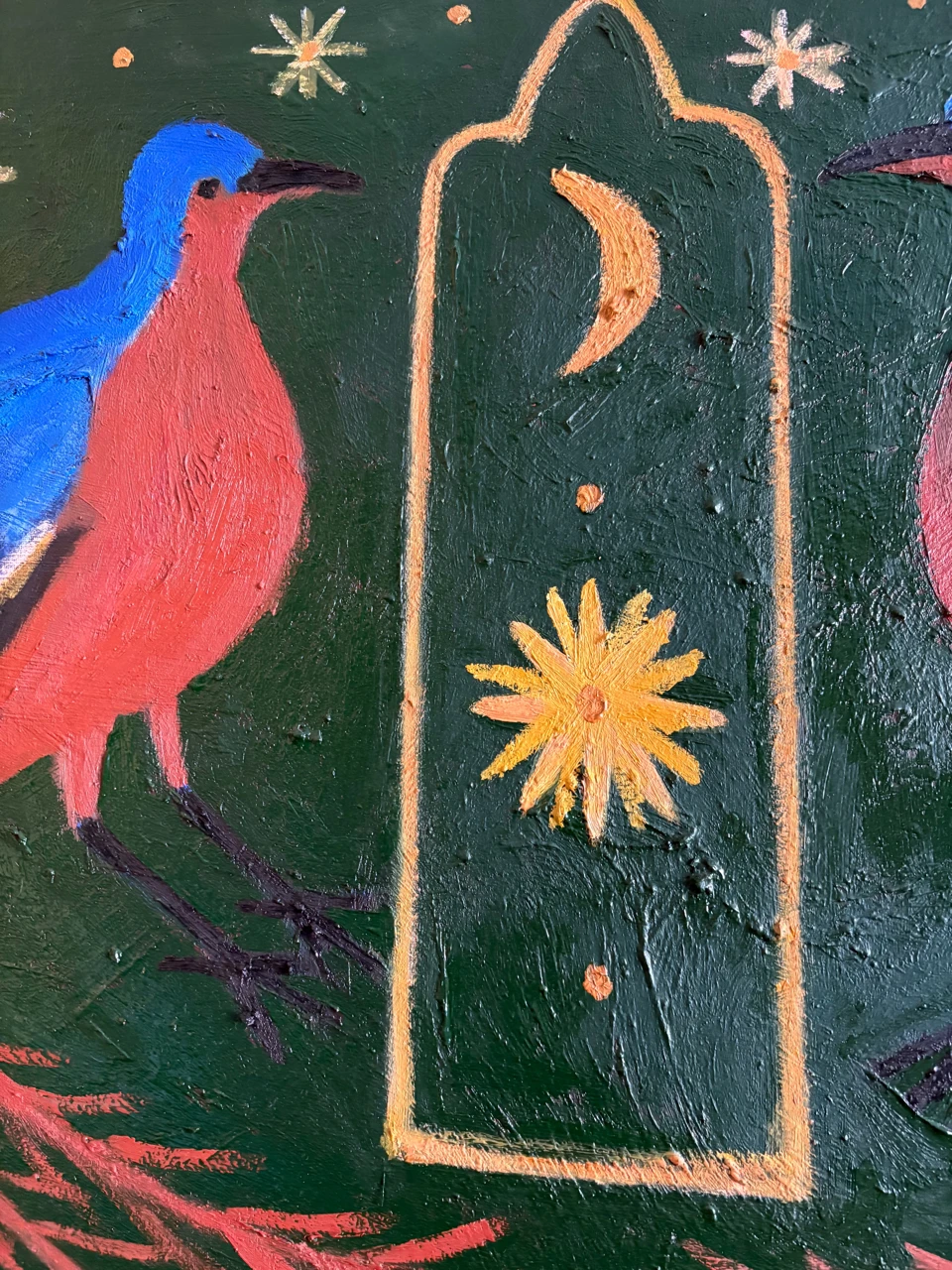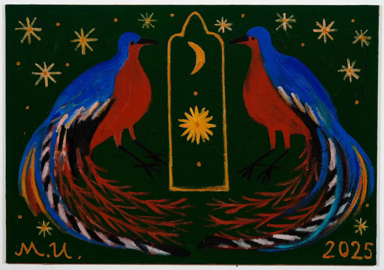 На работе изображены две экзотических птицы — лирохвостых менюра — на насыщенном зеленом фоне, наполненном звездами и небесными светилами. Это метафорический образ космоса, райского сада. идеального места, в котором все находится в гармонии: солнце и луна, небо и земля, и все их обитатели. Этот образ отсылает к русскому-народному искусству, в котором изображение животных. особенно парных – частый сюжет. Птицы — образ небесного пространства, счастья, свободы. Между ними — арка — также часто используемый символ из традиционного искусства многих народов — он обозначает соединение небесного (божественного) и земного.