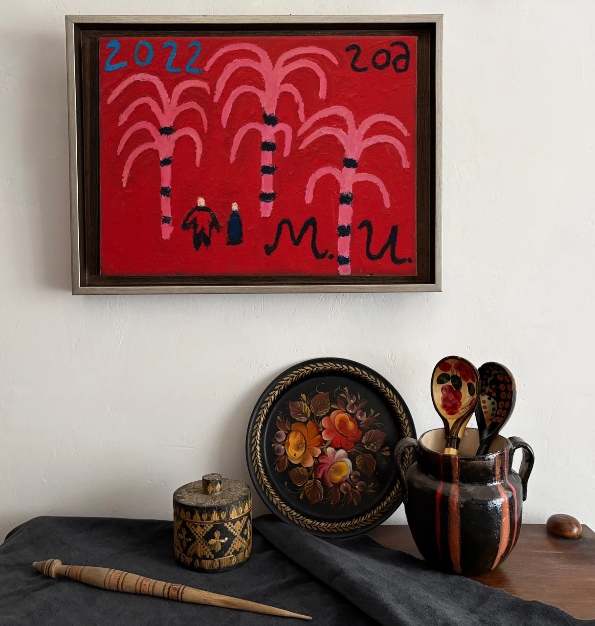 Размышление о русской культуре. На красном фоне изображена влюбленная пара под березками. Название работы «Давай среди берез густых читать любимый твой рассказ: страничку я, страничку ты» (строки из песни) как бы добавляет романтики, отправляю нас к русской классической литературе.