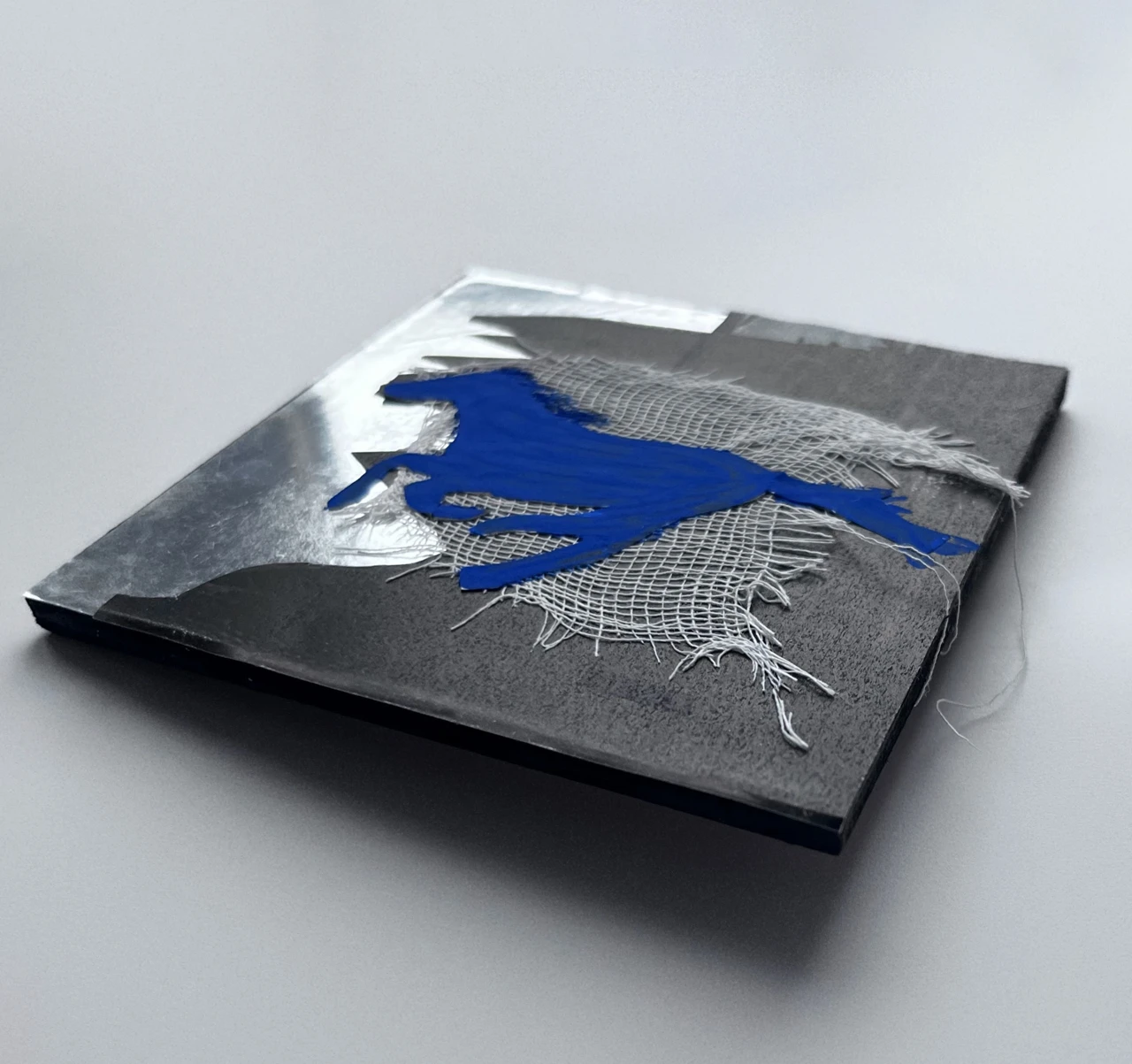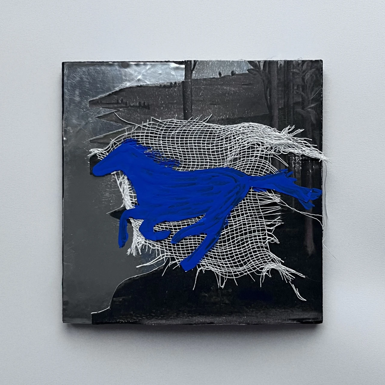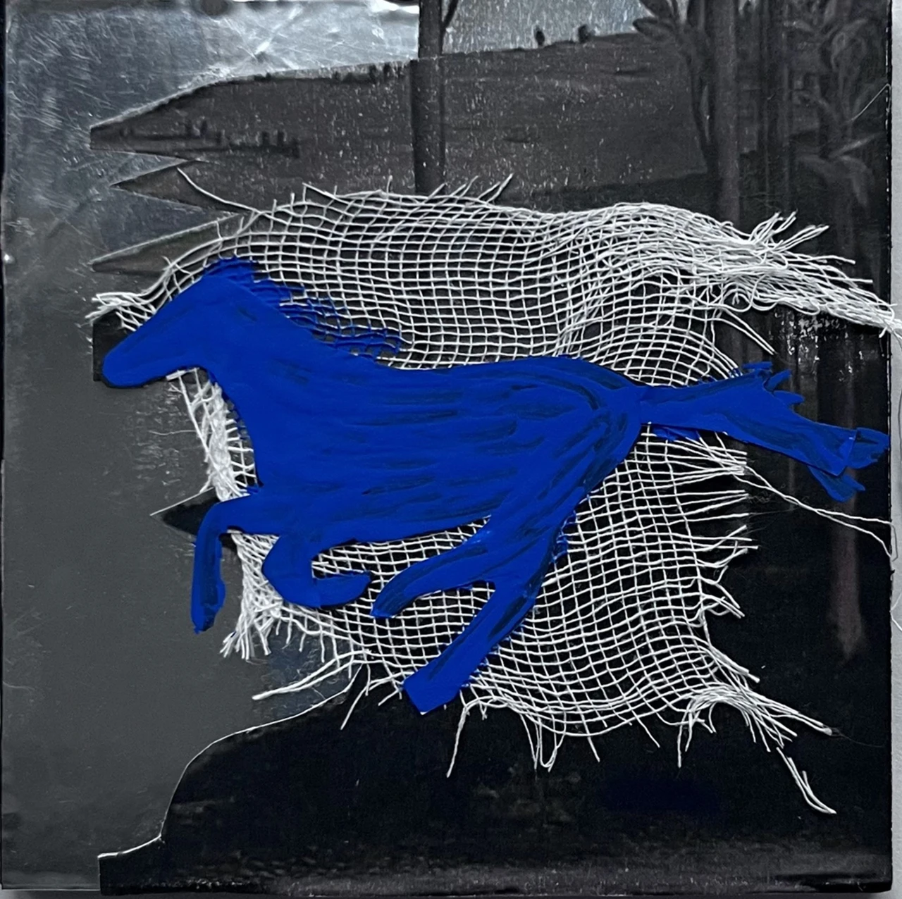 Ручной коллаж из разных техник с отсылкой на лошадь Мейбриджа и знаковые моменты из истории искусств.