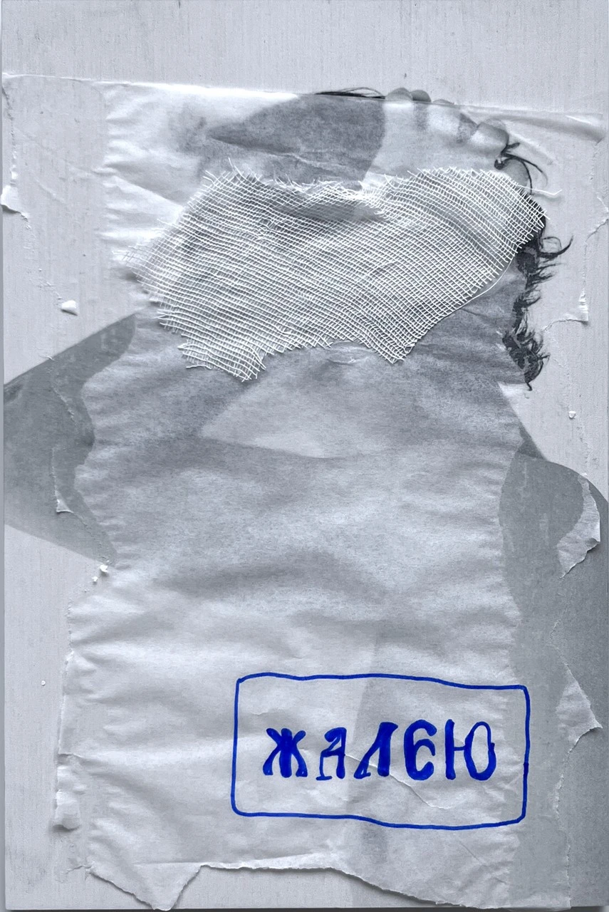 Далее на фотографическую основу добавляется мутный слой кальки, частично скрывая изображаемого от зрителя, так же как образ из наших воспоминаний, лишённый четкости и ясности по прошествии времени.