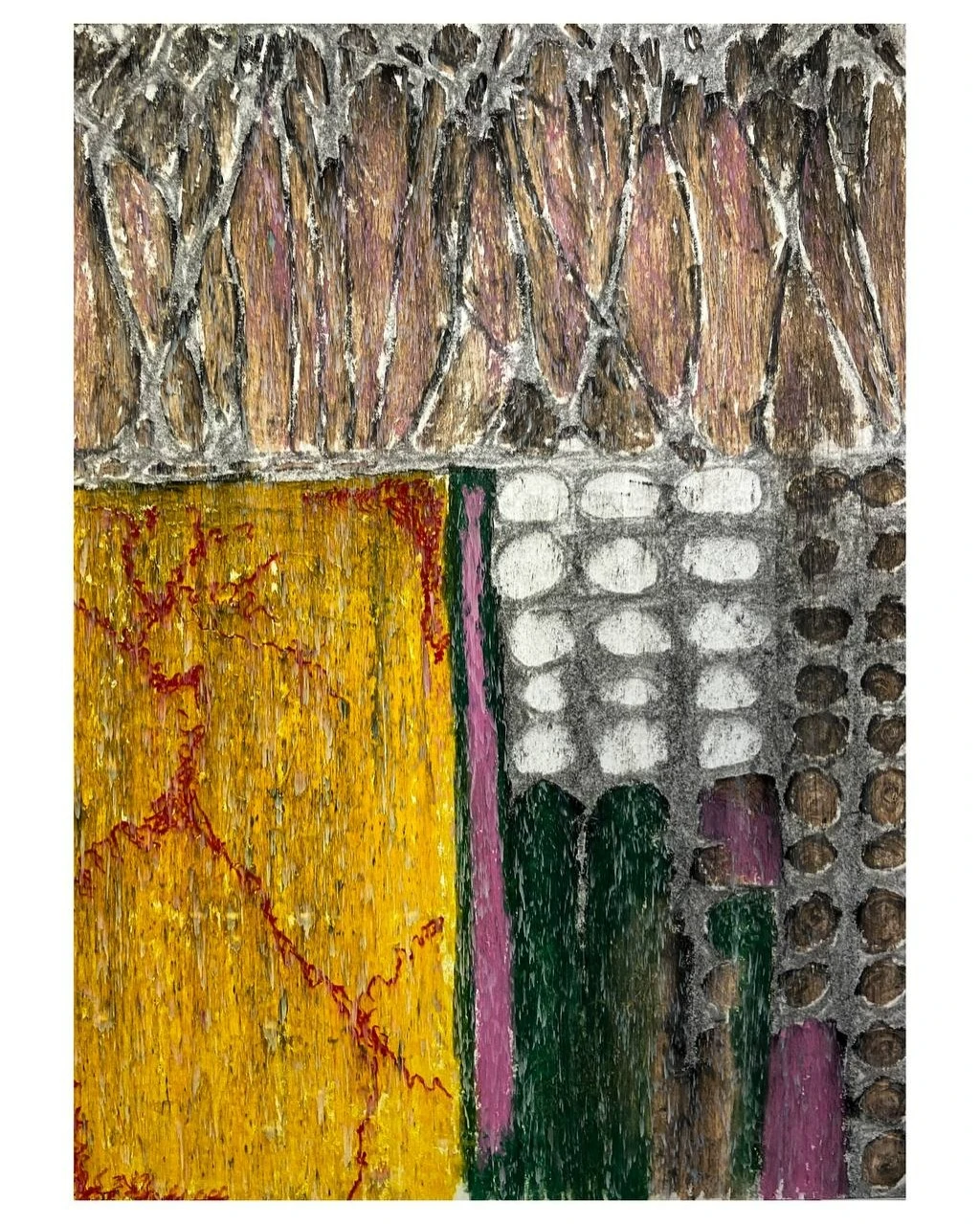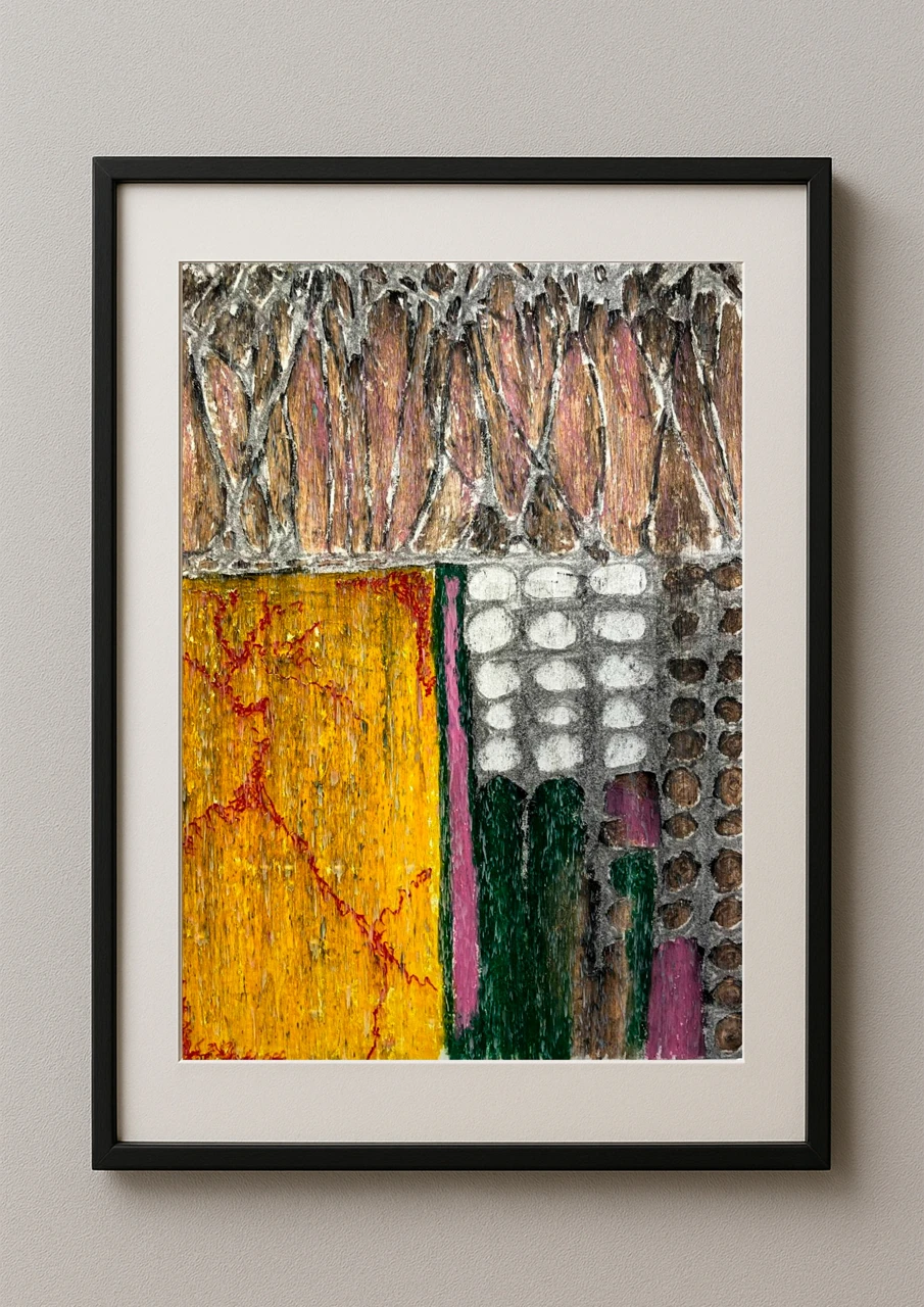 Процесс питания мхом, переведенный в двумерную плоскость и расщепленный на отдельные друг от друга элементы неназванным травоядным среди прожилок камней.