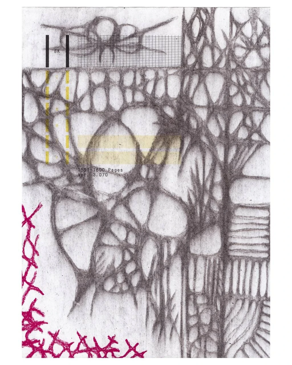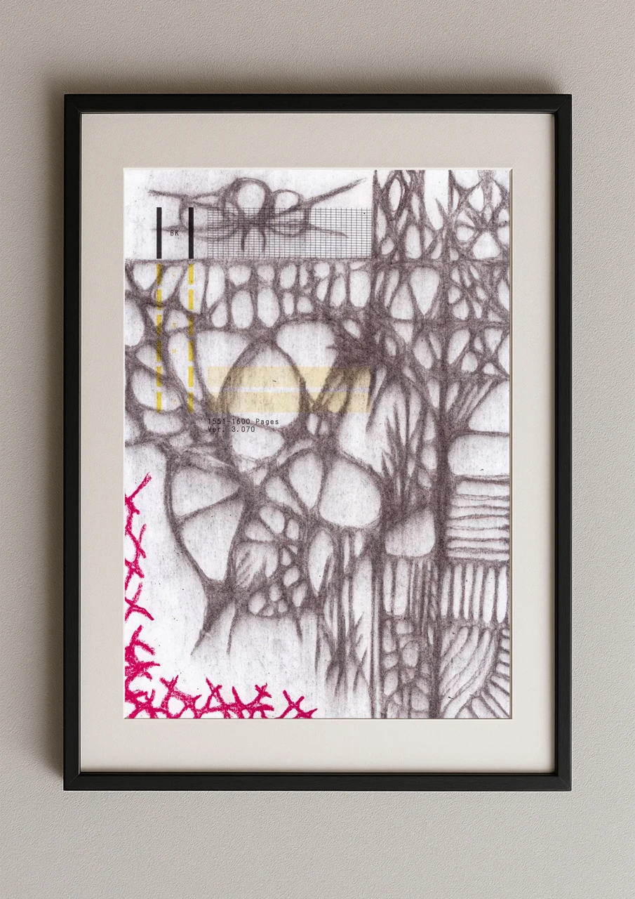 Pages Vers 3 — небольшая серия графических работ, совмещающих аналоговую угольную и пастельную графику с тестовыми образцами для проверки засорения сопел принтера. В этой серии я компилирую игольчатые узоры и работу оргтехники вне своей базовой задачи, руки человека и чекап машины.
