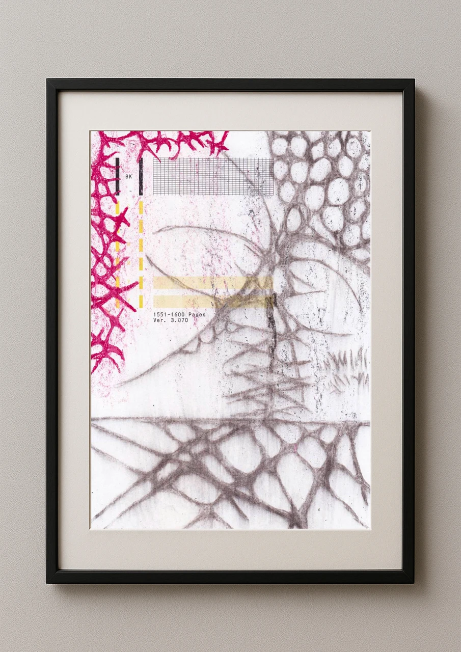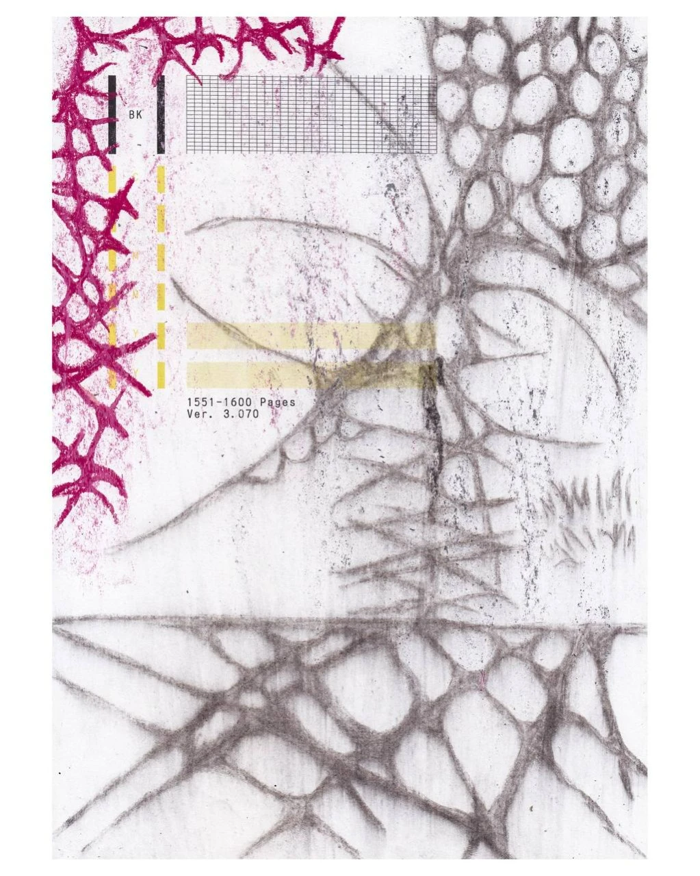 Pages Vers 3 — небольшая серия графических работ, совмещающих аналоговую угольную и пастельную графику с тестовыми образцами для проверки засорения сопел принтера. В этой серии я компилирую игольчатые узоры и работу оргтехники вне своей базовой задачи, руки человека и чекап машины.