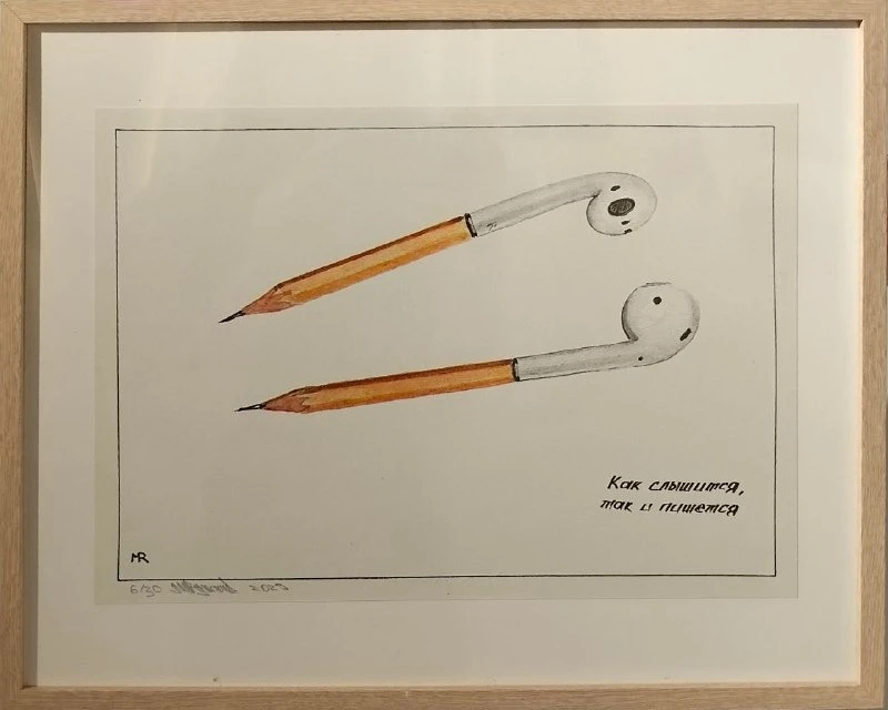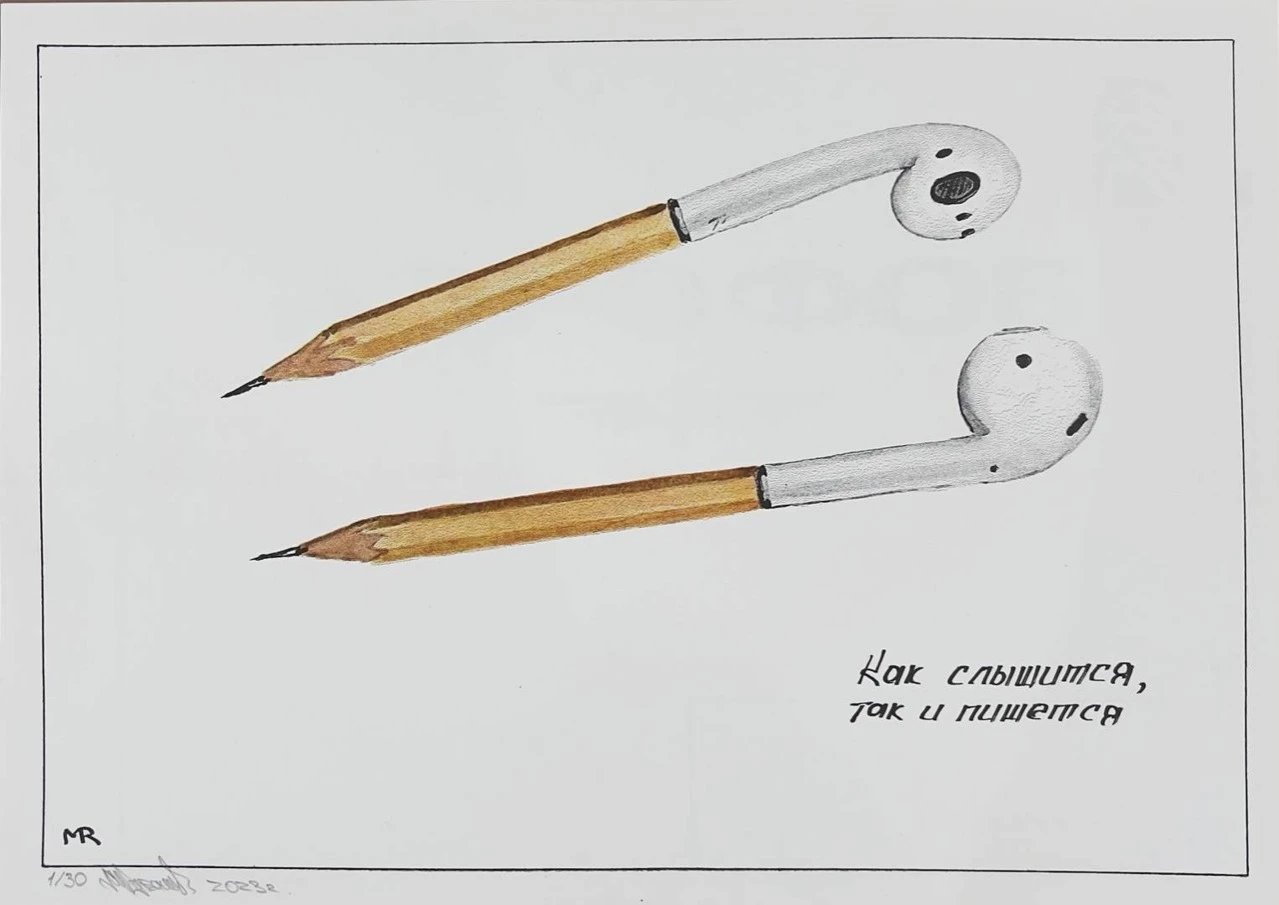 Работа обыгрывает известный фразеологизм Как слышится, так и пишется. Здесь наушник напрямую соединён с карандашом, да абсурдно, но без потери и искажения информации в пути. Буквально, что услышал(а), то и написал(а), и достоверность источника не важна. Так рождаются слухи, так формируется информационное поле.