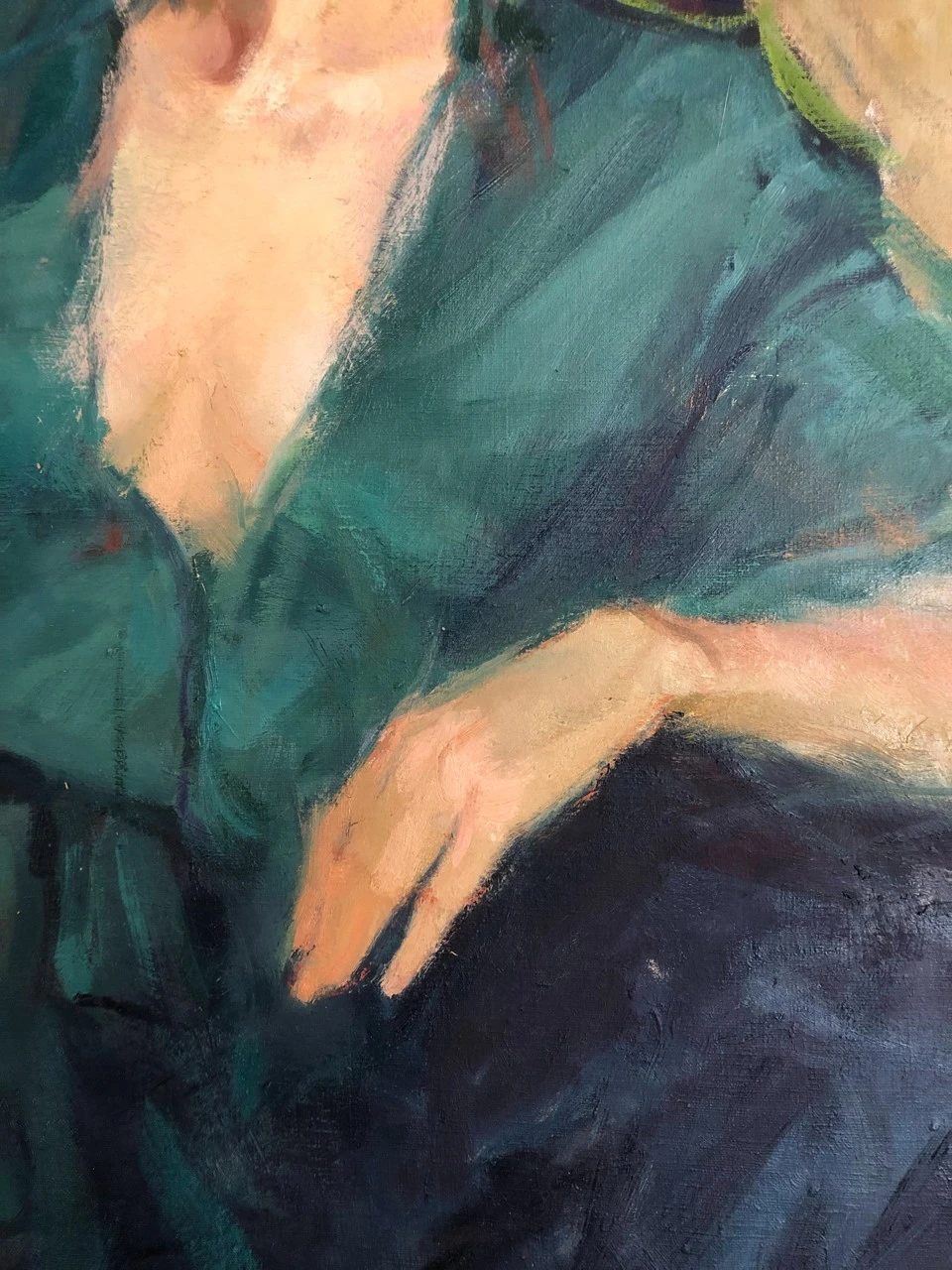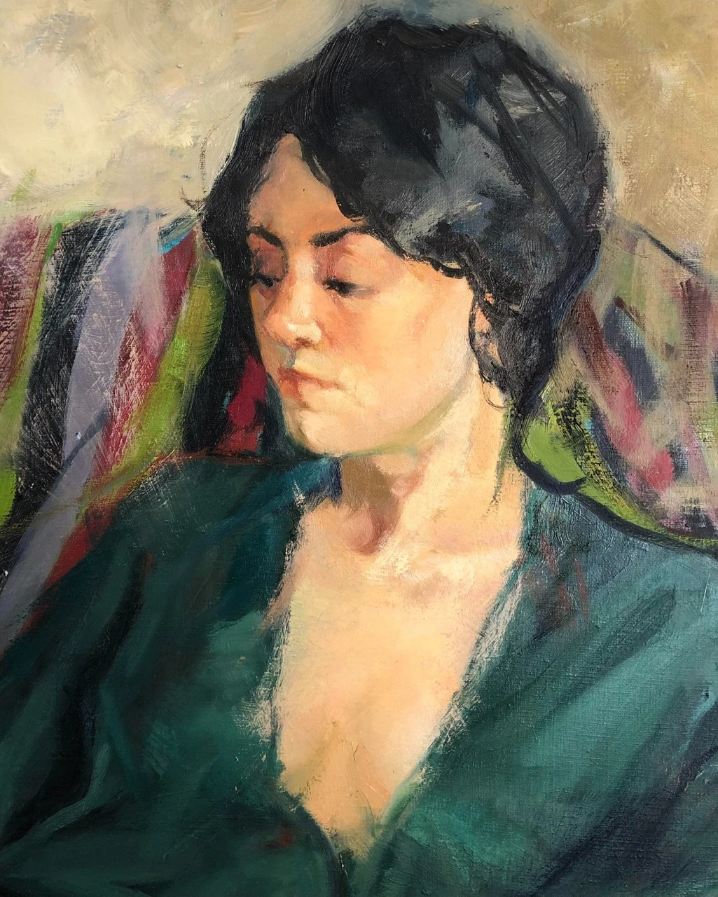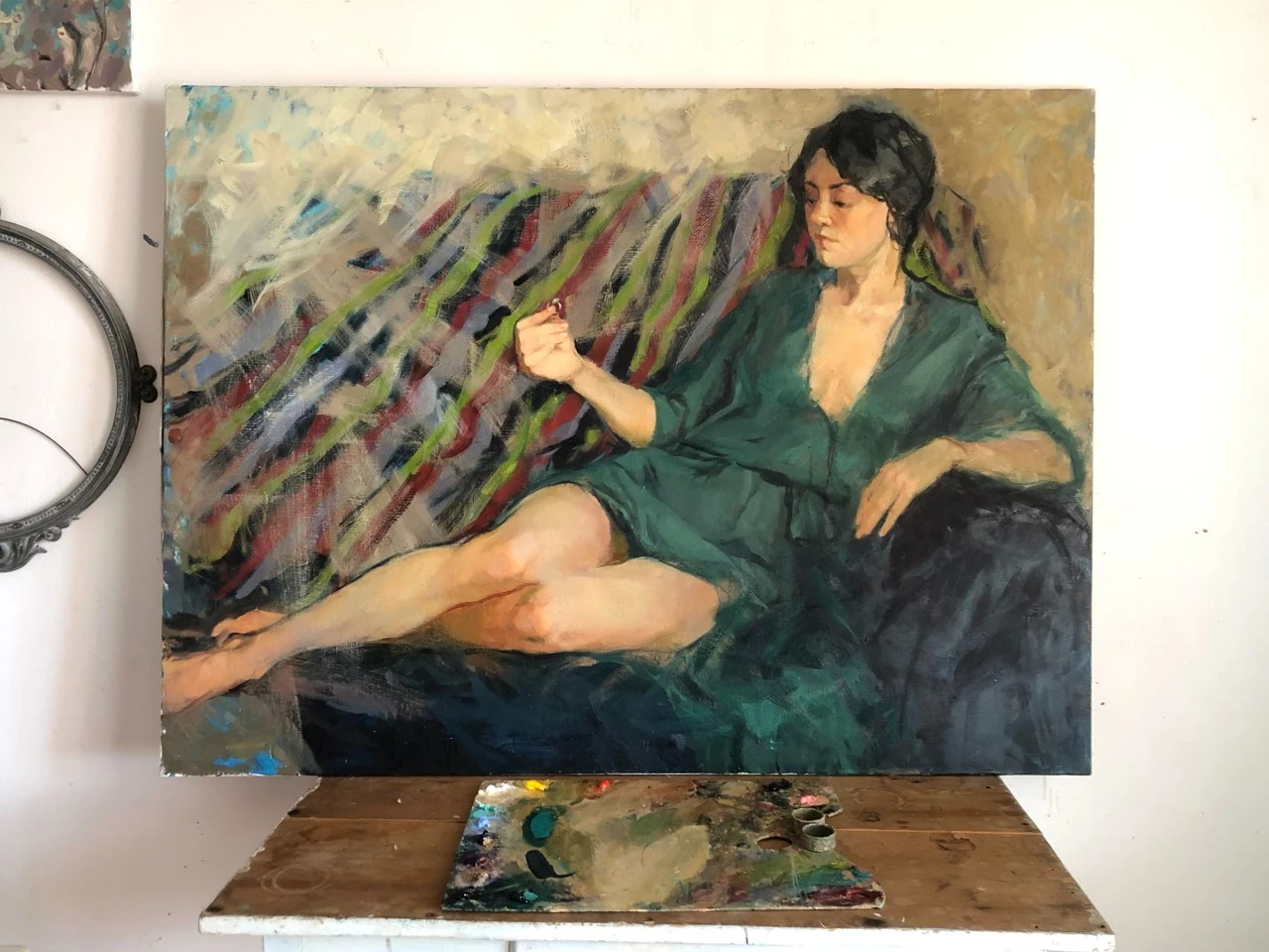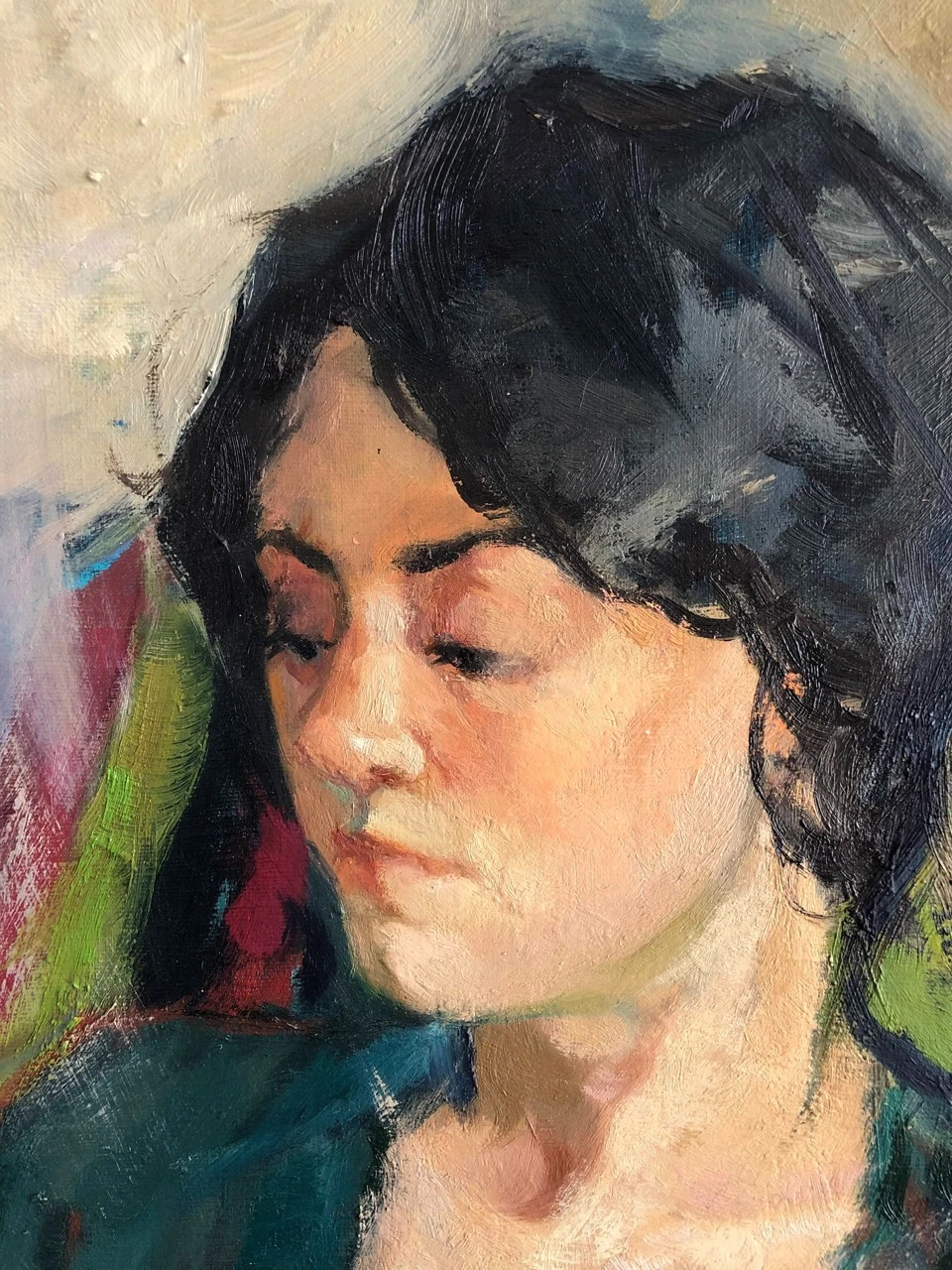 Когда я только начала его писать, в композиции было множество мелочей и деталей. Ожерелья, бусы, браслеты, серьги, шкатулка со струящимися из нее жемчугами. Другая поза модели, в конце концов. Были даже коты!