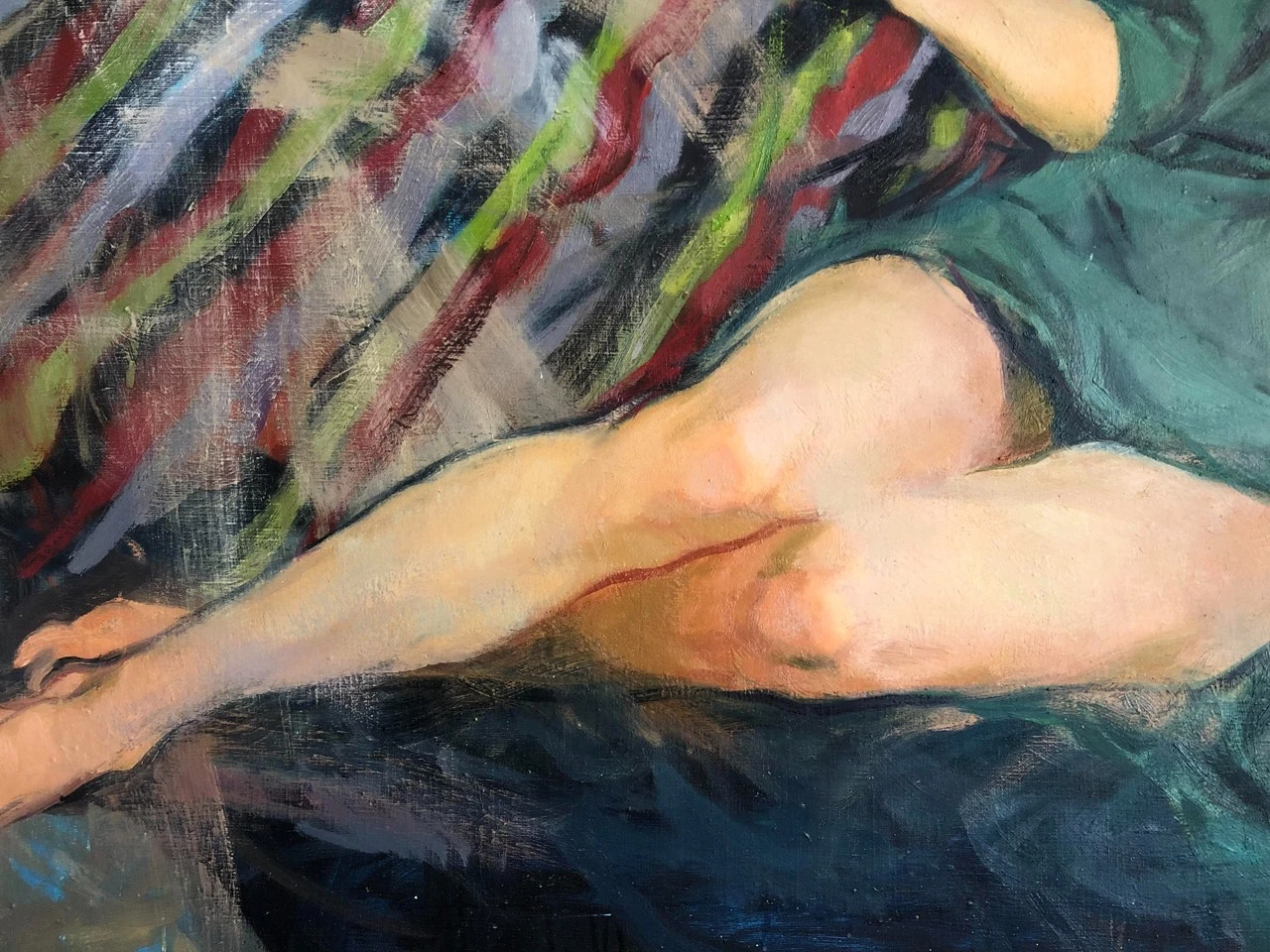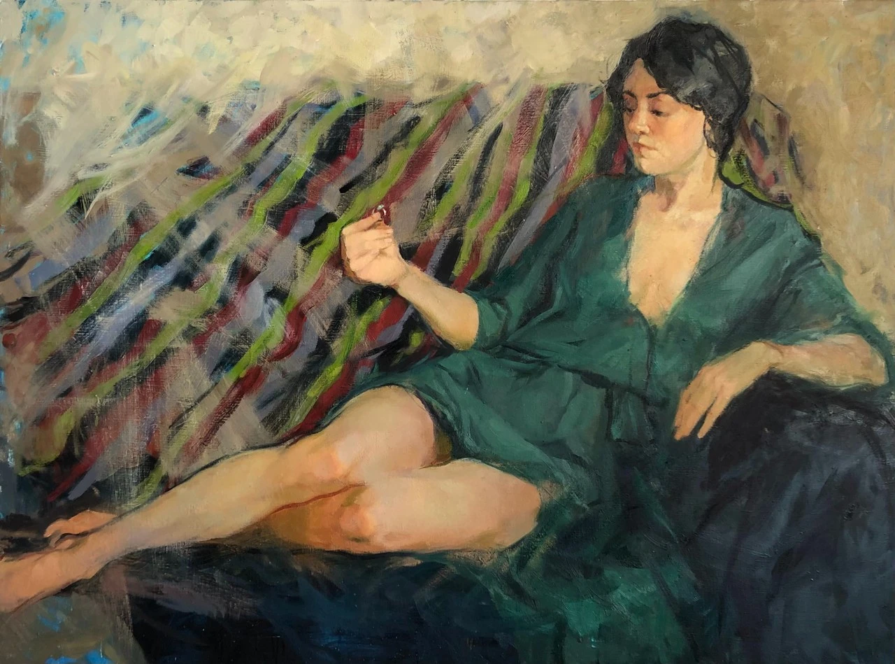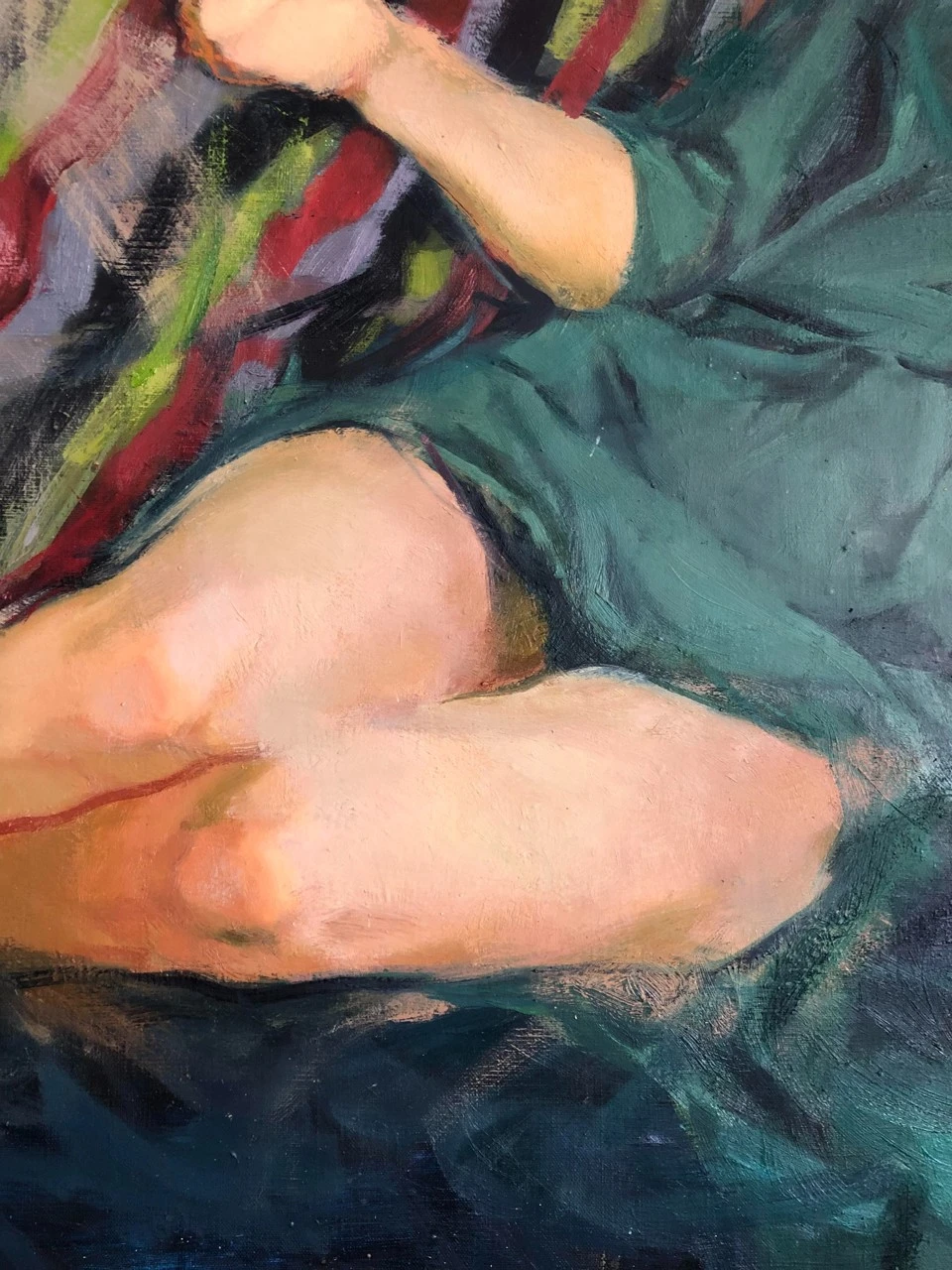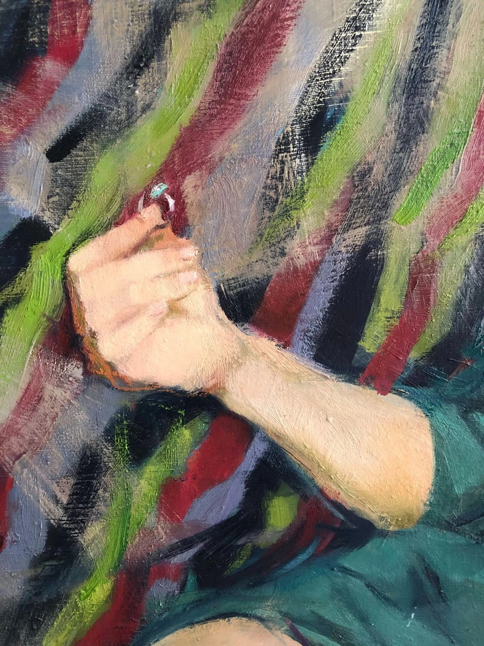 Когда я только начала его писать, в композиции было множество мелочей и деталей. Ожерелья, бусы, браслеты, серьги, шкатулка со струящимися из нее жемчугами. Другая поза модели, в конце концов. Были даже коты!