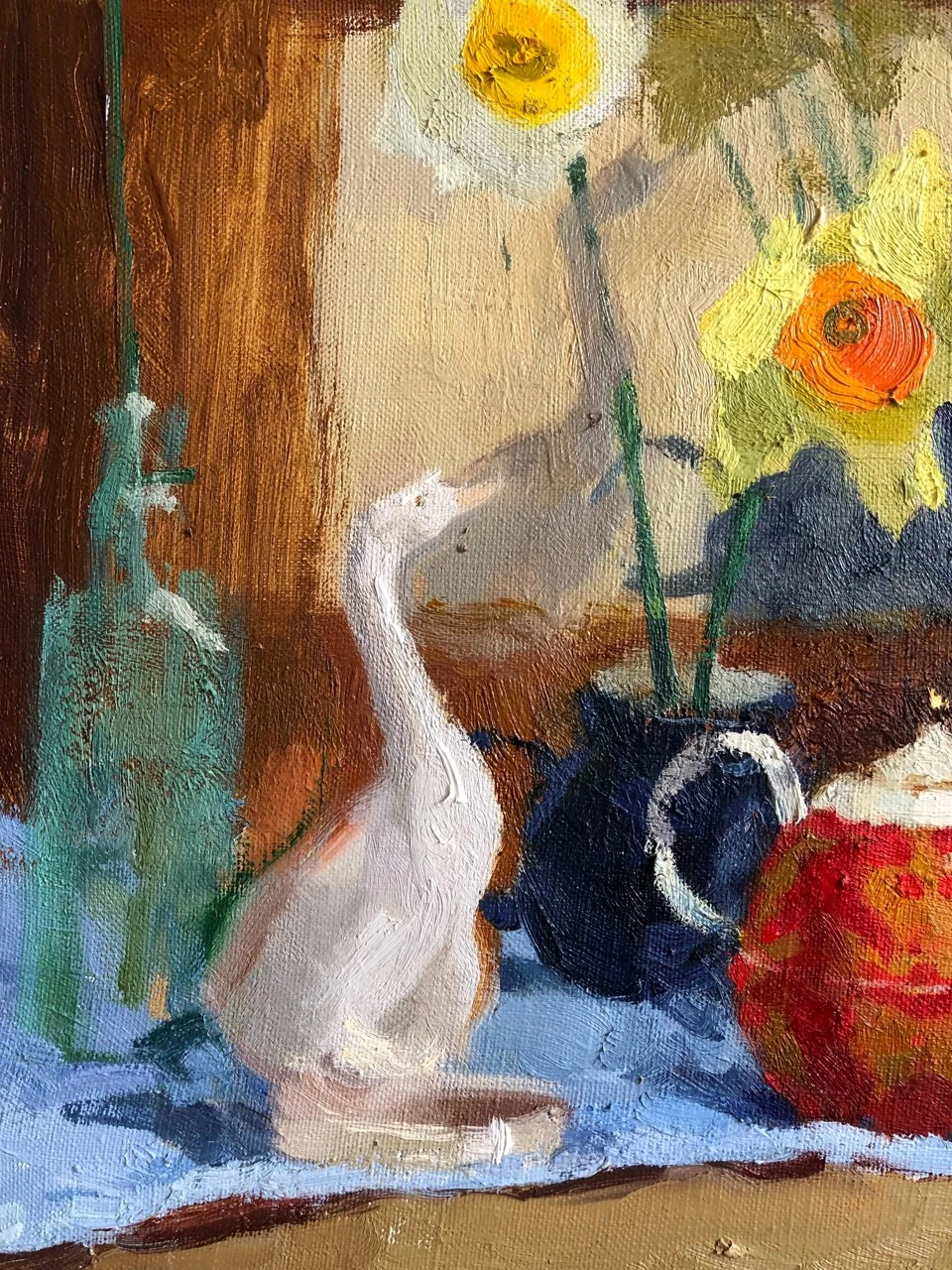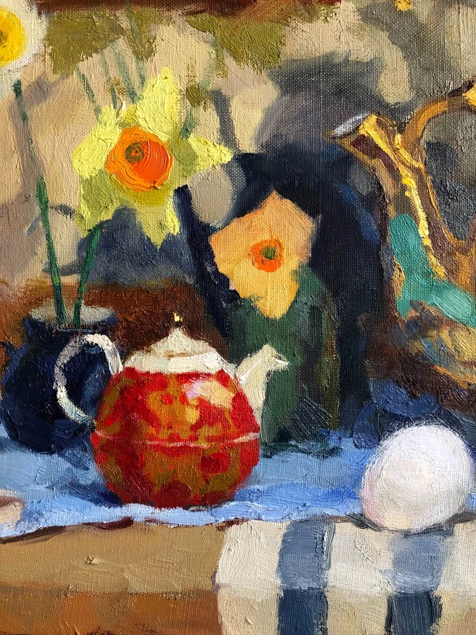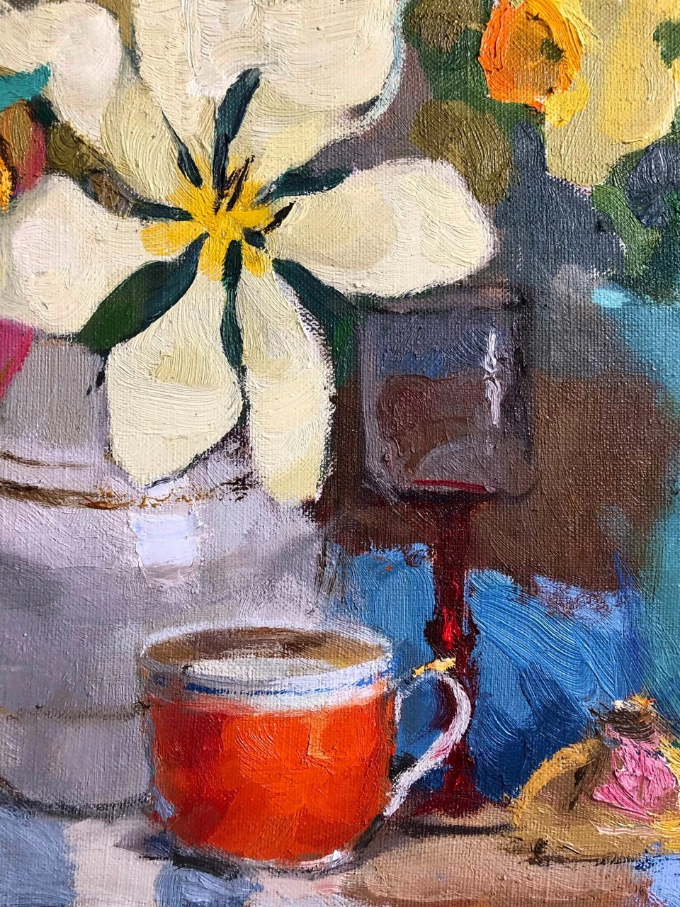 Росла я и росла мамина коллекция статуэток, сервизов и отдельных предметов. Этой серией я выражаю теплоту воспоминаний о детстве, о семье, об эстетике и маминой любви к культуре, которой она научила и меня. Эти картины о простом и понятном. О душевном. О красивом. О человеческом.