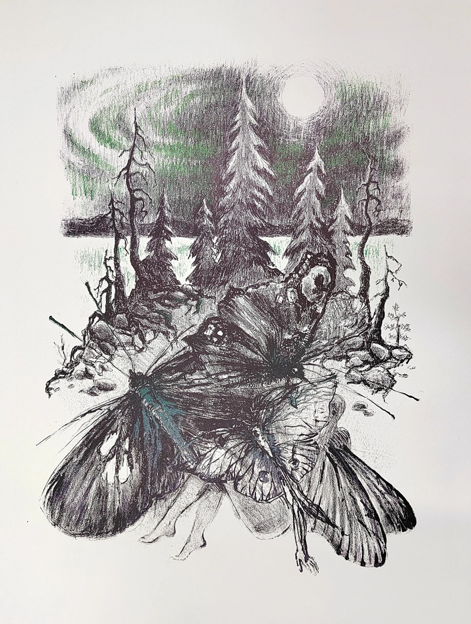 В сумеречном сердце карельского леса, на берегу валунистого острова, где опавшие листья шепчут о неизбежном засыпании, мотыльки и темные бабочки возносятся к изумрудному сиянию неба. Их крылья, в лихорадочном вихре последнего танца, пробуждают спящие сущности — дремлющие тени, рожденные из тумана и мха. Это ритуал прощания: единение с луной и небом перед зимним забвением, где каждый взмах — заклинание вечного цикла.