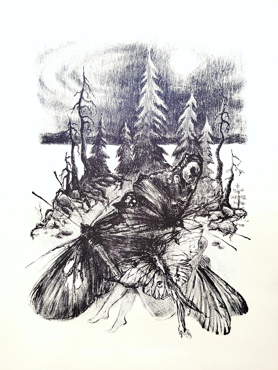 Данная работа выполнена с помощью техники литография, тираж составляет 10 экземляров, из них некоторые выполнены с печатью цвета (вторая прогонка камня). На фото представлено оба варианта: черно-синий и с зелеными бликами.