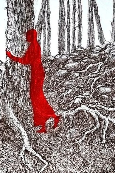 Литография «Возвращение» — о моем мысленном возвращении к местам детства, к родной природе. Силуэт, обнимающий дерево с мощными и цепкими корнями, олицетворяет связь с моей родиной — Карелией.