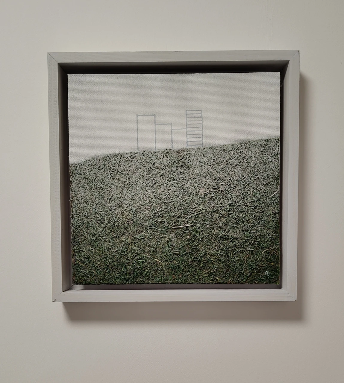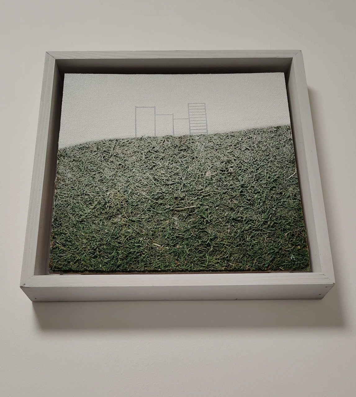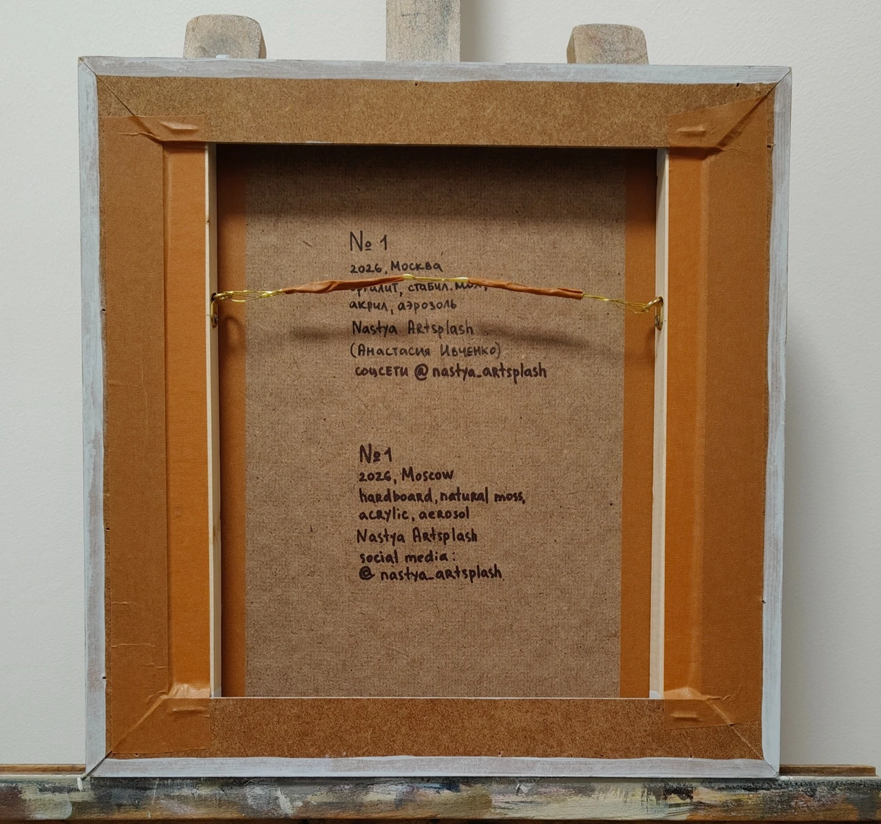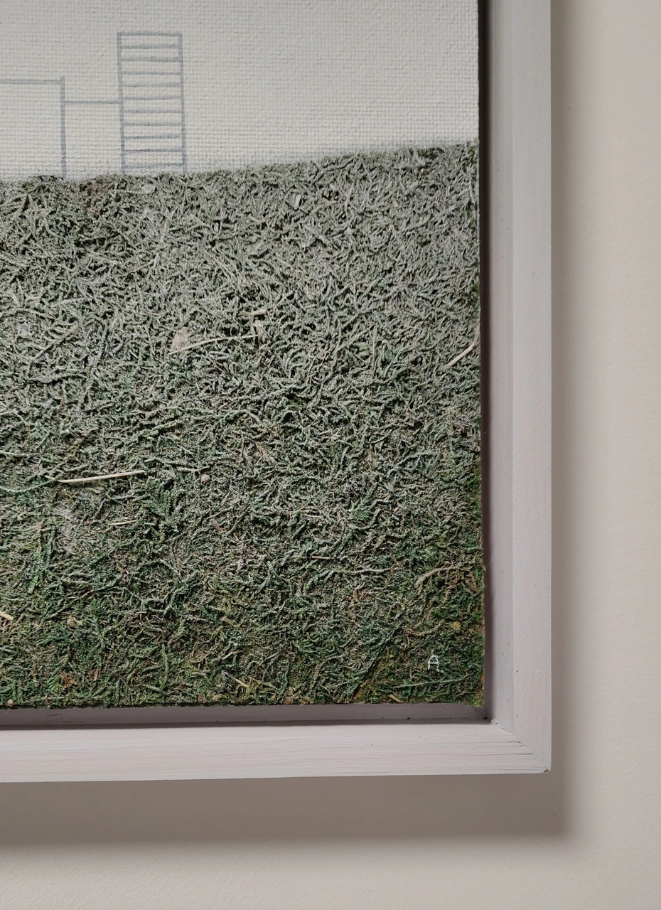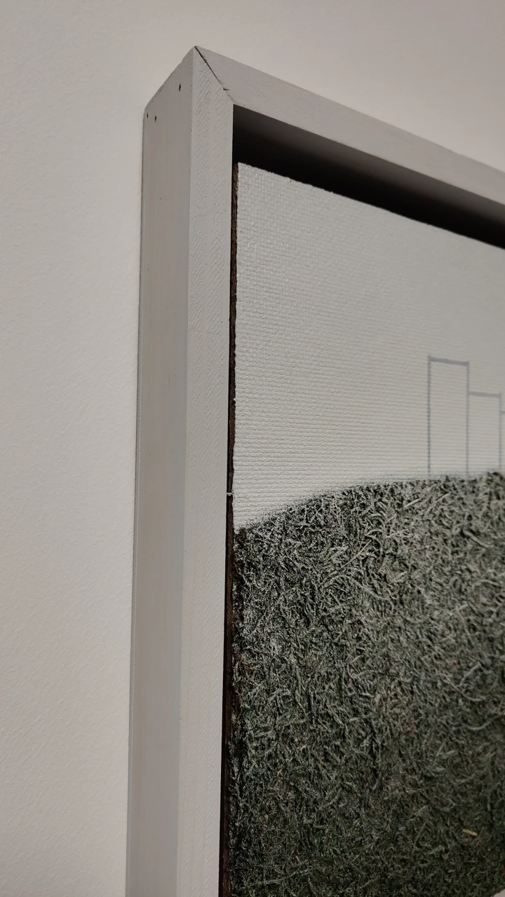 Работа выполнена на оргалите в смешанной технике с использованием натурального стабилизированного мха, акрила, аэрозоли. С помощью этой техники усиливается камерность работы, позволяя зрителю глубже погрузиться в личные переживания и воспоминания. Работа оформлена в раму канвас, между краями работы и рамой остается свободное пространство, работа как бы парит в воздухе - ещё одно напоминание об эфемерности памяти.