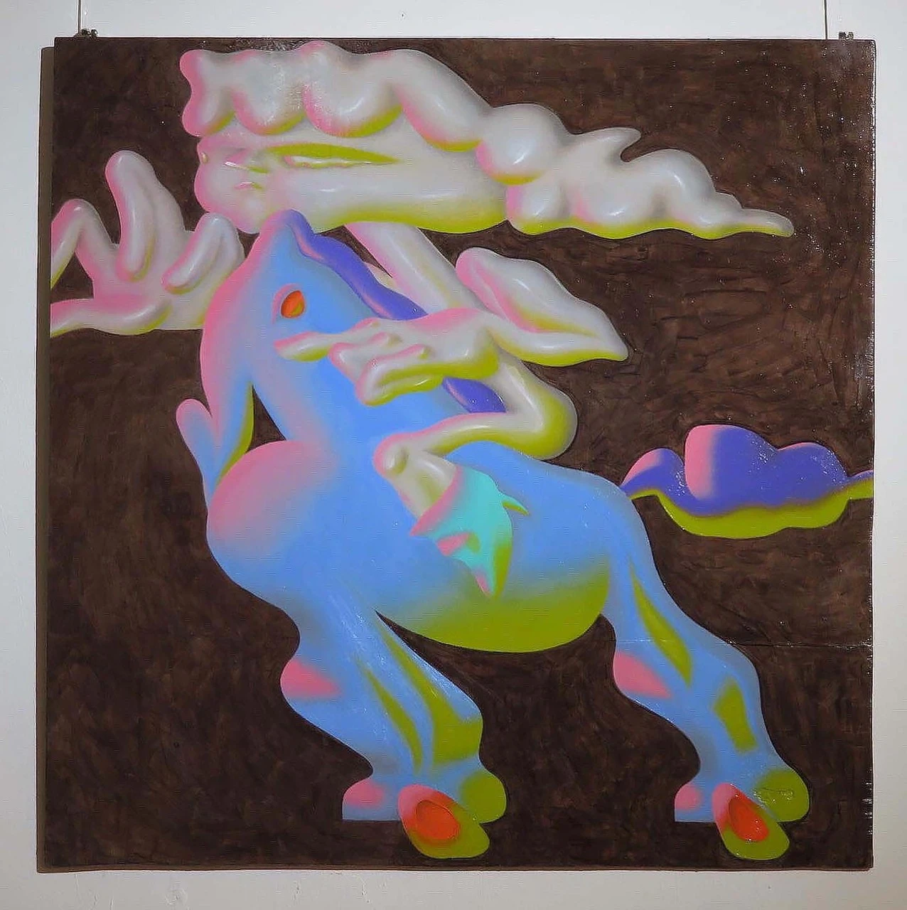 Масляная живопись в технике лессировки, выполненная на загрунтованном дереве, покрыта лаком. На задней части находятся крючки для закрепления работы на стене.