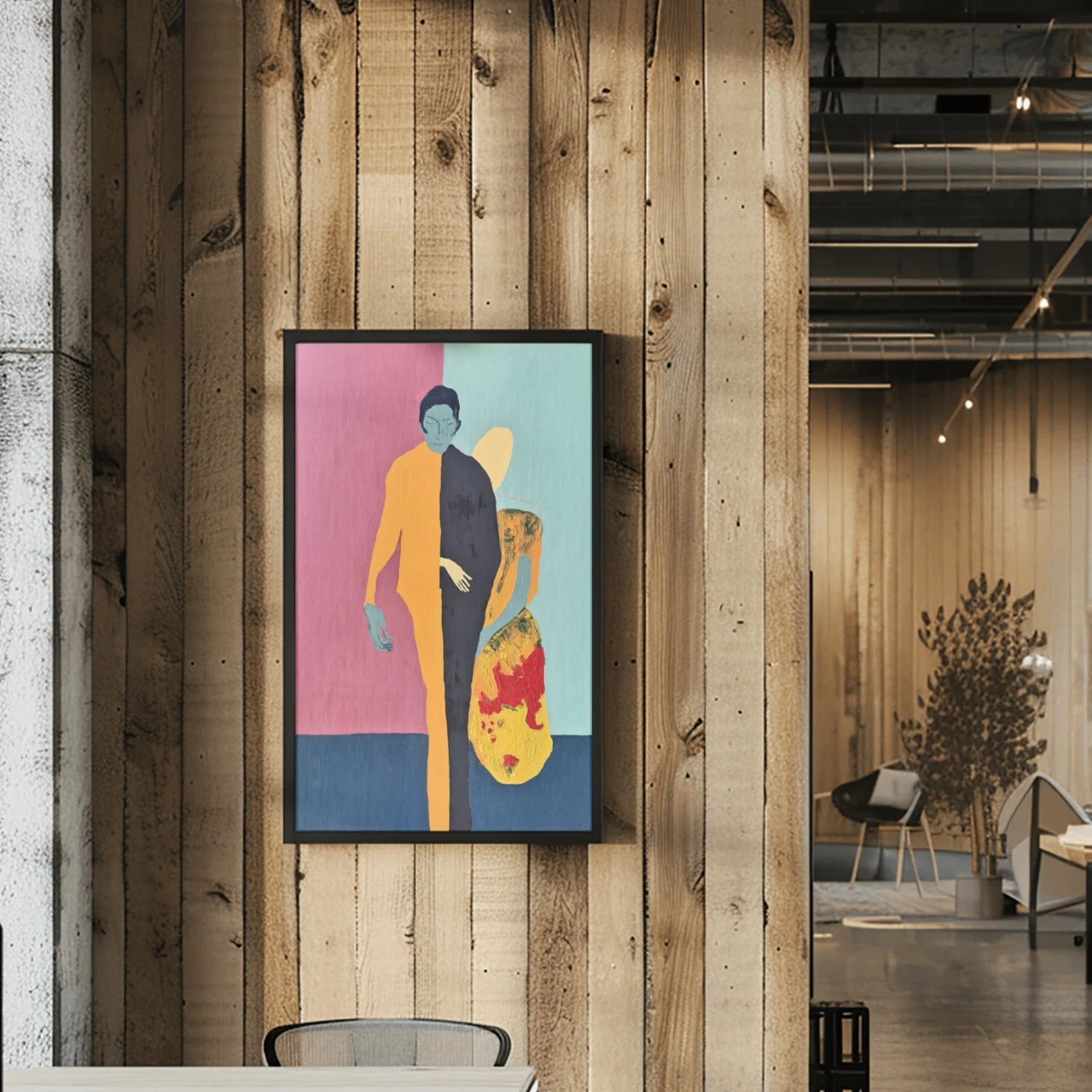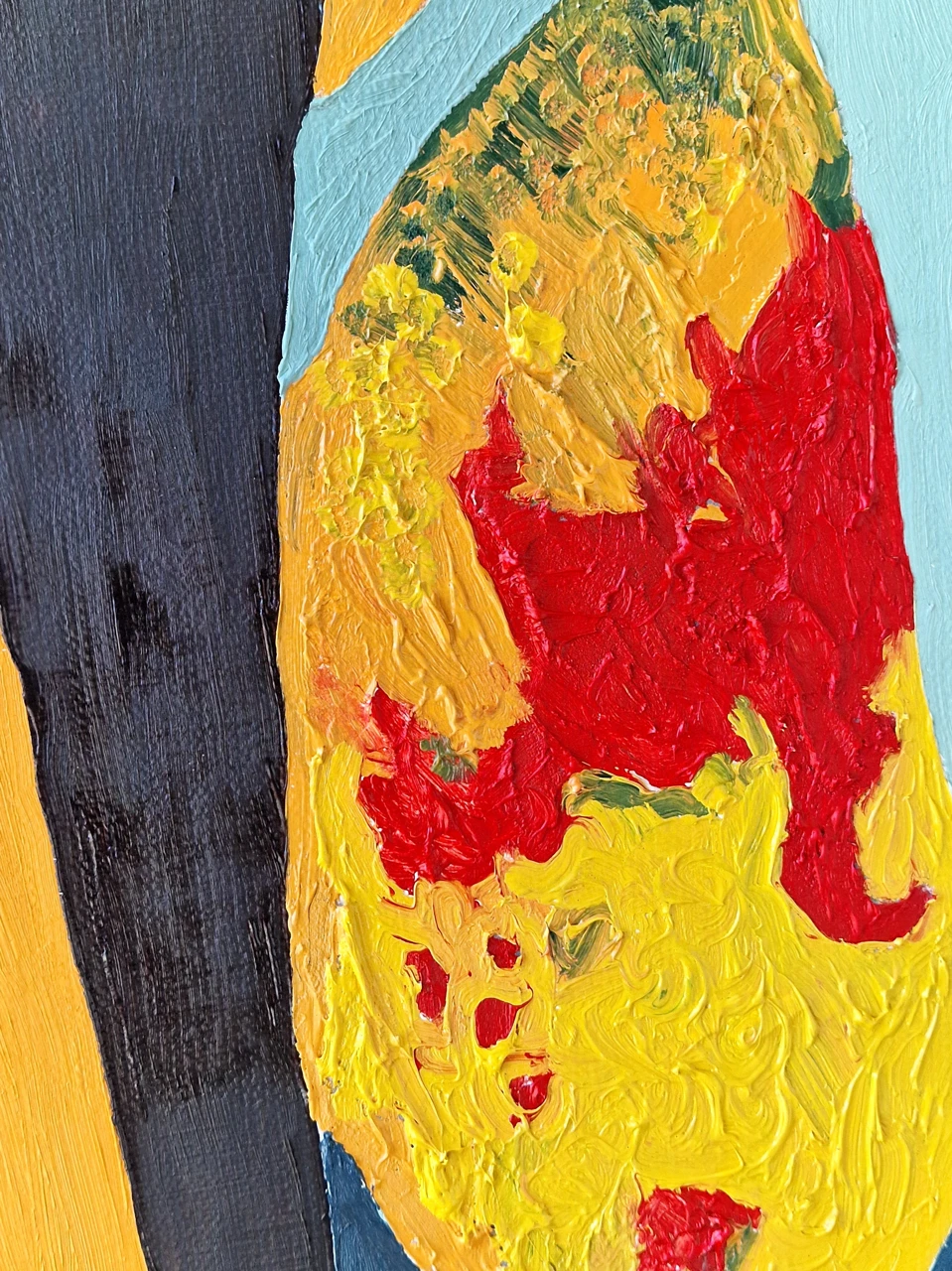 Розовое и прохладное мятное поля делят пространство на две части; насышенная пастозная техника с желтыми и красными акцентами создает напряжение и ощущение тепла. Картина о единстве противоположностей: разные части личности не противоречат друг другу, а поддерживают друг друга.